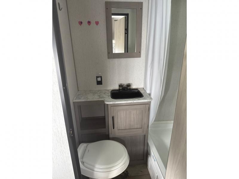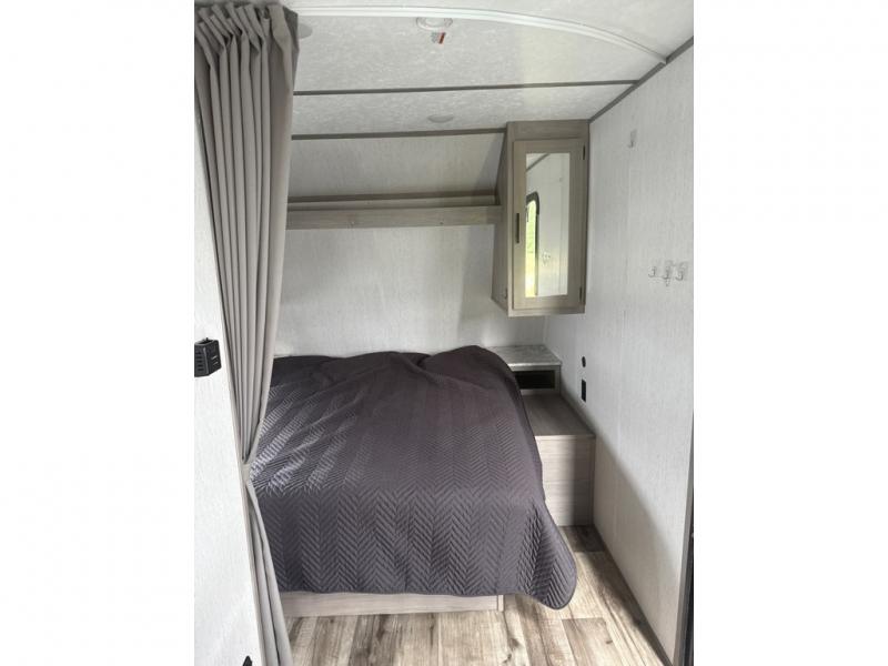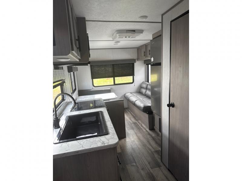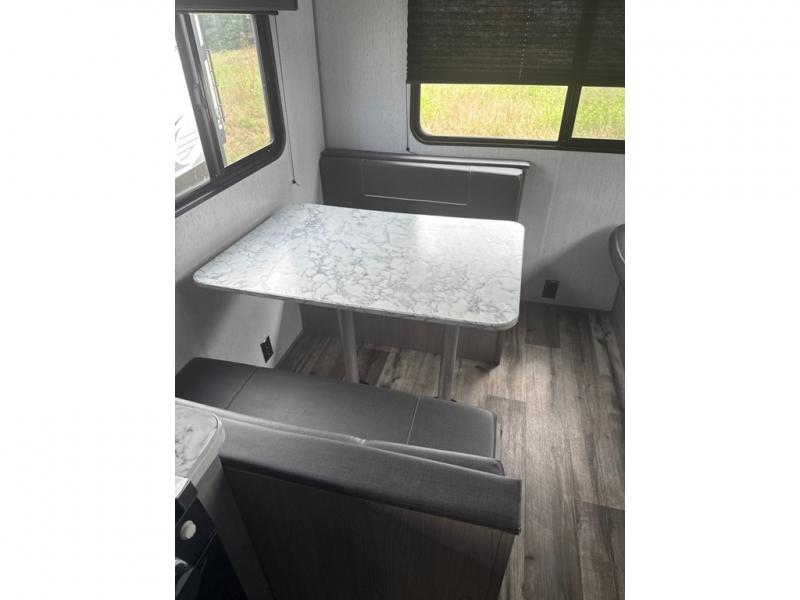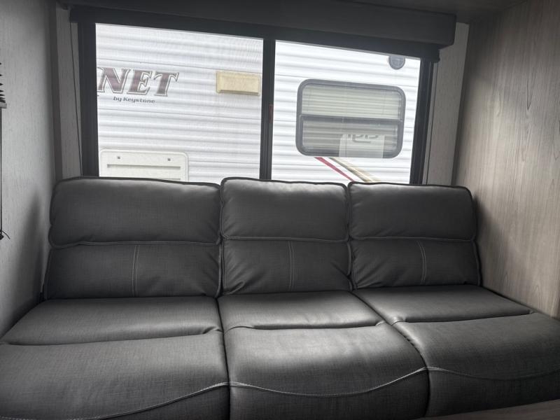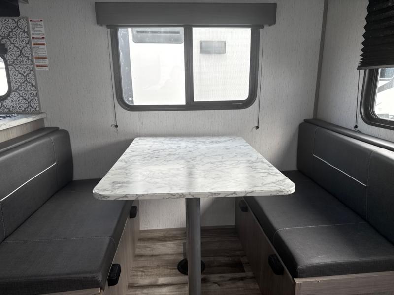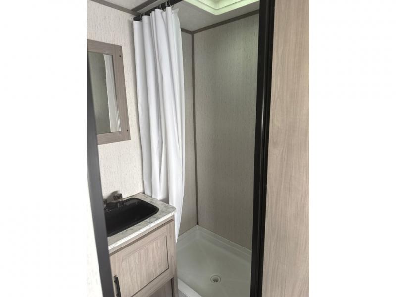 Your tent-camping days are over with this travel trailer in tow! Once you arrive at your destination, grab your fishing poles from the pass-through storage and head down to the lake. The full bath will allow you to freshen up when you return, plus there is a bath skylight for added standing space. The chef of your group can prepare dinner on the cooktop or oven, and perishables can be stored in the 10 cu. ft. refrigerator. There is a booth dinette where you can dine at, and a reclining sofa for extra seating space. You will love having your own queen bed up front with dual wardrobes on either side, and your guests can sleep on the furniture in the back!