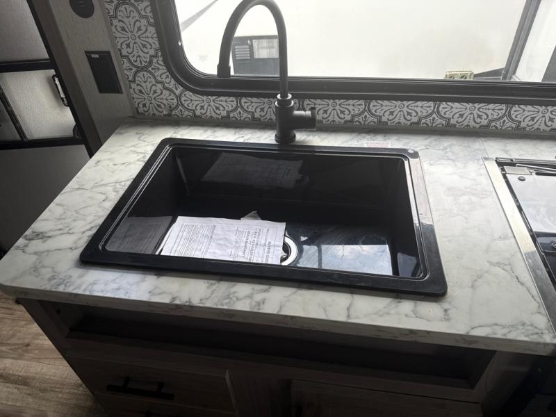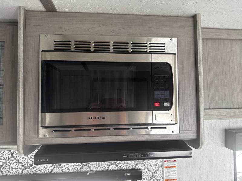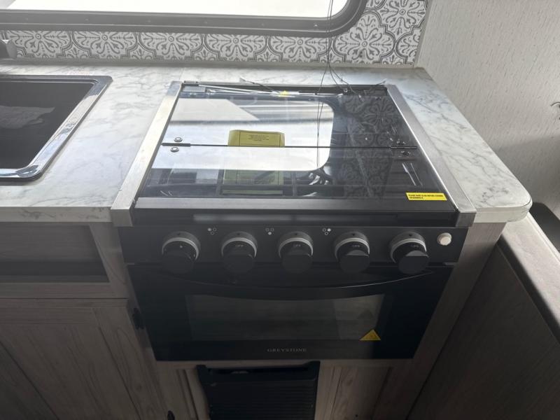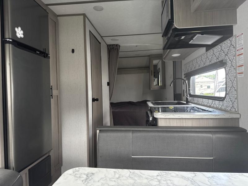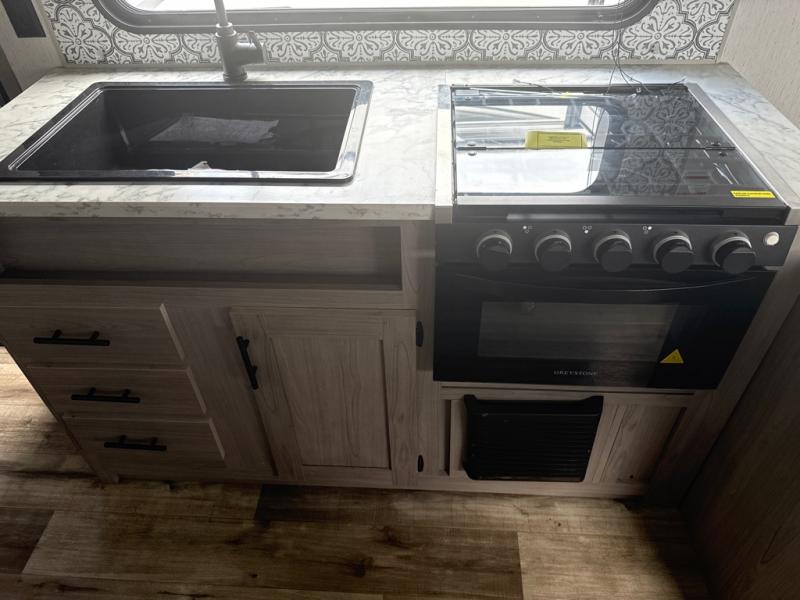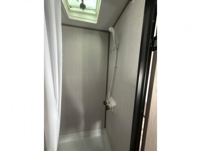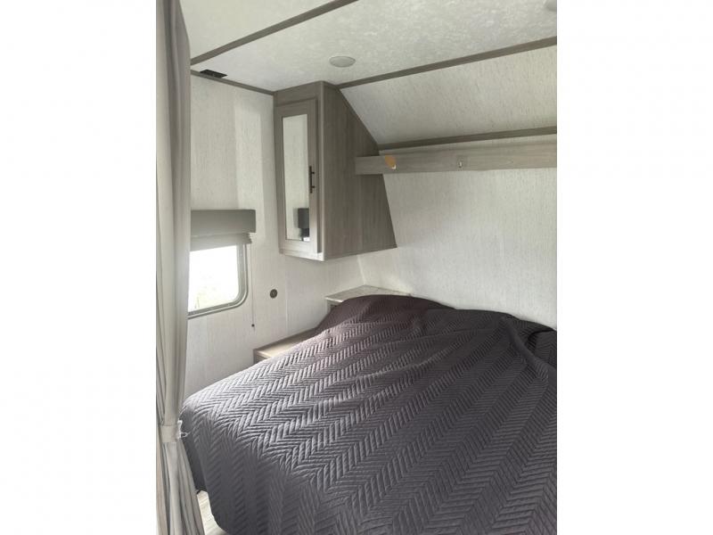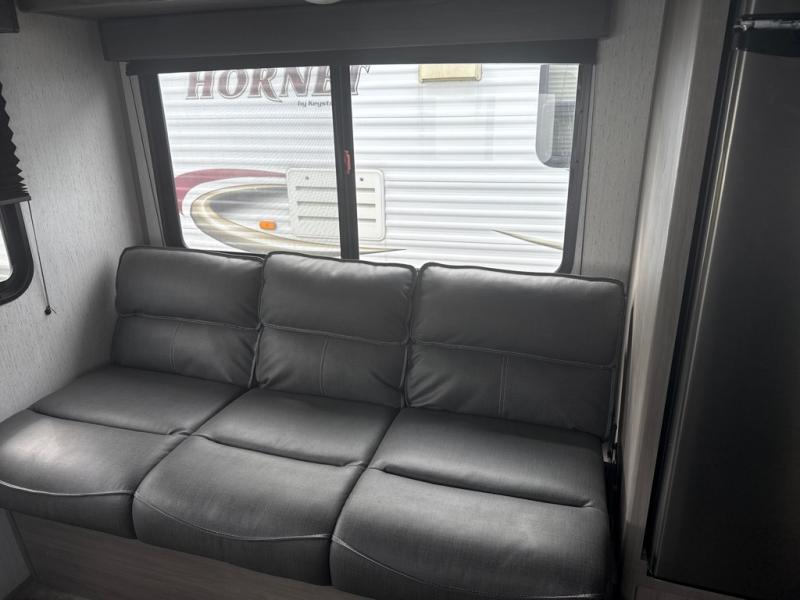 Your tent-camping days are over with this travel trailer in tow! Once you arrive at your destination, grab your fishing poles from the pass-through storage and head down to the lake. The full bath will allow you to freshen up when you return, plus there is a bath skylight for added standing space. The chef of your group can prepare dinner on the cooktop or oven, and perishables can be stored in the 10 cu. ft. refrigerator. There is a booth dinette where you can dine at, and a reclining sofa for extra seating space. You will love having your own queen bed up front with dual wardrobes on either side, and your guests can sleep on the furniture in the back!