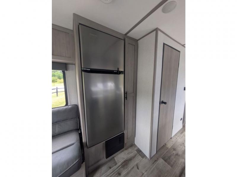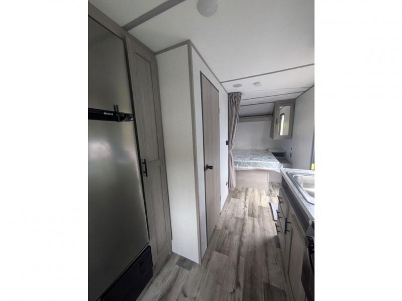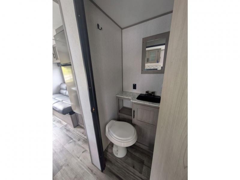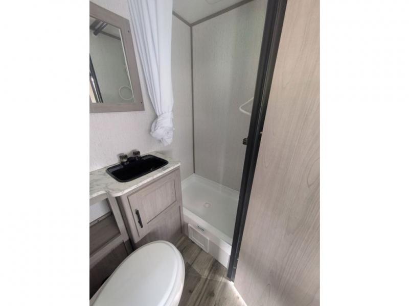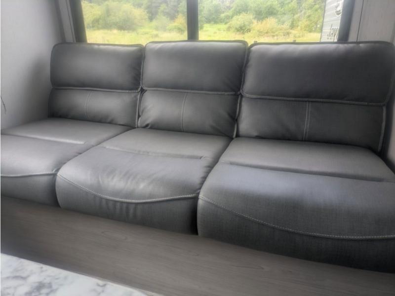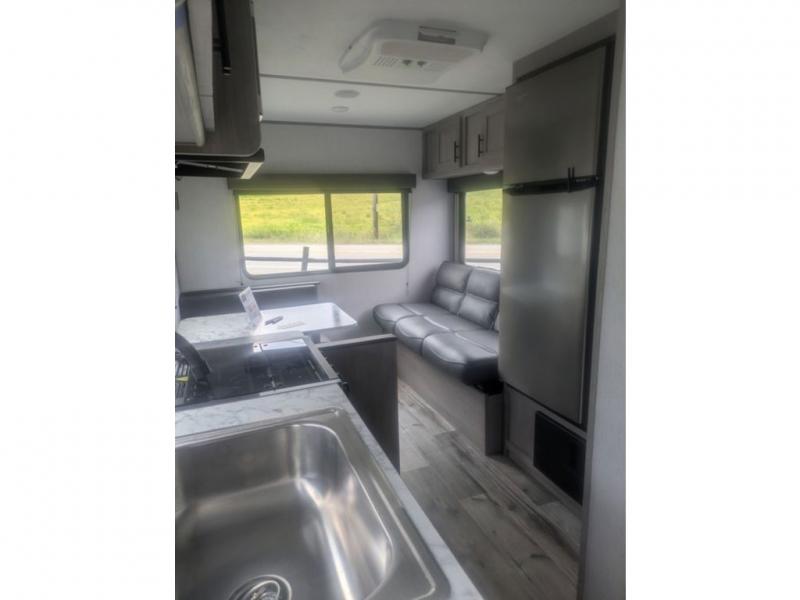 Your tent-camping days are over with this travel trailer in tow! Once you arrive at your destination, grab your fishing poles from the pass-through storage and head down to the lake. The full bath will allow you to freshen up when you return, plus there is a bath skylight for added standing space. The chef of your group can prepare dinner on the cooktop or oven, and perishables can be stored in the 10 cu. ft. refrigerator. There is a booth dinette where you can dine at, and a reclining sofa for extra seating space. You will love having your own queen bed up front with dual wardrobes on either side, and your guests can sleep on the furniture in the back!