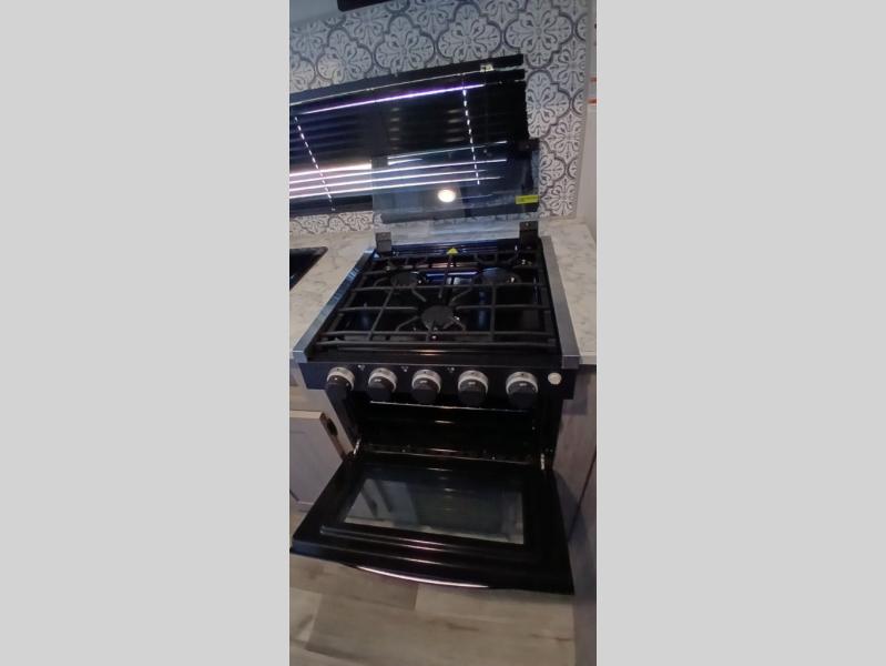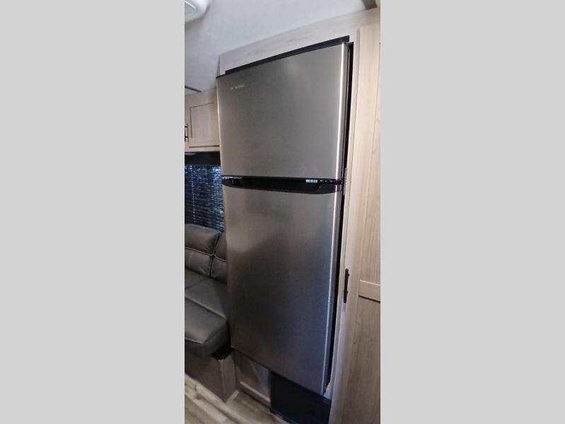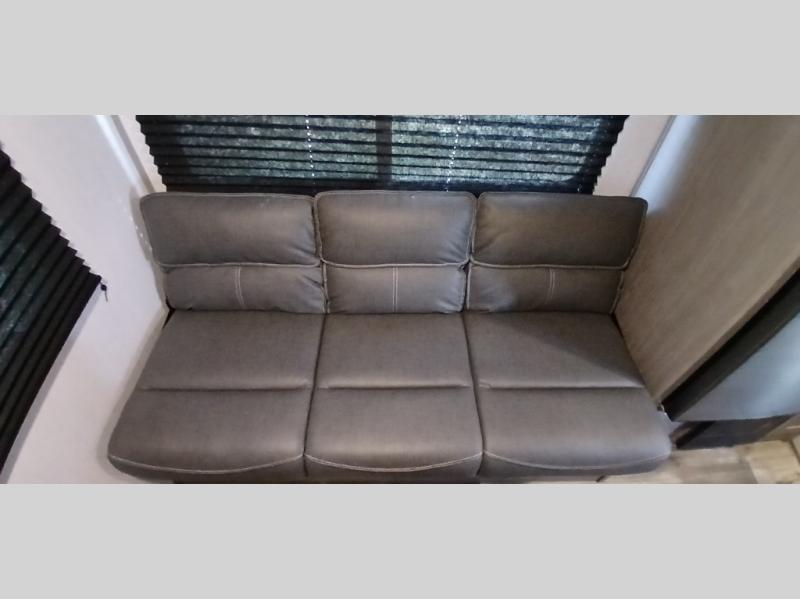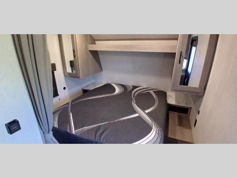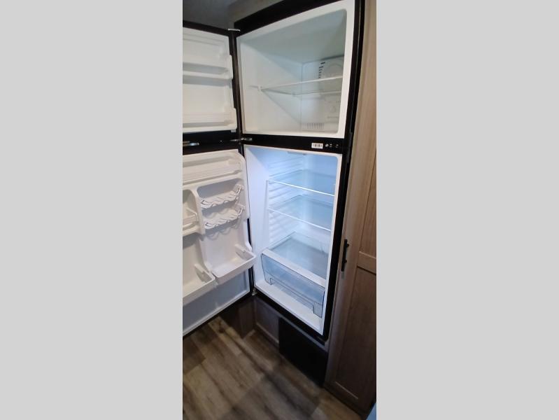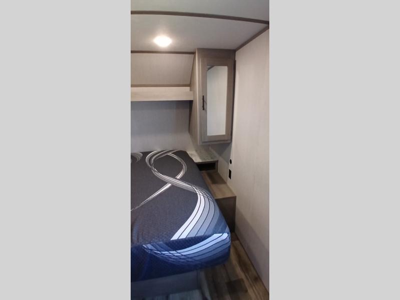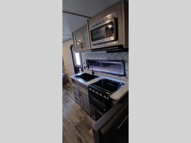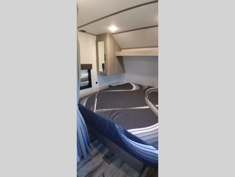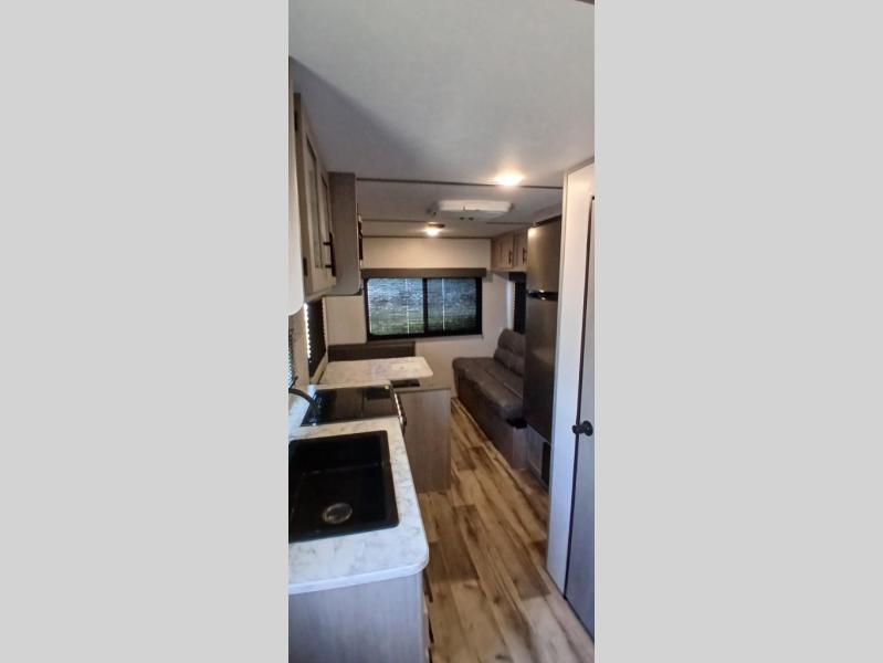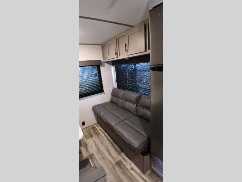 Your tent-camping days are over with this travel trailer in tow! Once you arrive at your destination, grab your fishing poles from the pass-through storage and head down to the lake. The full bath will allow you to freshen up when you return, plus there is a bath skylight for added standing space. The chef of your group can prepare dinner on the cooktop or oven, and perishables can be stored in the 10 cu. ft. refrigerator. There is a booth dinette where you can dine at, and a reclining sofa for extra seating space. You will love having your own queen bed up front with dual wardrobes on either side, and your guests can sleep on the furniture in the back!