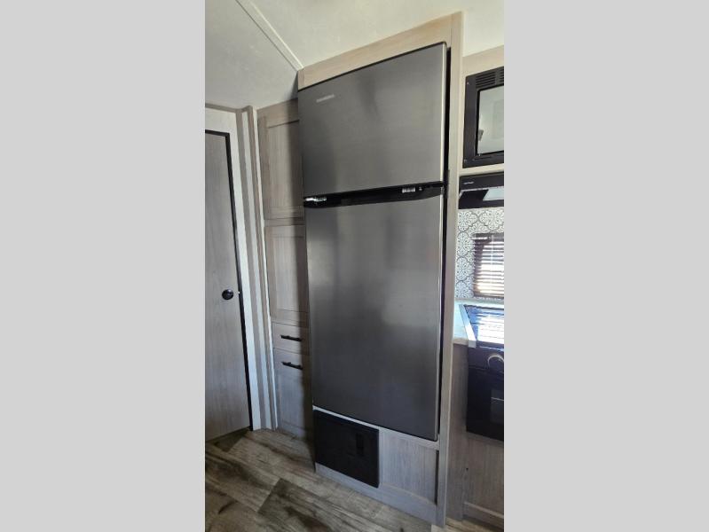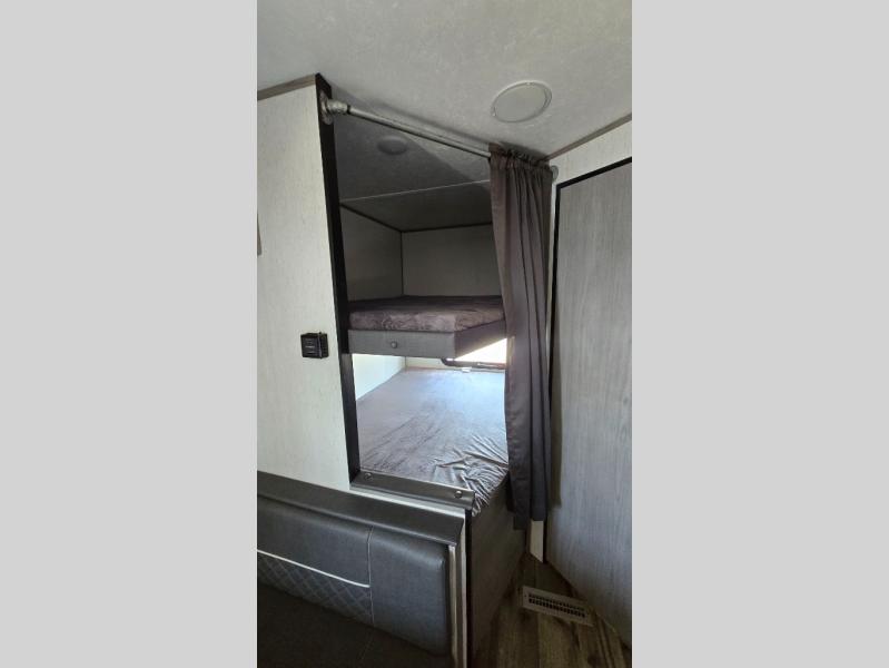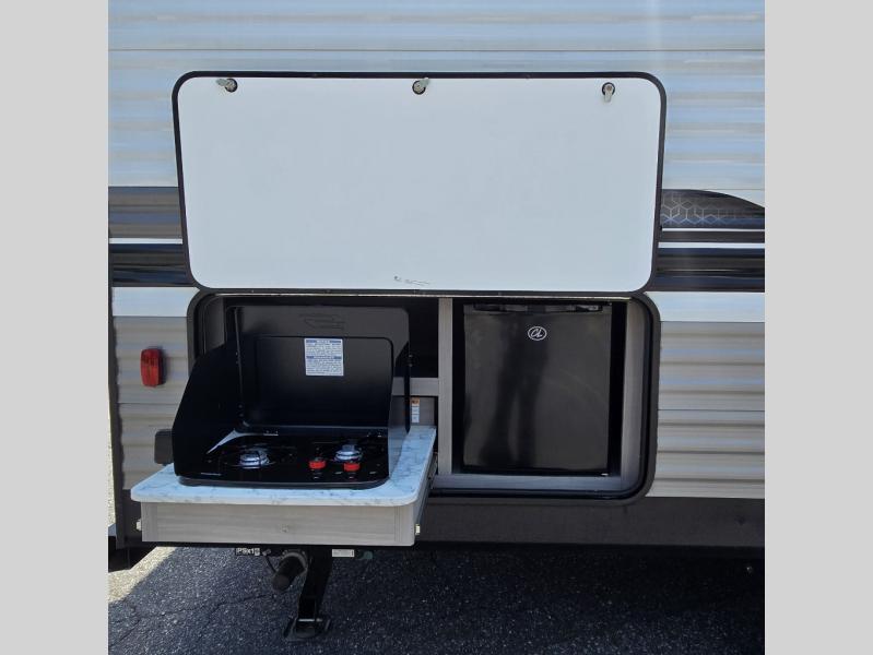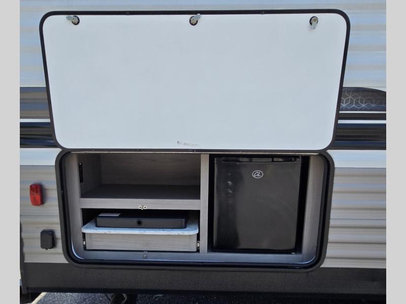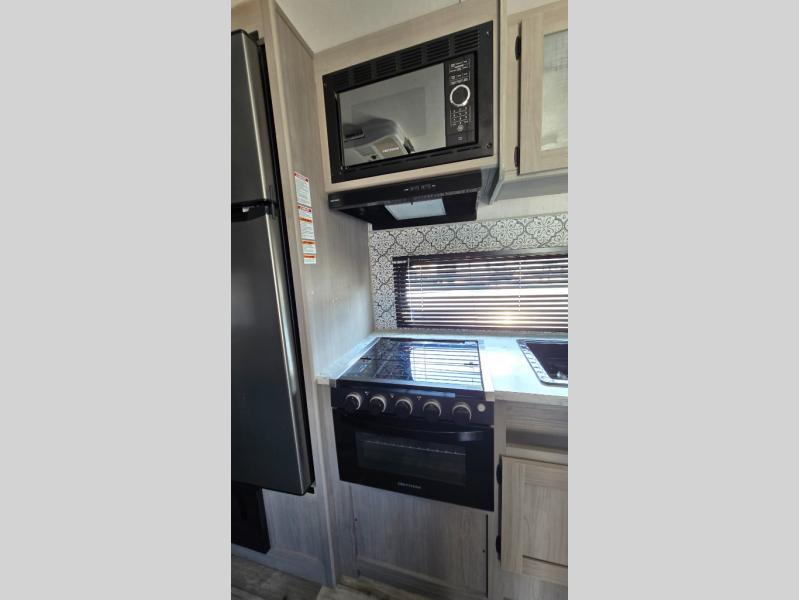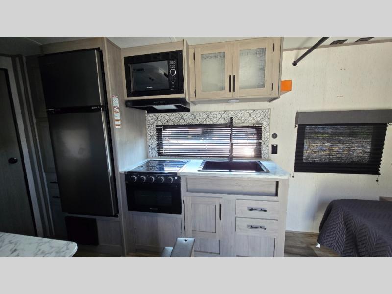 Escape the city life for weekends at the lake in this cozy travel trailer. Once you arrive at the campground, you can start lunch on the outdoor kitchen and relax under the power awning with LED lights. The little ones will love the bunk beds, and you'll have a queen bed up front. This model includes a full kitchen with an oven, a 10 cu. ft. refrigerator, and a microwave oven, plus there is a booth dinette where you can dine together.