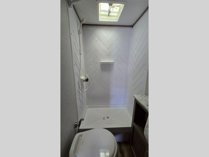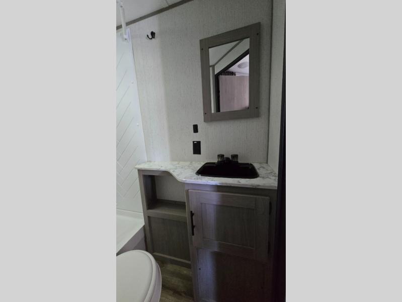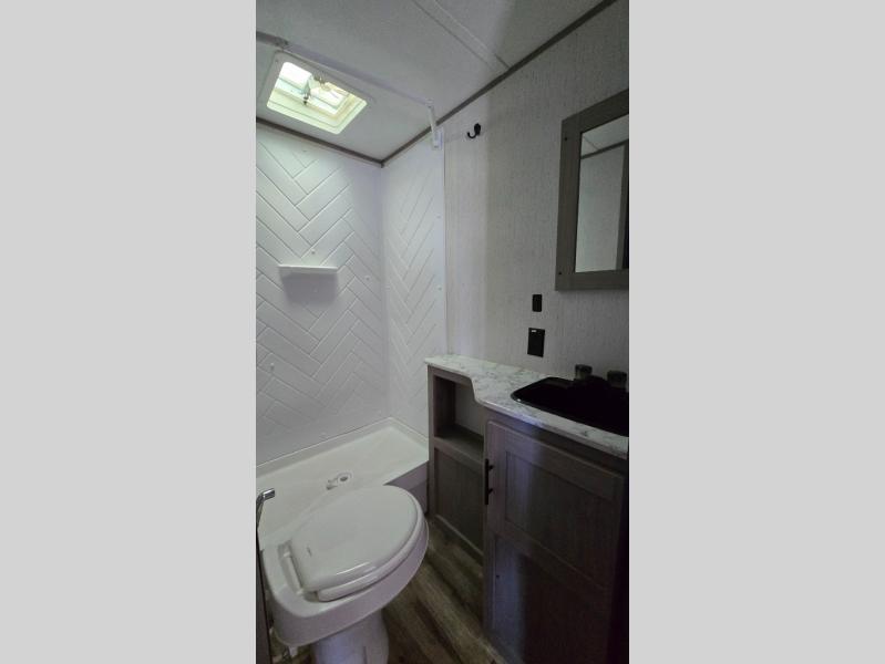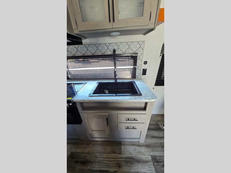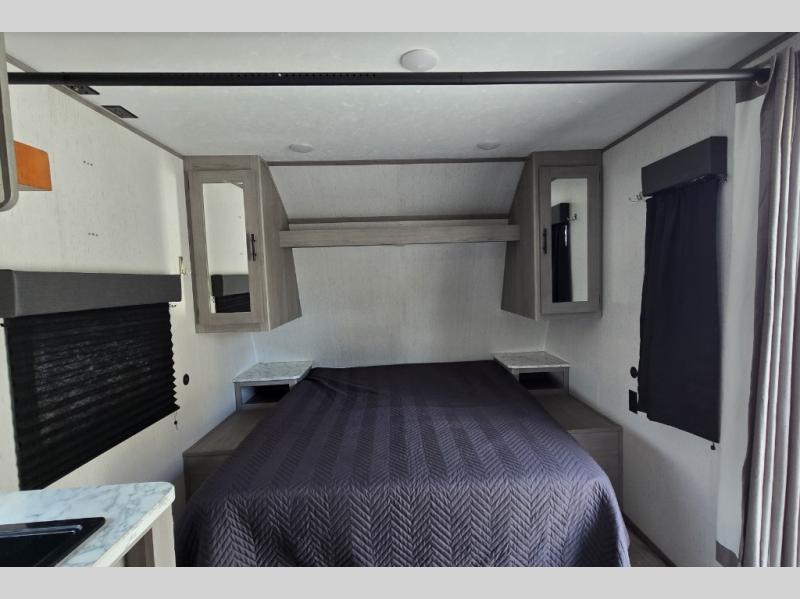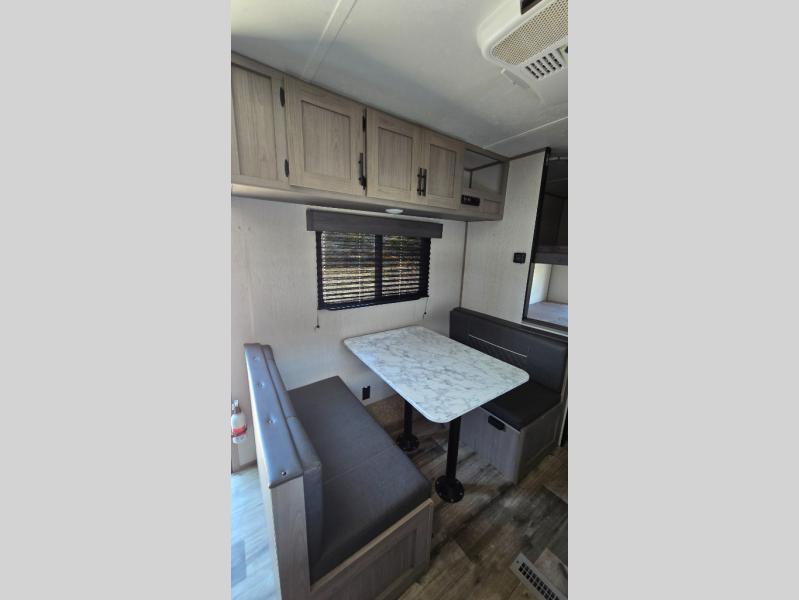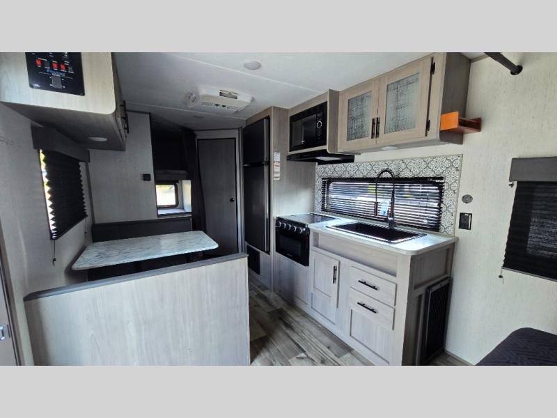 Escape the city life for weekends at the lake in this cozy travel trailer. Once you arrive at the campground, you can start lunch on the outdoor kitchen and relax under the power awning with LED lights. The little ones will love the bunk beds, and you'll have a queen bed up front. This model includes a full kitchen with an oven, a 10 cu. ft. refrigerator, and a microwave oven, plus there is a booth dinette where you can dine together.