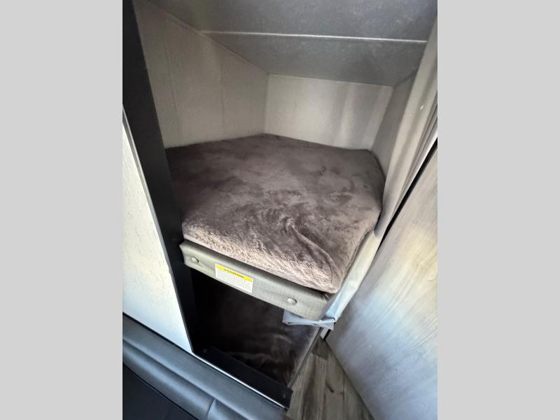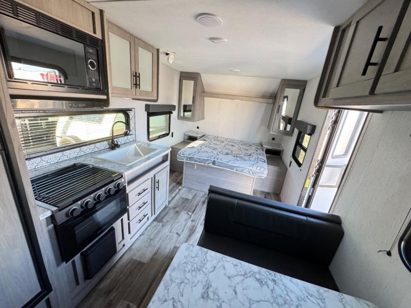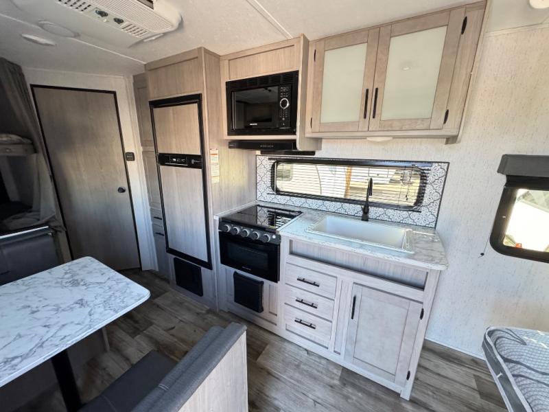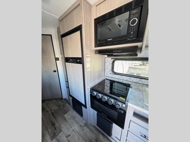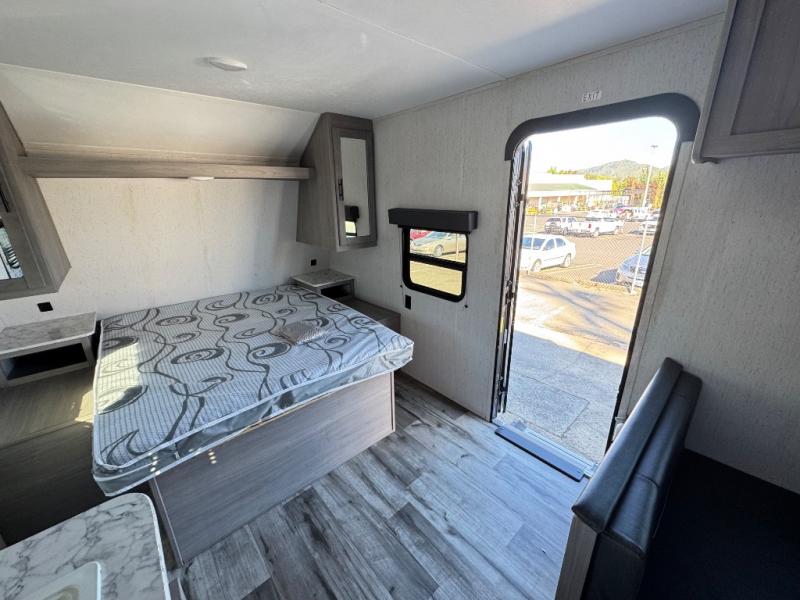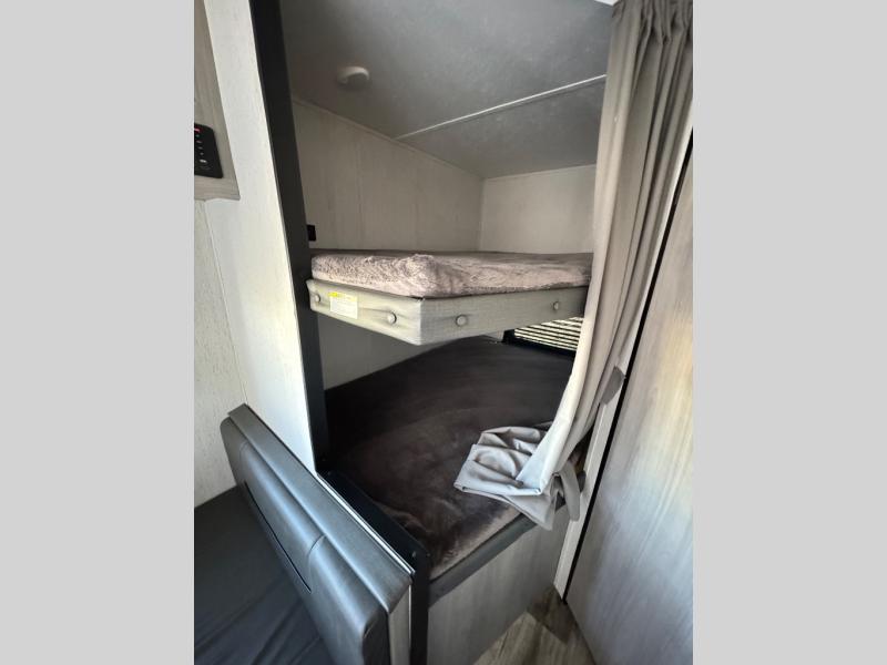 Escape the city life for weekends at the lake in this cozy travel trailer. Once you arrive at the campground, you can start lunch on the outdoor kitchen and relax under the power awning with LED lights. The little ones will love the bunk beds, and you'll have a queen bed up front. This model includes a full kitchen with an oven, a 10 cu. ft. refrigerator, and a microwave oven, plus there is a booth dinette where you can dine together.