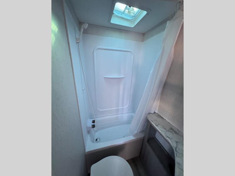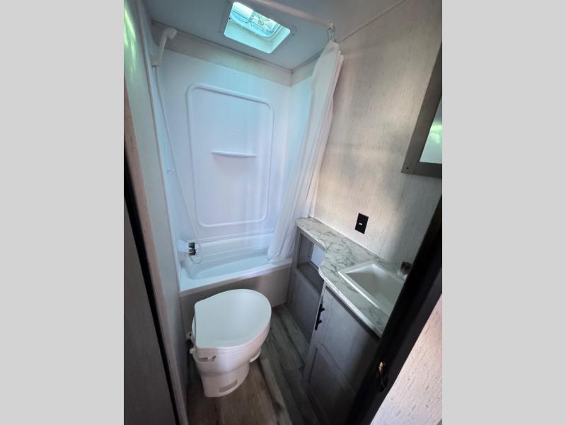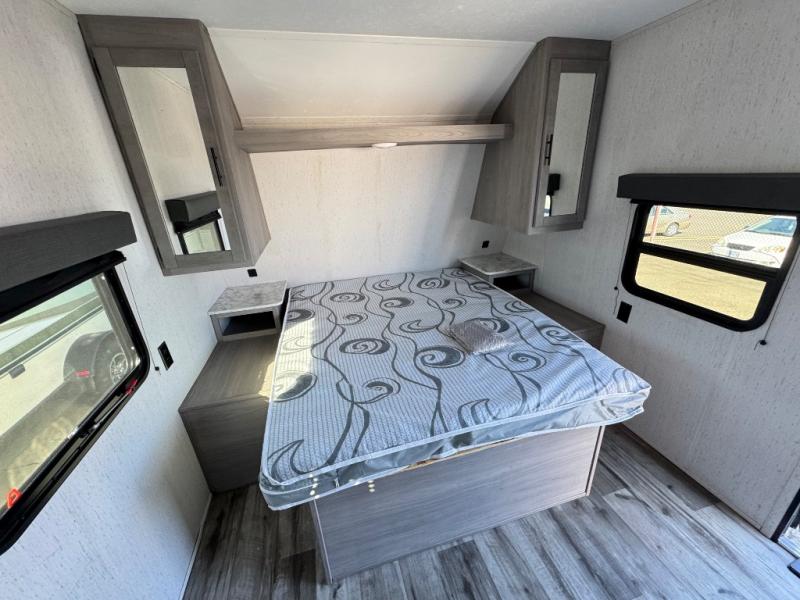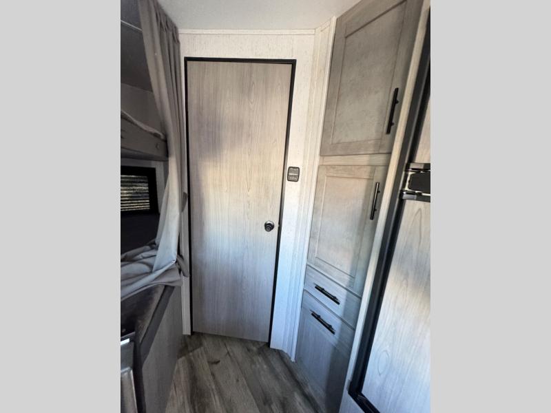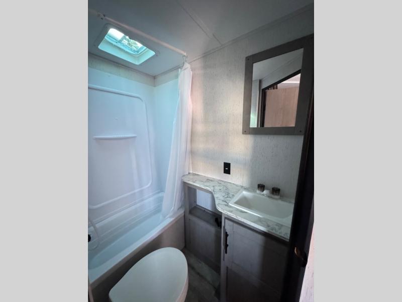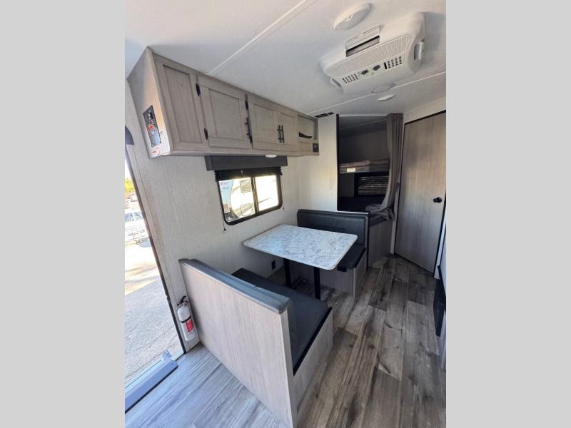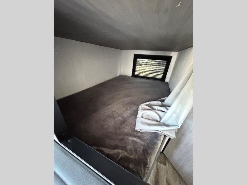 Escape the city life for weekends at the lake in this cozy travel trailer. Once you arrive at the campground, you can start lunch on the outdoor kitchen and relax under the power awning with LED lights. The little ones will love the bunk beds, and you'll have a queen bed up front. This model includes a full kitchen with an oven, a 10 cu. ft. refrigerator, and a microwave oven, plus there is a booth dinette where you can dine together.
