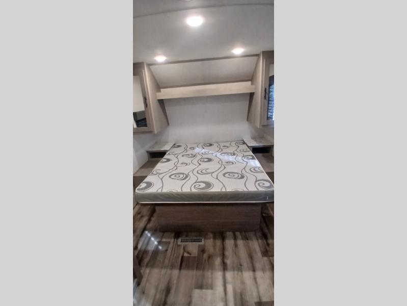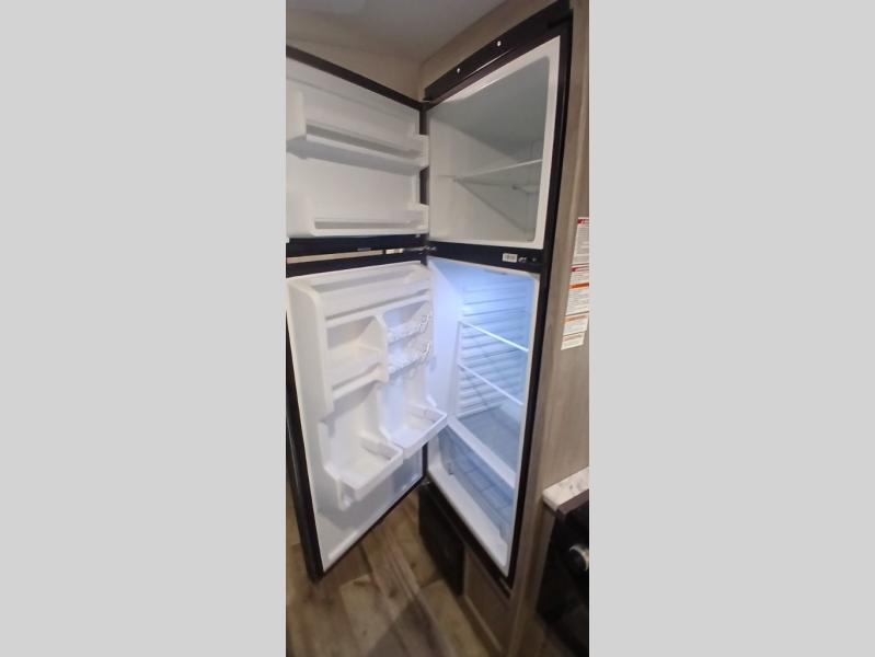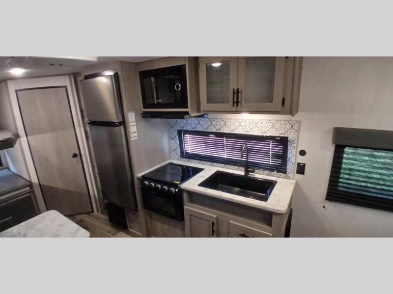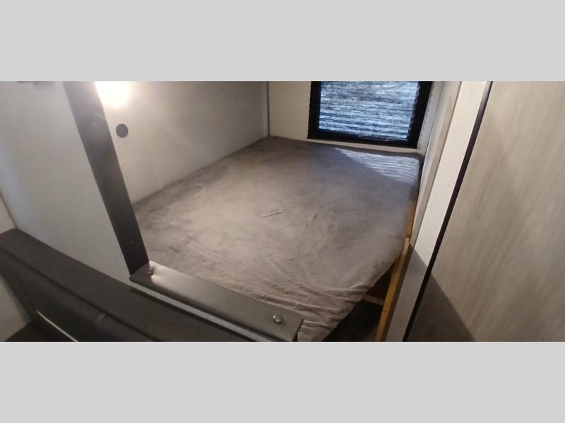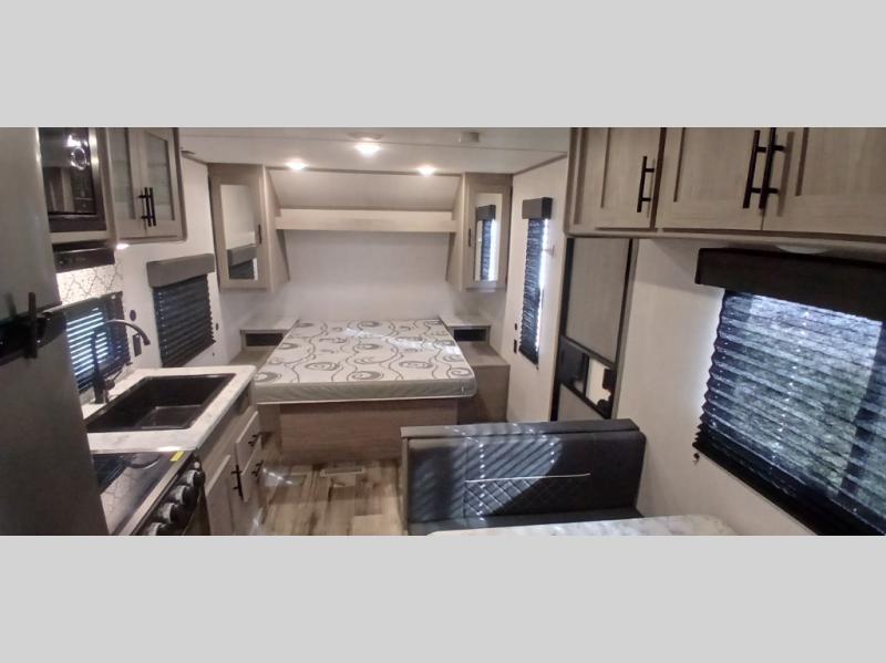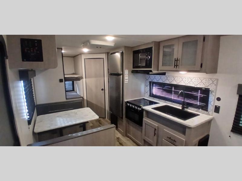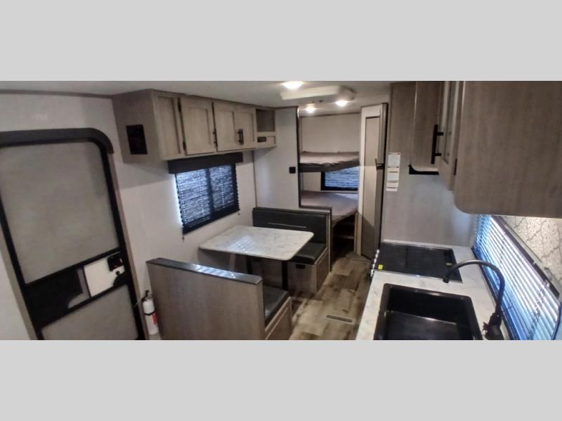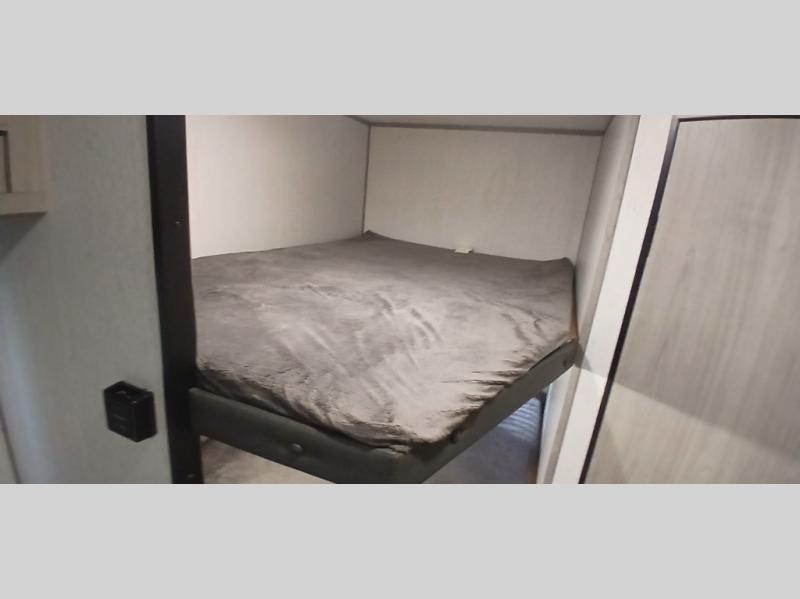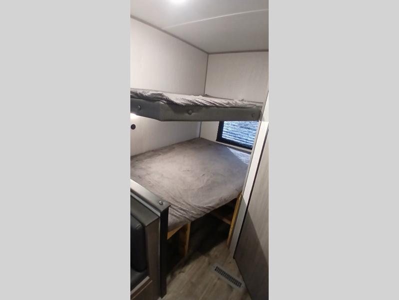 Escape the city life for weekends at the lake in this cozy travel trailer. Once you arrive at the campground, you can start lunch on the outdoor kitchen and relax under the power awning with LED lights. The little ones will love the bunk beds, and you'll have a queen bed up front. This model includes a full kitchen with an oven, a 10 cu. ft. refrigerator, and a microwave oven, plus there is a booth dinette where you can dine together.