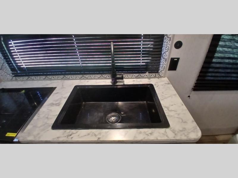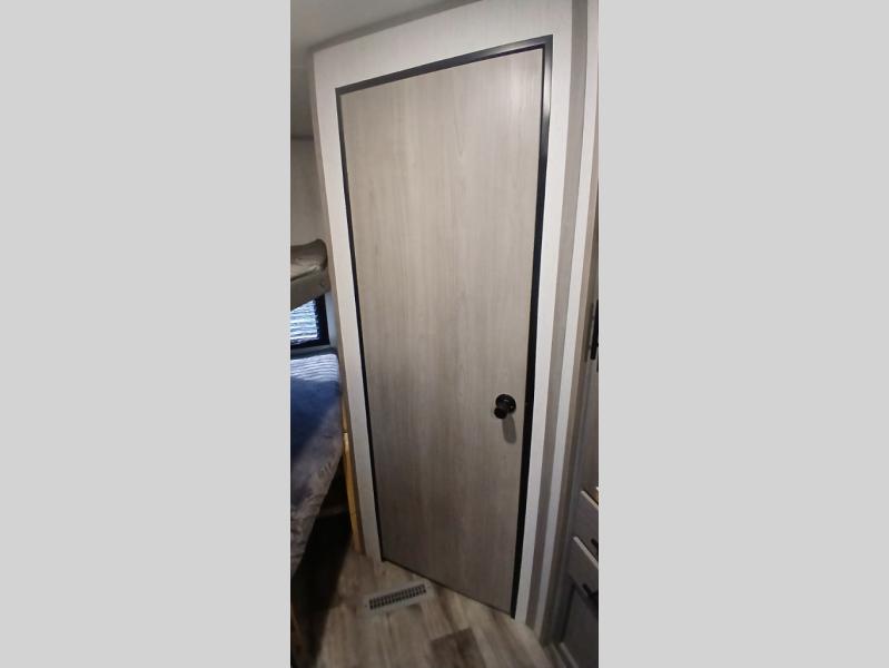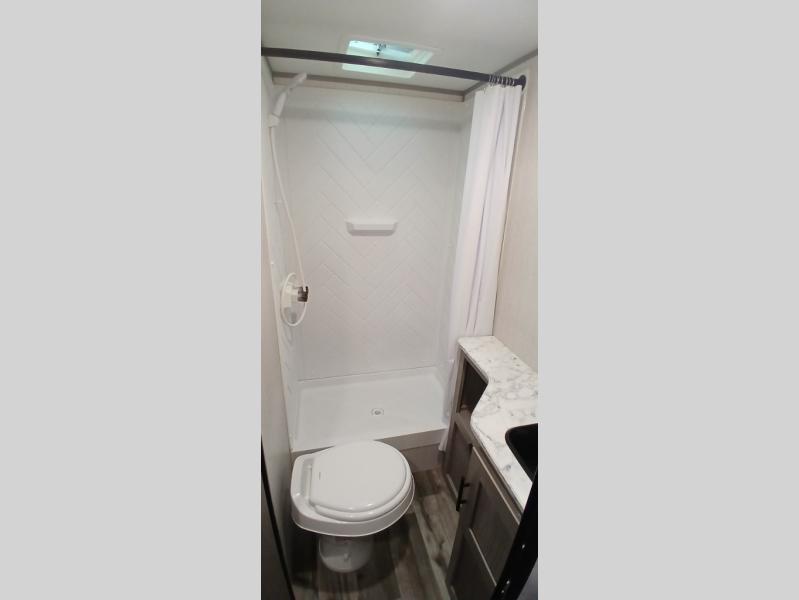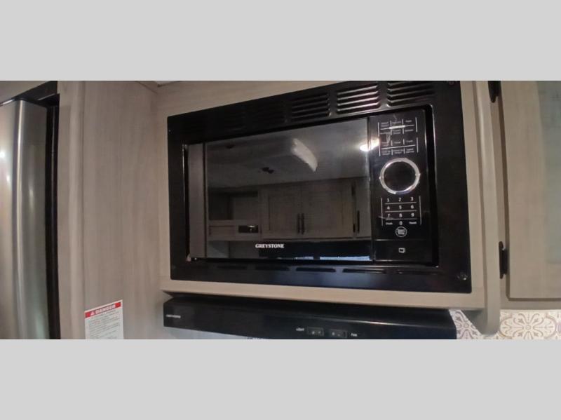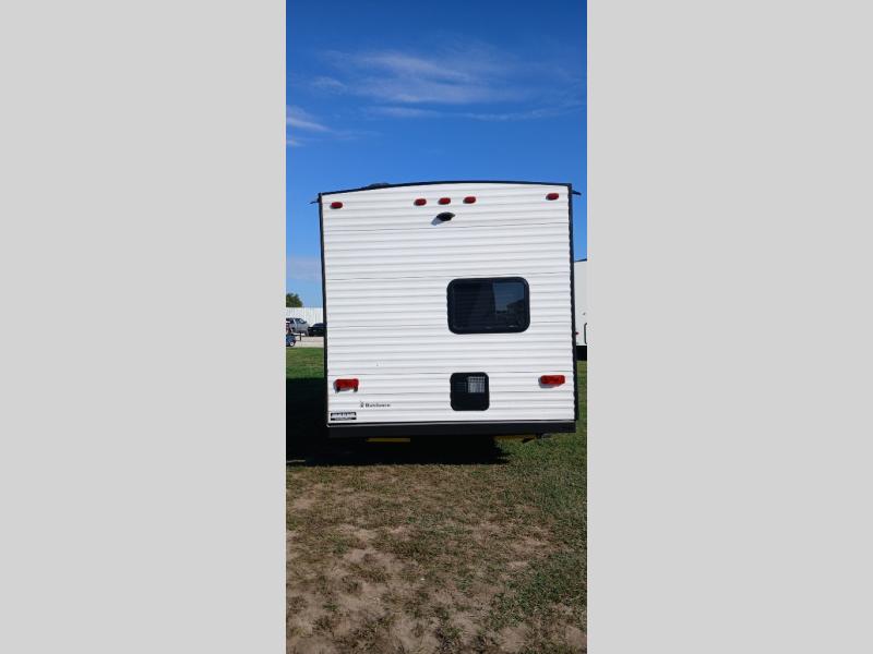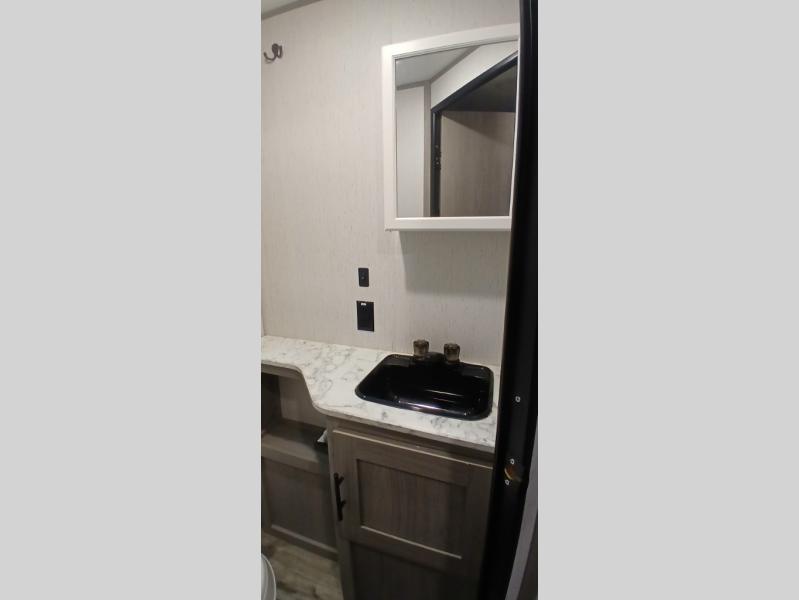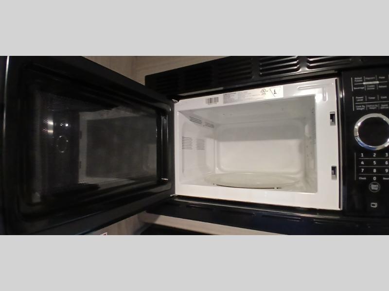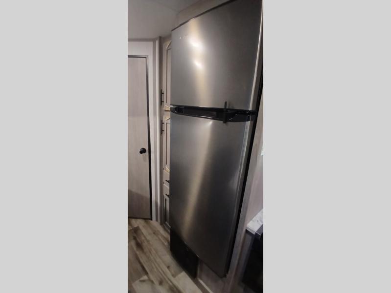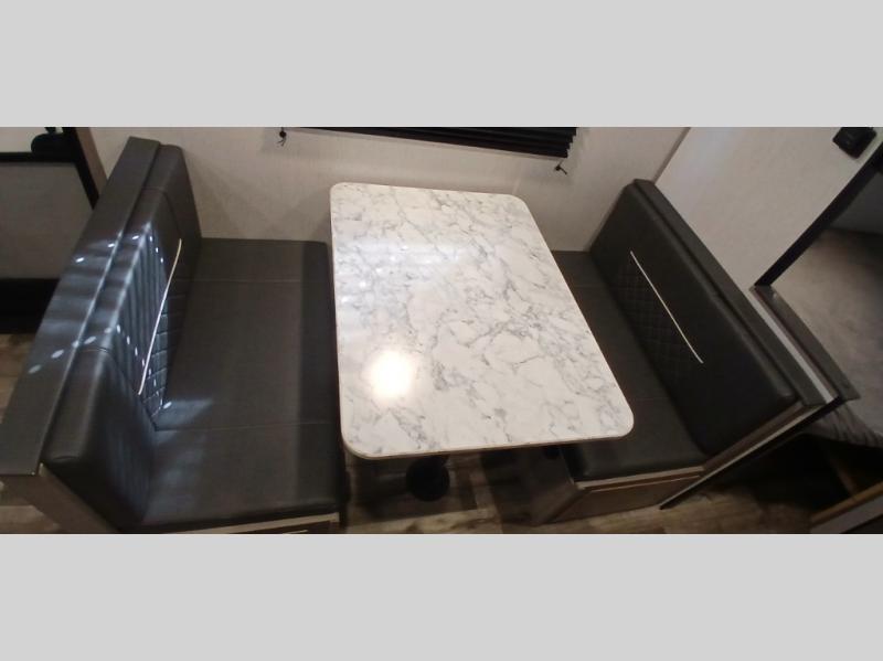 Escape the city life for weekends at the lake in this cozy travel trailer. Once you arrive at the campground, you can start lunch on the outdoor kitchen and relax under the power awning with LED lights. The little ones will love the bunk beds, and you'll have a queen bed up front. This model includes a full kitchen with an oven, a 10 cu. ft. refrigerator, and a microwave oven, plus there is a booth dinette where you can dine together.