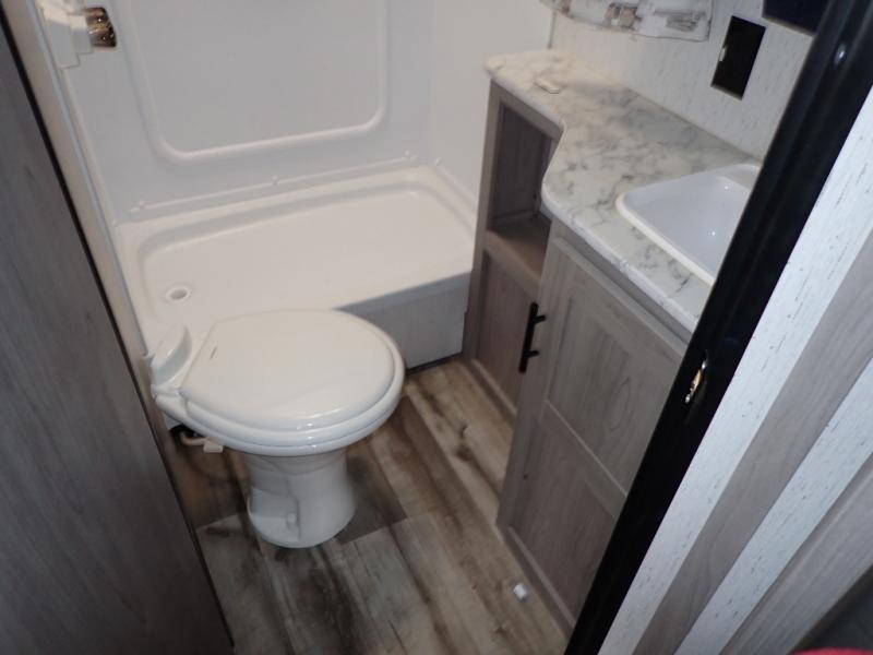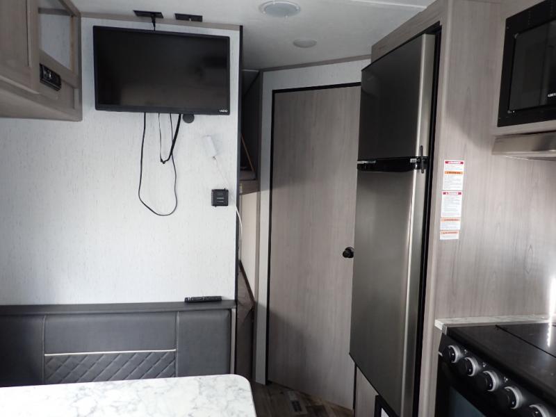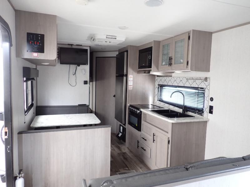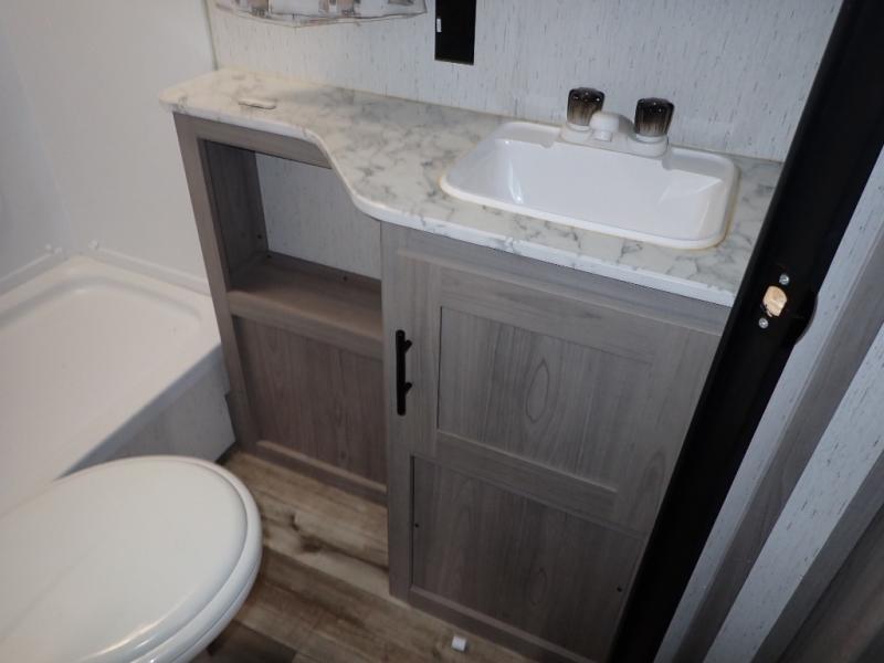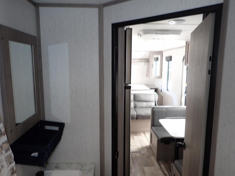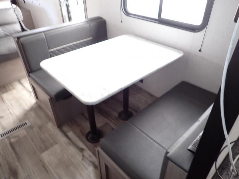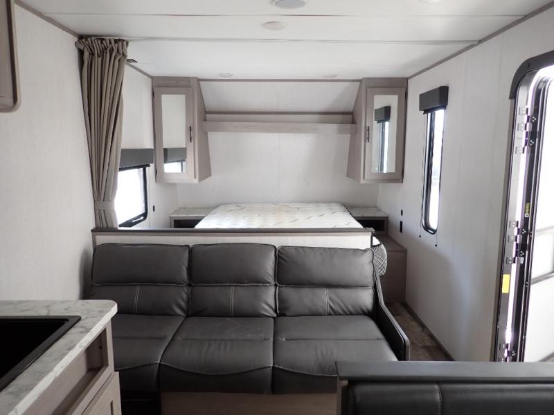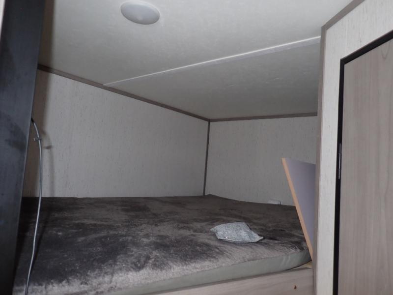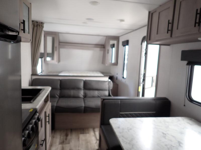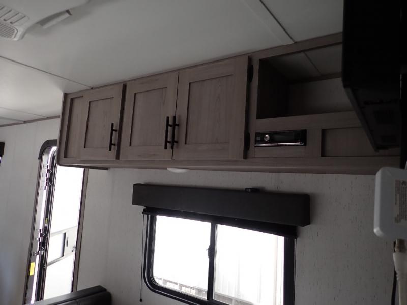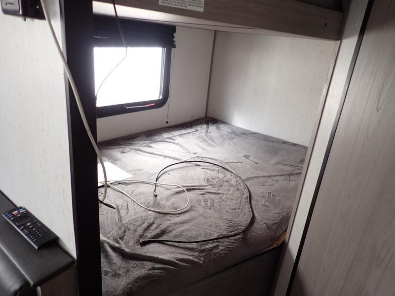 You can't go wrong with this travel trailer in tow! Whether you're relaxing under the 14' power awning, cooking in the full kitchen, or playing a game at the booth dinette, memories will be made. The double-size bunks provide more sleeping space, and the front bedroom will give you your own space to enjoy. This model also includes a full bath so you don't have to use the camp's facilities, and the bath fan will keep everything fresh. This model also incudes a 10 cu. ft. refrigerator, overhead compartments, and a pass-through storage for your larger camp gear!