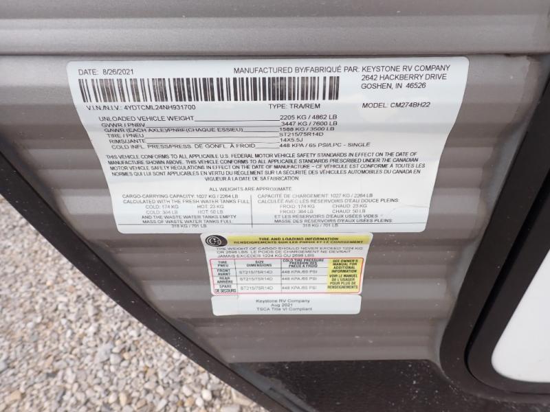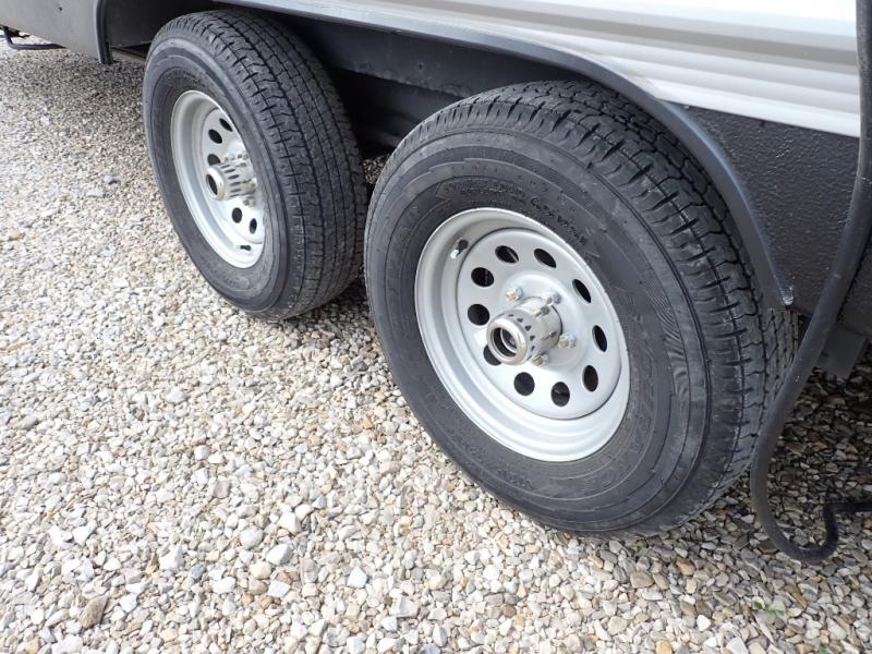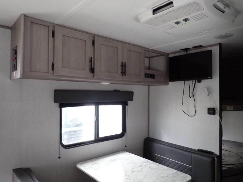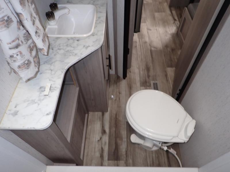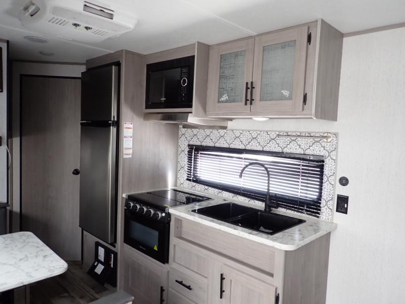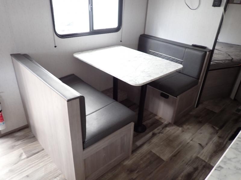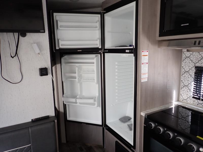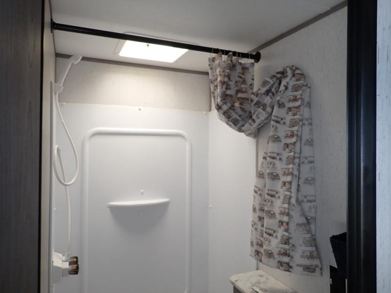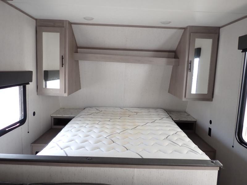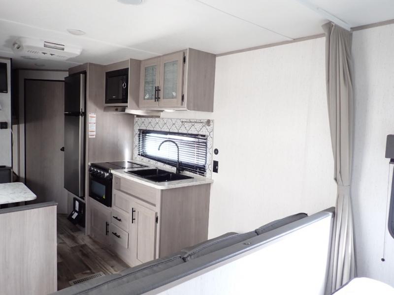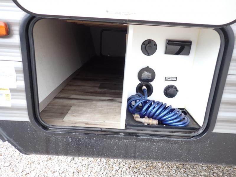 You can't go wrong with this travel trailer in tow! Whether you're relaxing under the 14' power awning, cooking in the full kitchen, or playing a game at the booth dinette, memories will be made. The double-size bunks provide more sleeping space, and the front bedroom will give you your own space to enjoy. This model also includes a full bath so you don't have to use the camp's facilities, and the bath fan will keep everything fresh. This model also incudes a 10 cu. ft. refrigerator, overhead compartments, and a pass-through storage for your larger camp gear!