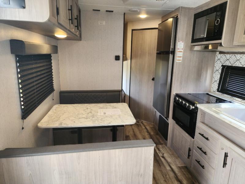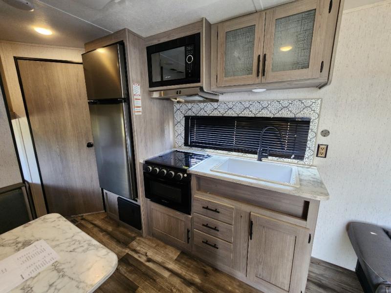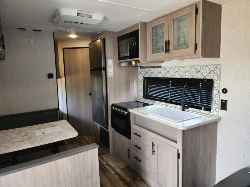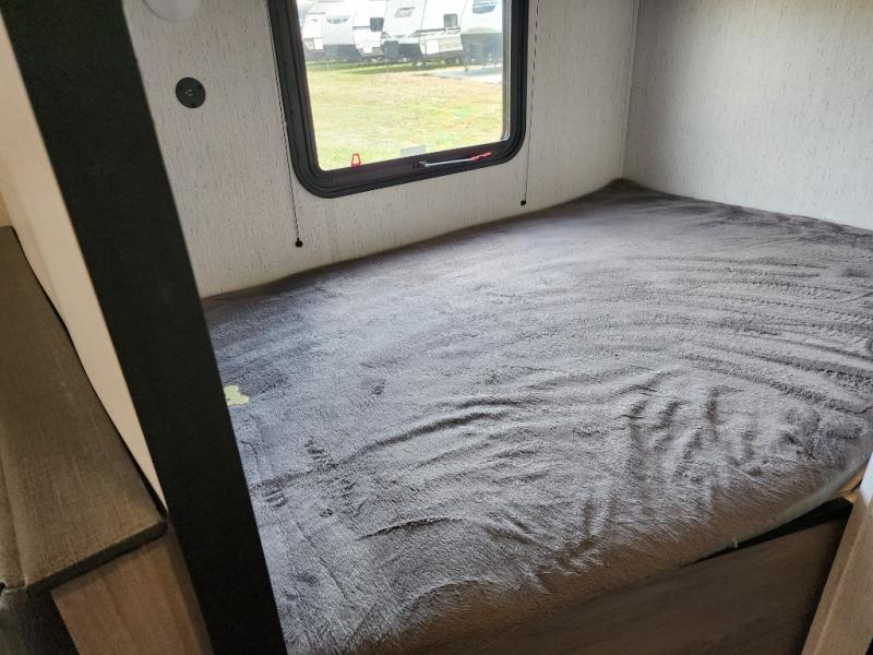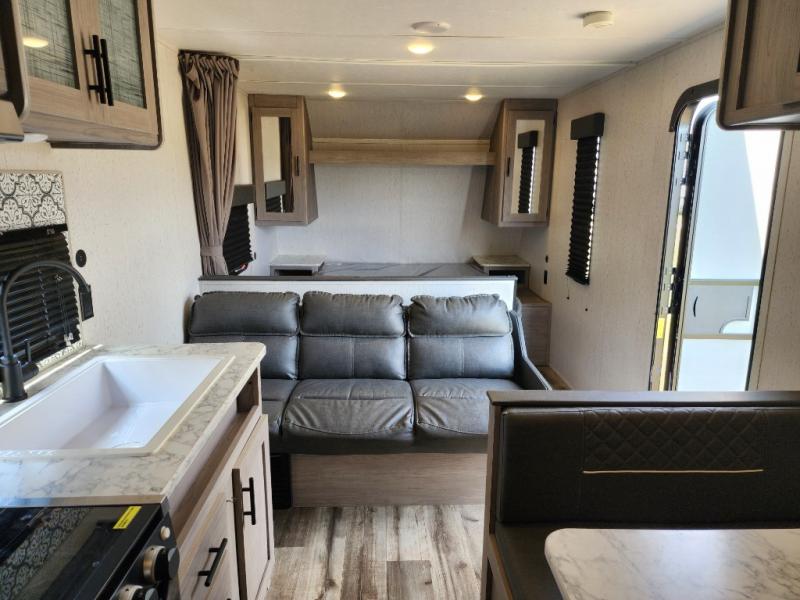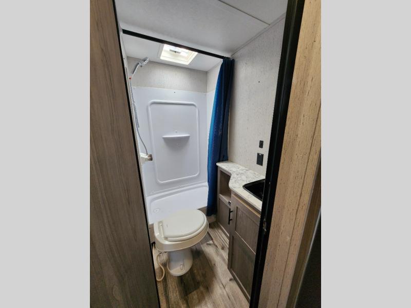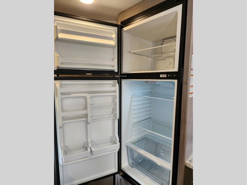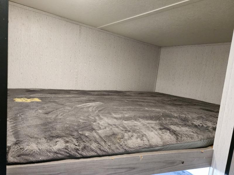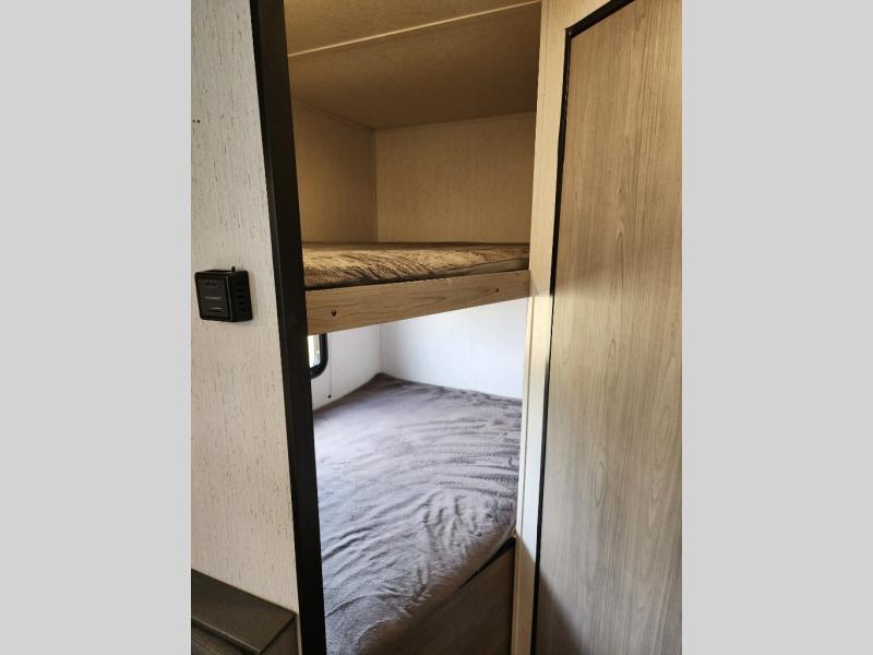 You can't go wrong with this travel trailer in tow! Whether you're relaxing under the 14' power awning, cooking in the full kitchen, or playing a game at the booth dinette, memories will be made. The double-size bunks provide more sleeping space, and the front bedroom will give you your own space to enjoy. This model also includes a full bath so you don't have to use the camp's facilities, and the bath fan will keep everything fresh. This model also incudes a 10 cu. ft. refrigerator, overhead compartments, and a pass-through storage for your larger camp gear!