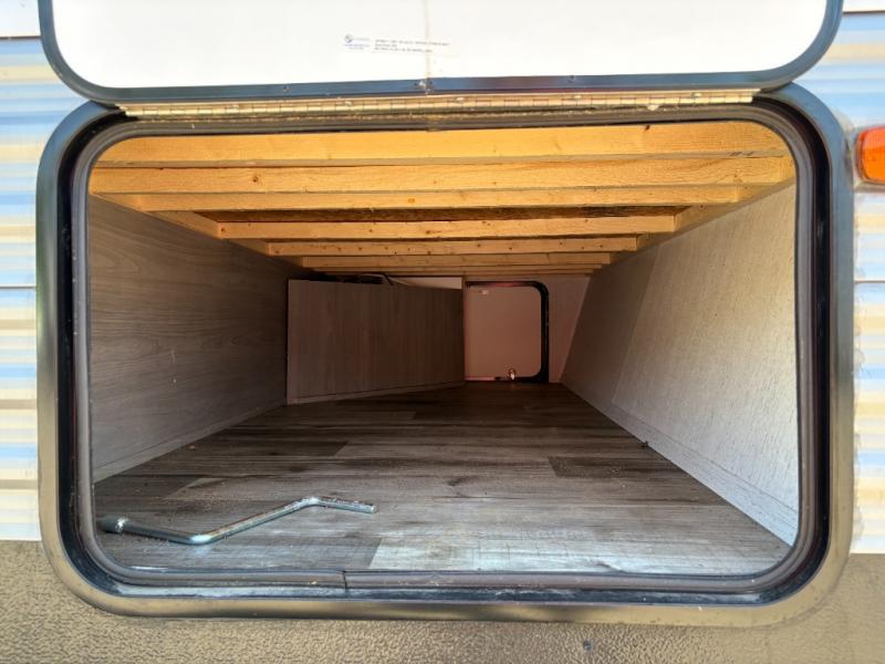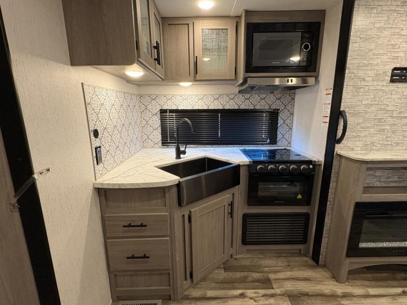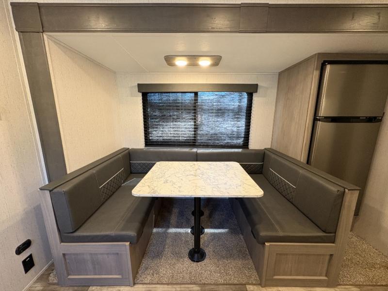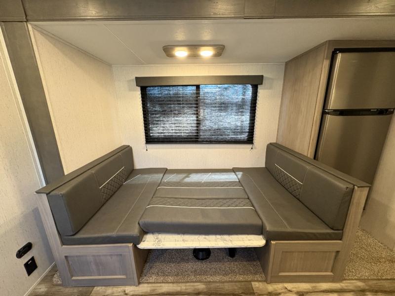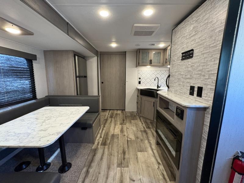 If you enjoy making memories and telling lots of stories, then take this trailer with you on your next trip! You will be able to offer sleeping space for four on the double-size bunks in the rear next to the entry and the full bathroom, plus the conventional U-shaped dinette once easily setup for bedtime gives two more a space to call theirs. Of course, the front bedroom with a queen bed and dual wardrobes will be all yours especially when you want privacy. Everyone can gather around the U-shaped dinette to visit, plan the day's activities, and enjoy the fireplace while the cook makes meals using the kitchen appliances. And don't forget about the outside kitchen when cooking, and the power awning when you want to relax outside.