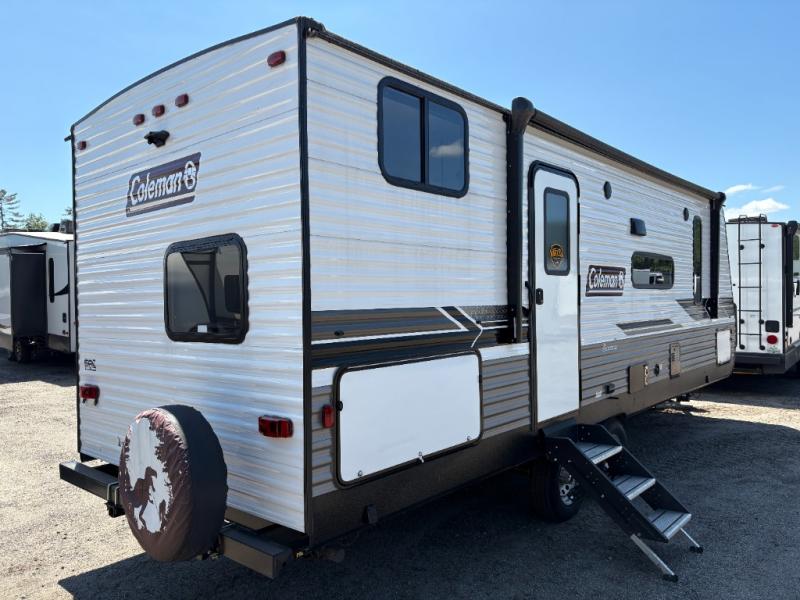 With any Coleman Lantern Series travel trailer and toy hauler travel trailer, the interior will impress with upgraded residential grade linoleum and Eyewear luxury furniture for style and durability, the undermounted large kitchen sink with stainless steel high-rise kitchen faucet, and seamless countertops, plus the hard valances in the living room and master bedroom and the AM/FM/CD/AUX/Bluetooth stereo. The Dutchmen construction advantage is included and provides a durable roof structure with a TPO roof, 3/8" decking, fiberglass insulation, and a lauan interior panel, plus an insulated structure with a metal exterior panel, a wood frame with R7 thermal insulation and an lauan interior panel. Also included is the Blade air flow system which helps reduce air turbulence and noise with duct elbows and wyes that feature enlarged inlets. Choose a Coleman Lantern Series because you appreciate quality, value and design when you camp!