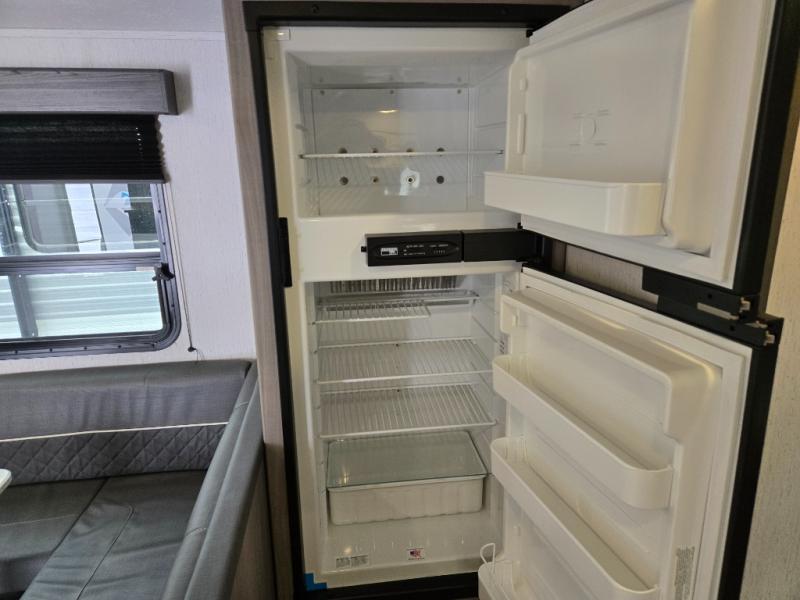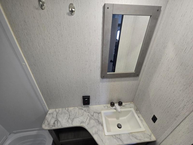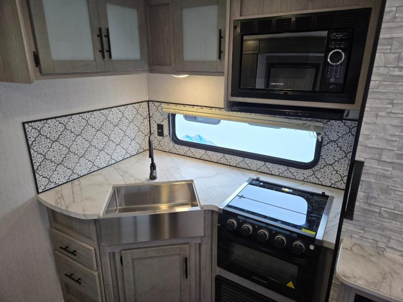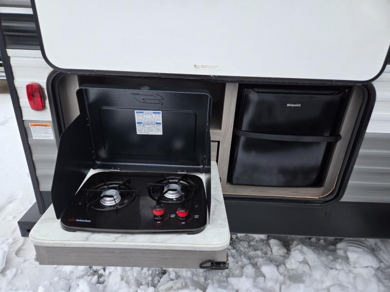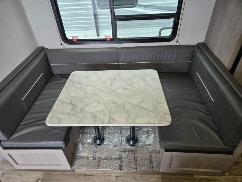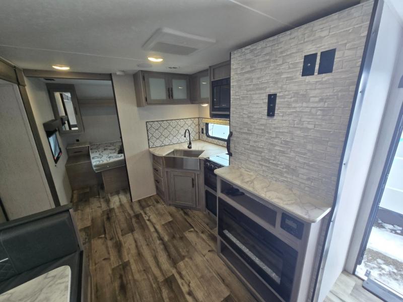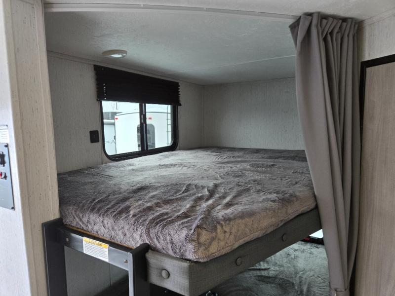 If you enjoy making memories and telling lots of stories, then take this trailer with you on your next trip! You will be able to offer sleeping space for four on the double-size bunks in the rear next to the entry and the full bathroom, plus the conventional U-shaped dinette once easily setup for bedtime gives two more a space to call theirs. Of course, the front bedroom with a queen bed and dual wardrobes will be all yours especially when you want privacy. Everyone can gather around the U-shaped dinette to visit, plan the day's activities, and enjoy the fireplace while the cook makes meals using the kitchen appliances. And don't forget about the outside kitchen when cooking, and the power awning when you want to relax outside.