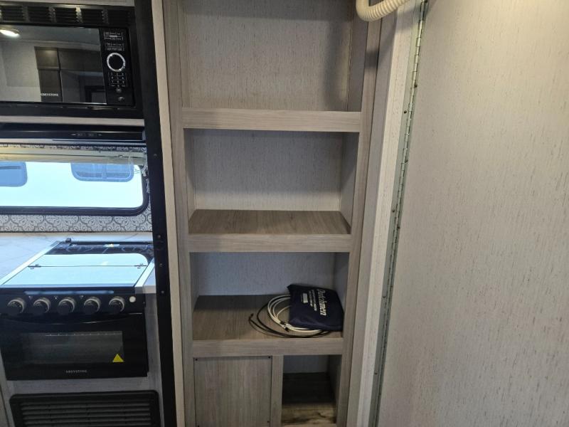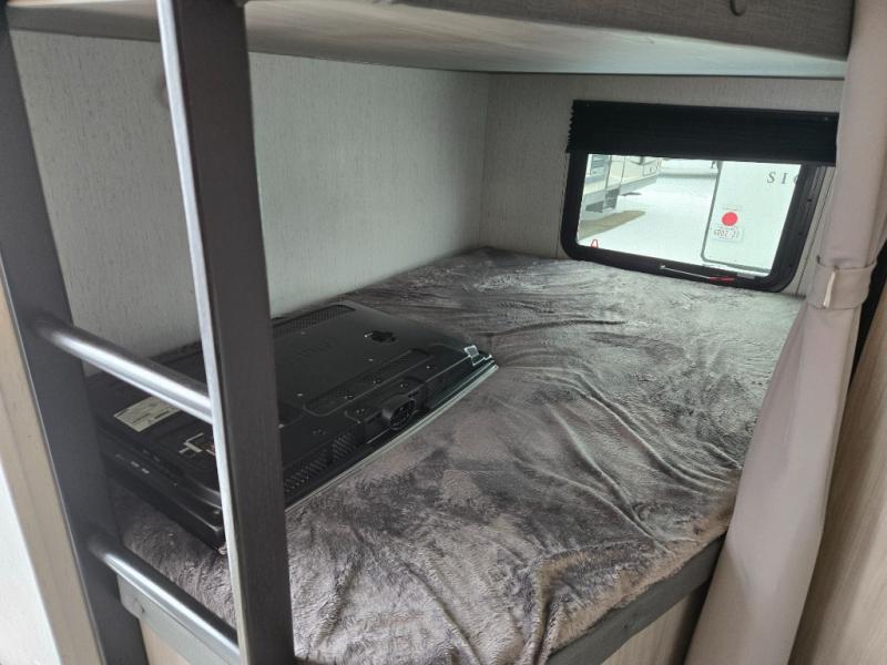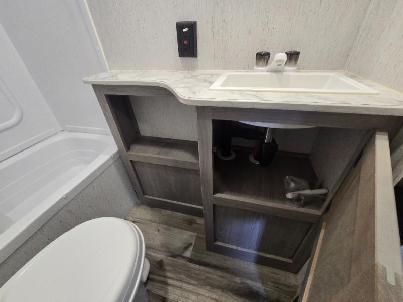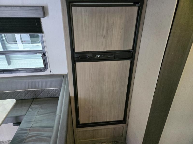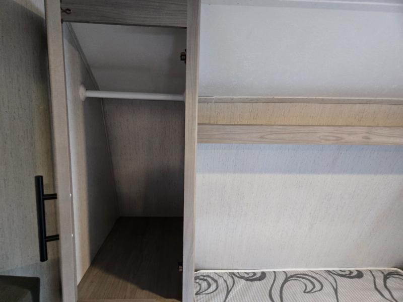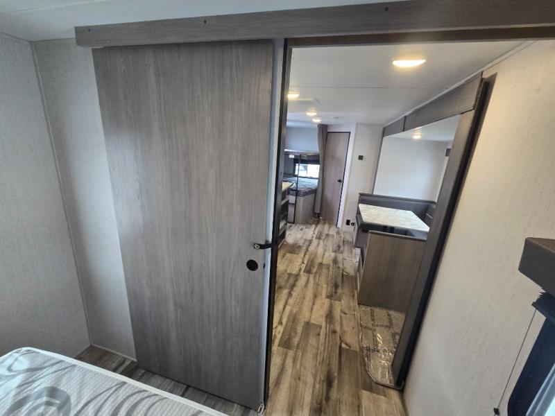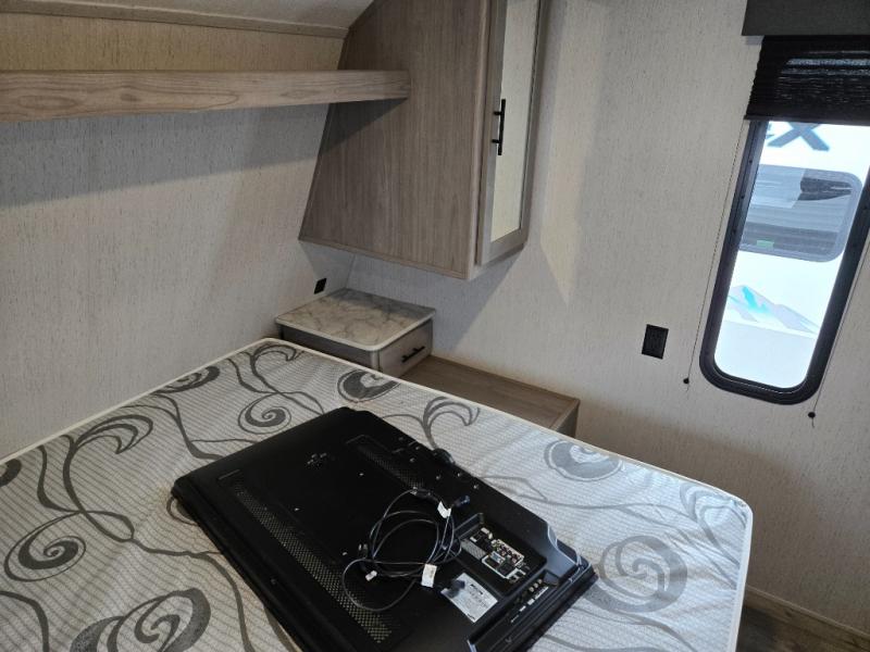 If you enjoy making memories and telling lots of stories, then take this trailer with you on your next trip! You will be able to offer sleeping space for four on the double-size bunks in the rear next to the entry and the full bathroom, plus the conventional U-shaped dinette once easily setup for bedtime gives two more a space to call theirs. Of course, the front bedroom with a queen bed and dual wardrobes will be all yours especially when you want privacy. Everyone can gather around the U-shaped dinette to visit, plan the day's activities, and enjoy the fireplace while the cook makes meals using the kitchen appliances. And don't forget about the outside kitchen when cooking, and the power awning when you want to relax outside.