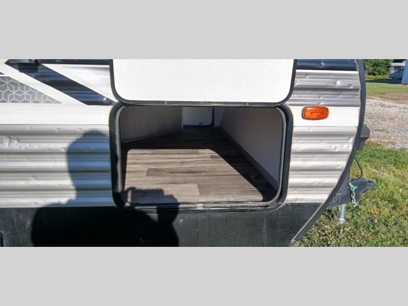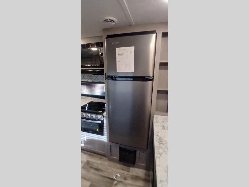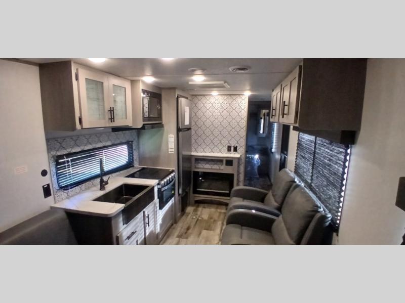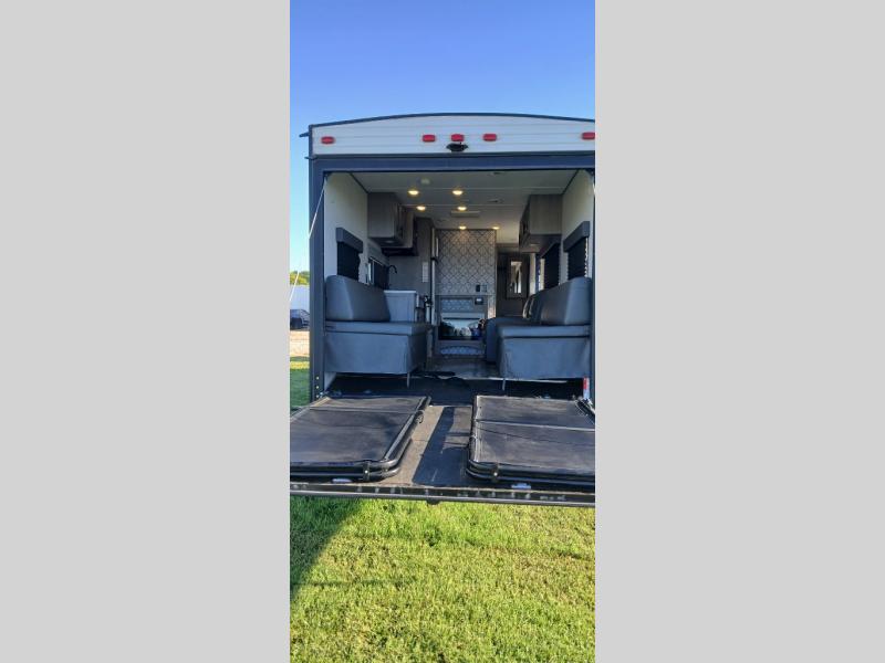 Get ready for adventure and some trail rides when you have this trailer at the campsite. You can easily load your toys using the ramp door into 13'3" of cargo space that becomes the main living and kitchen area once unloaded. Relax and dine on the dual opposing sofas with a table in between and/or on the two swivel rockers. The kitchen offers full amenities including a 10 cu. ft. refrigerator for your cold items and beverages. The front bedroom offers privacy when you need it, plus clothing storage and windows, and the full bathroom allows you to stay clean even if you had to use the outside shower to get the dirt off first. Extra features in this toy hauler include a 1,600 lb. rated rear ramp door, 2,500 lb. rated recessed D-rings and maximized storage flat floors.
