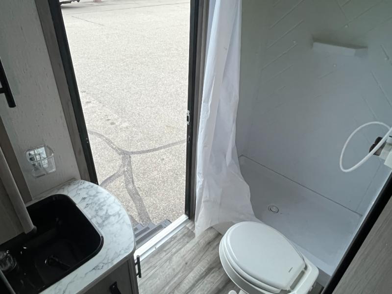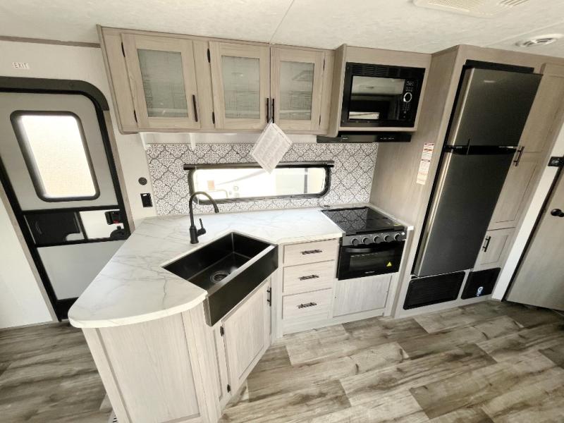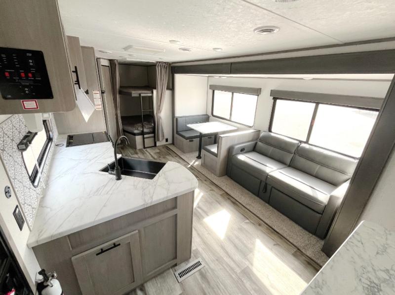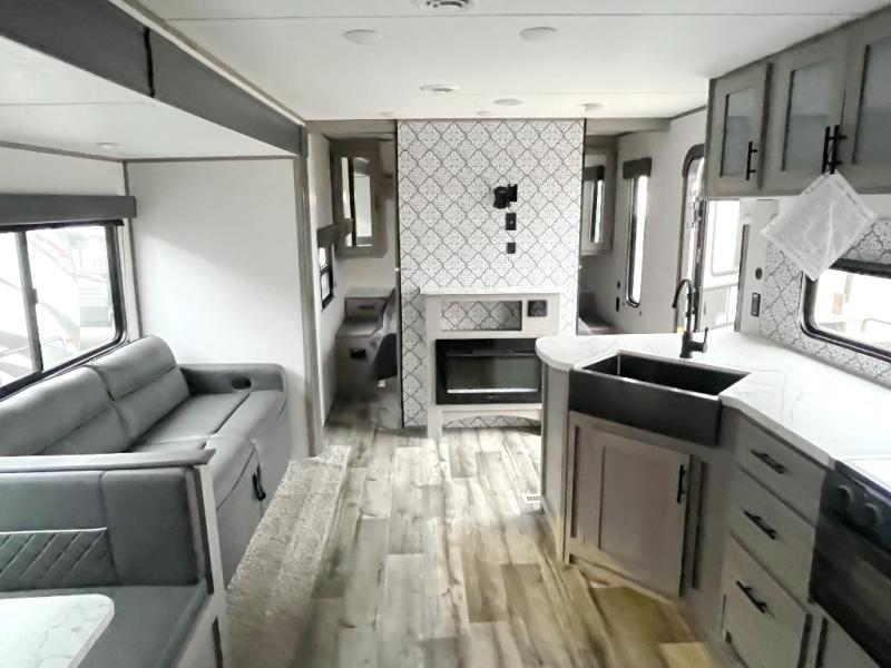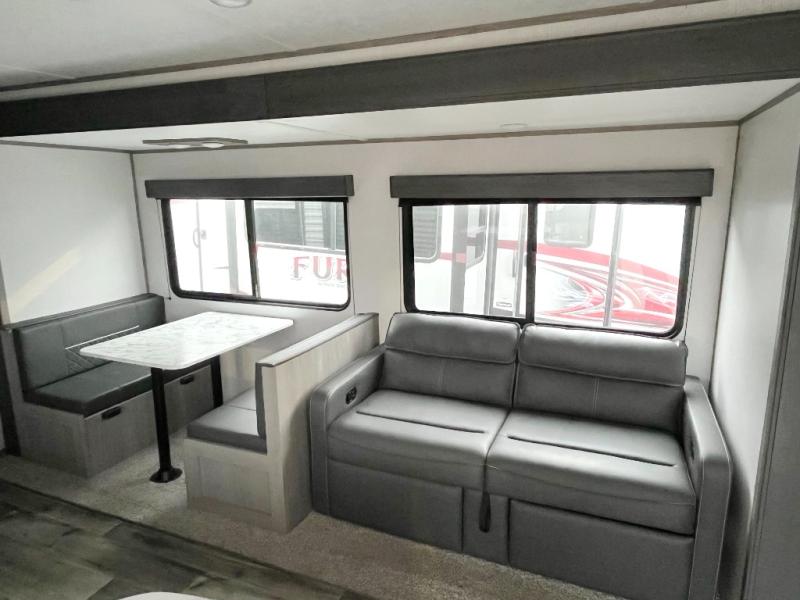 Camp comfortably with your larger group in this trailer that gives you privacy in the front bedroom with a queen bed and dual access, rear double-size bunks next to the full bathroom with the second entry/exit door to the trailer that is super convenient, and a furniture slide that includes a booth dinette and a reclining sofa that some will surely love sleeping on. The main area also includes a fireplace and kitchen appliances including a 10 cu. ft. refrigerator, a farm style sink with high rise faucet, and storage. There is more storage found outside in the pass-through compartment allowing you to take along the larger camping items like camp chairs and tables, charcoal and even fishing poles.