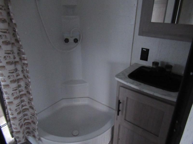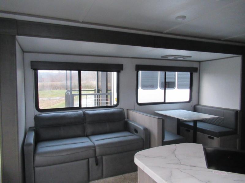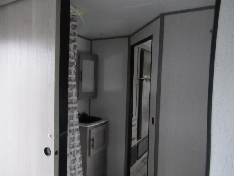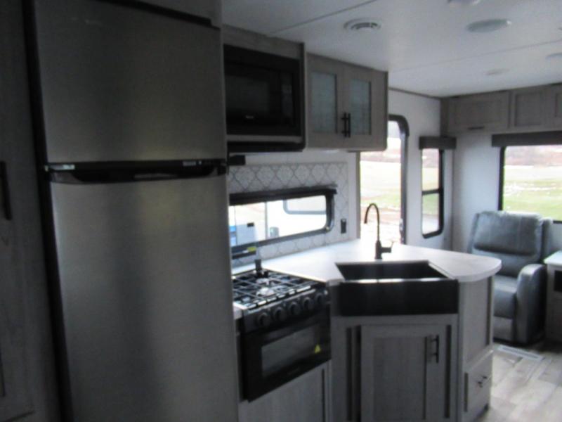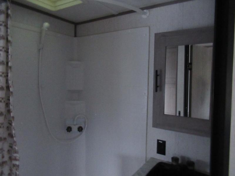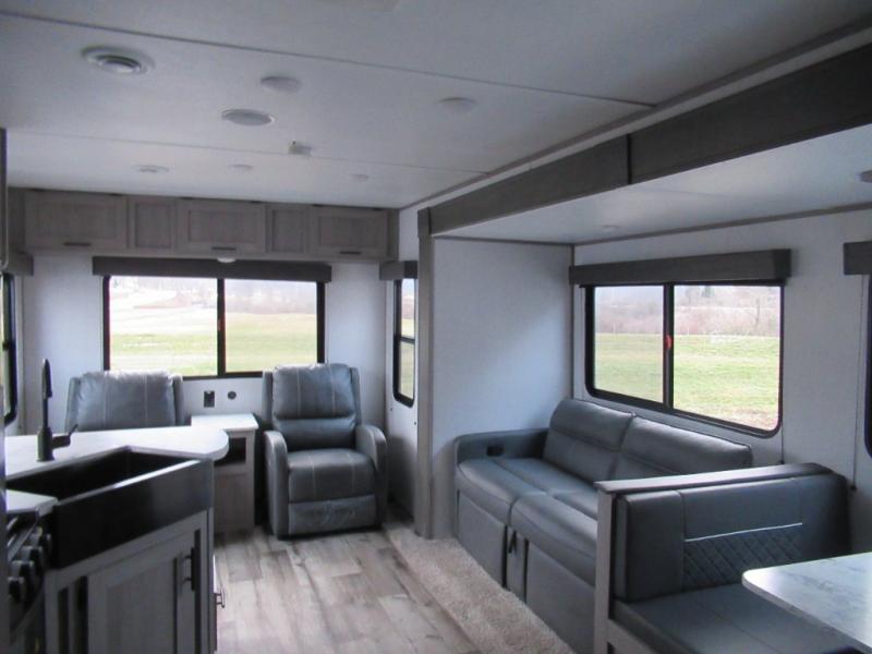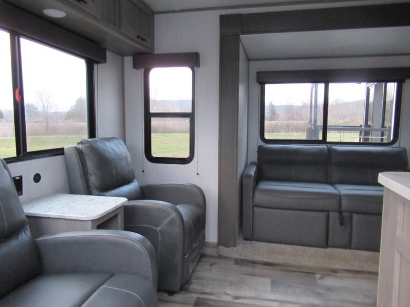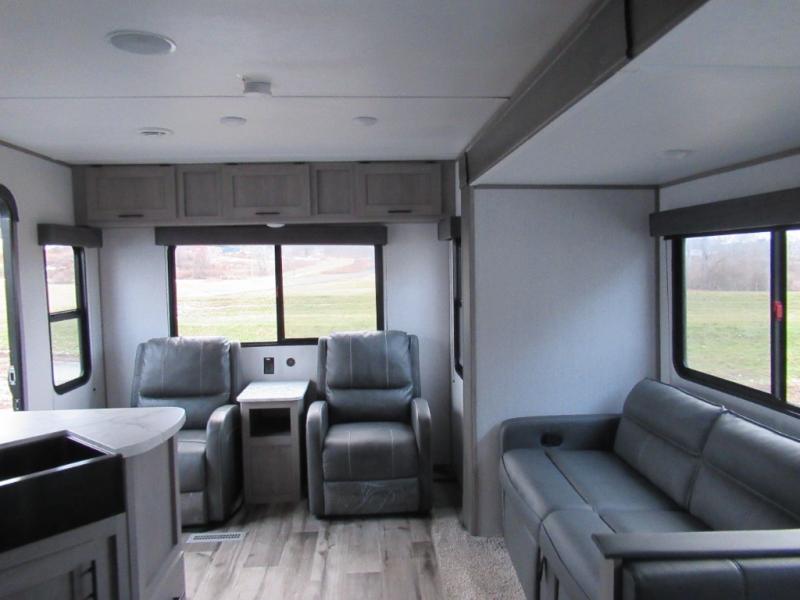 Relax and unwind inside this trailer after a fun day outdoors exploring! You and your person can sit in the swivel rockers as you enter the trailer or make a meal using the kitchen appliances and farm style sink with high rise faucet. Dine inside at the booth dinette or while in the reclining sofa, or eat outside while under the 16' power awning. Your camping chairs can be taken from the front pass-through compartment to help create an outdoor living area under the awning. If you need a restroom break, you can enter the second entry/exit for the trailer into the front bedroom to reach the walk-through bathroom. And the bedroom provides a queen bed, clothing storage and privacy at night.