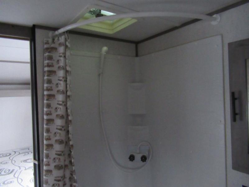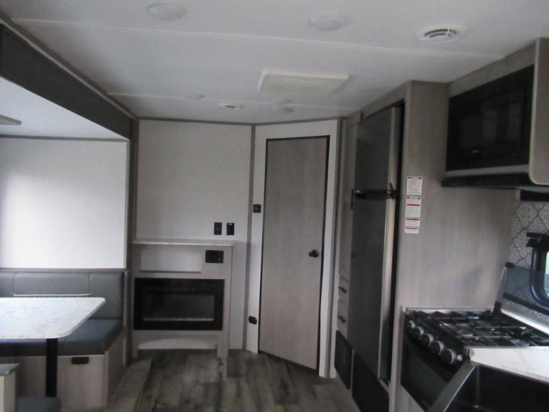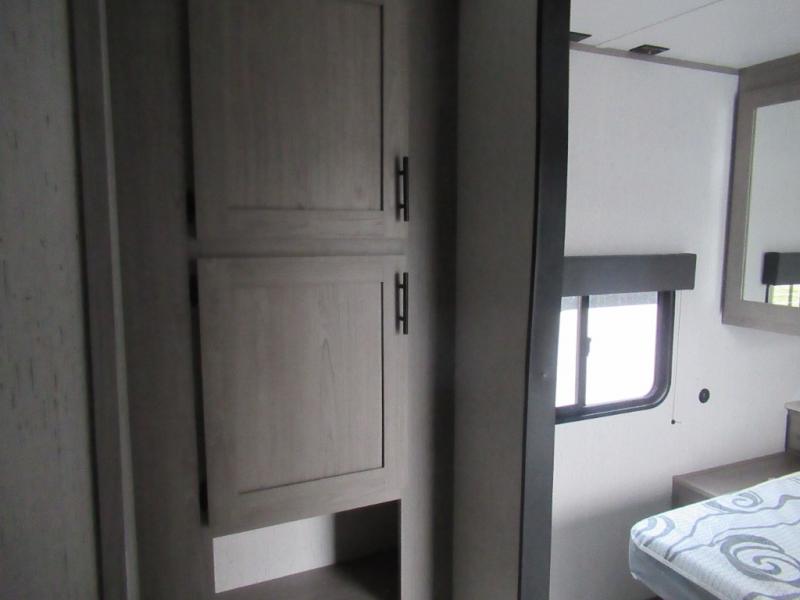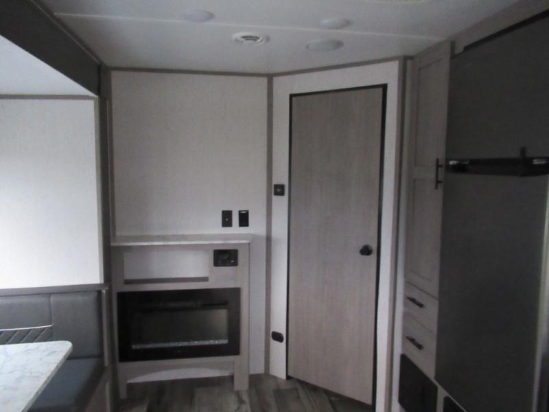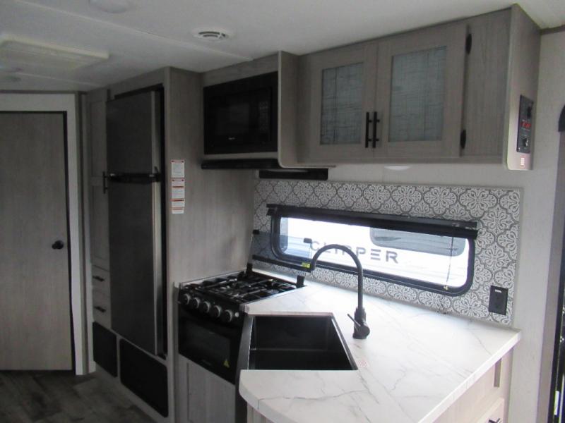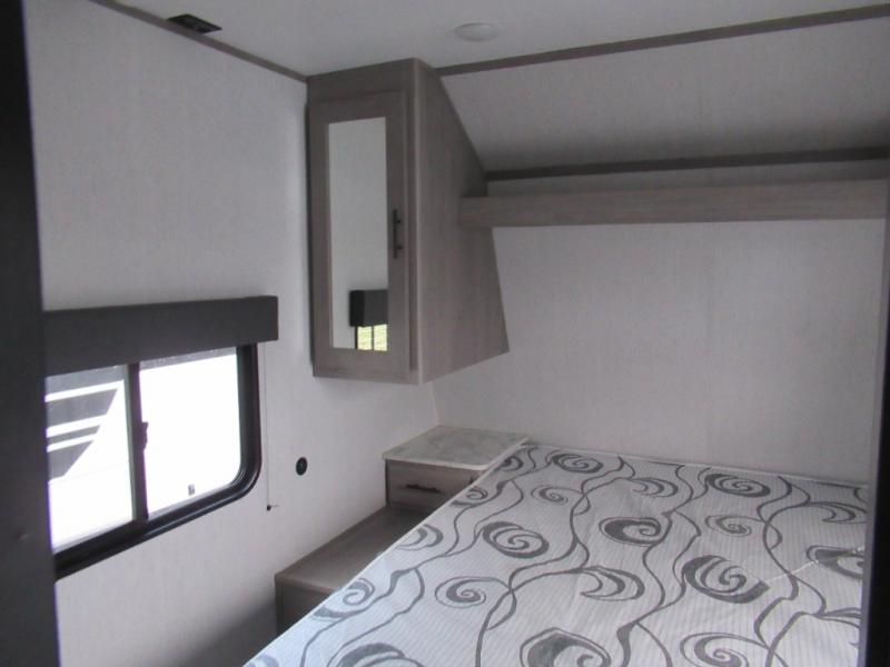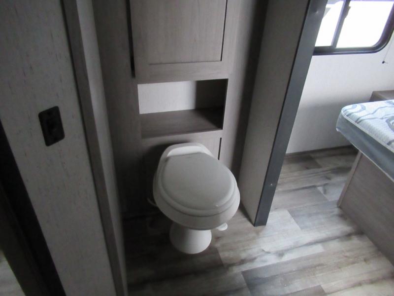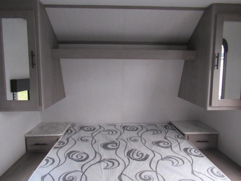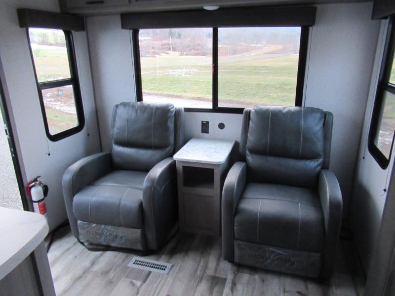 Relax and unwind inside this trailer after a fun day outdoors exploring! You and your person can sit in the swivel rockers as you enter the trailer or make a meal using the kitchen appliances and farm style sink with high rise faucet. Dine inside at the booth dinette or while in the reclining sofa, or eat outside while under the 16' power awning. Your camping chairs can be taken from the front pass-through compartment to help create an outdoor living area under the awning. If you need a restroom break, you can enter the second entry/exit for the trailer into the front bedroom to reach the walk-through bathroom. And the bedroom provides a queen bed, clothing storage and privacy at night.