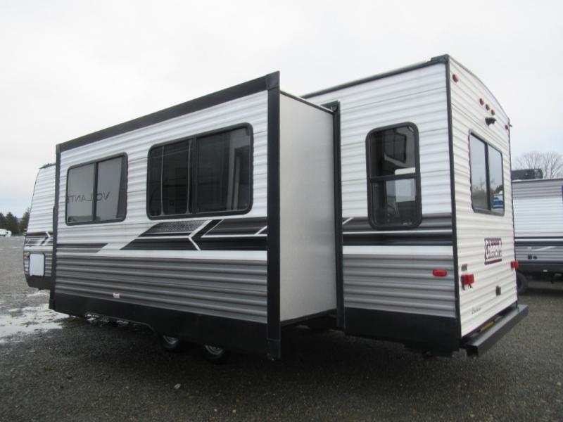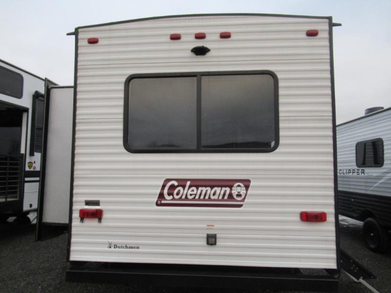 With any Coleman Lantern Series travel trailer and toy hauler travel trailer, the interior will impress with upgraded residential grade linoleum and Eyewear luxury furniture for style and durability, the undermounted large kitchen sink with stainless steel high-rise kitchen faucet, and seamless countertops, plus the hard valances in the living room and master bedroom and the AM/FM/CD/AUX/Bluetooth stereo. The Dutchmen construction advantage is included and provides a durable roof structure with a TPO roof, 3/8" decking, fiberglass insulation, and a lauan interior panel, plus an insulated structure with a metal exterior panel, a wood frame with R7 thermal insulation and an lauan interior panel. Also included is the Blade air flow system which helps reduce air turbulence and noise with duct elbows and wyes that feature enlarged inlets. Choose a Coleman Lantern Series because you appreciate quality, value and design when you camp!