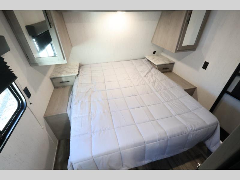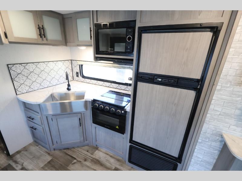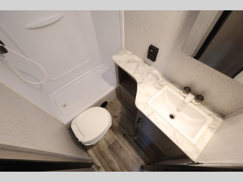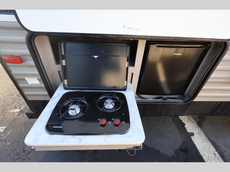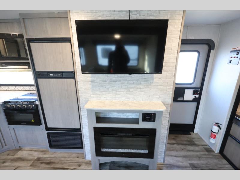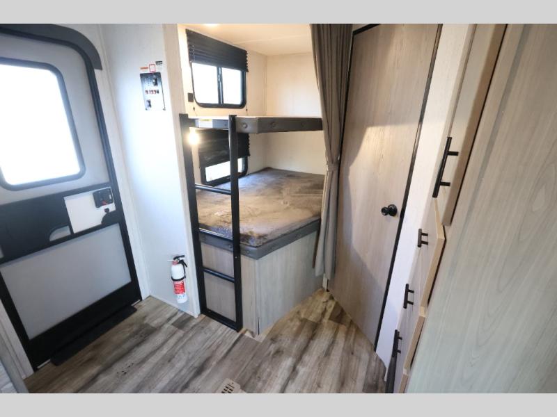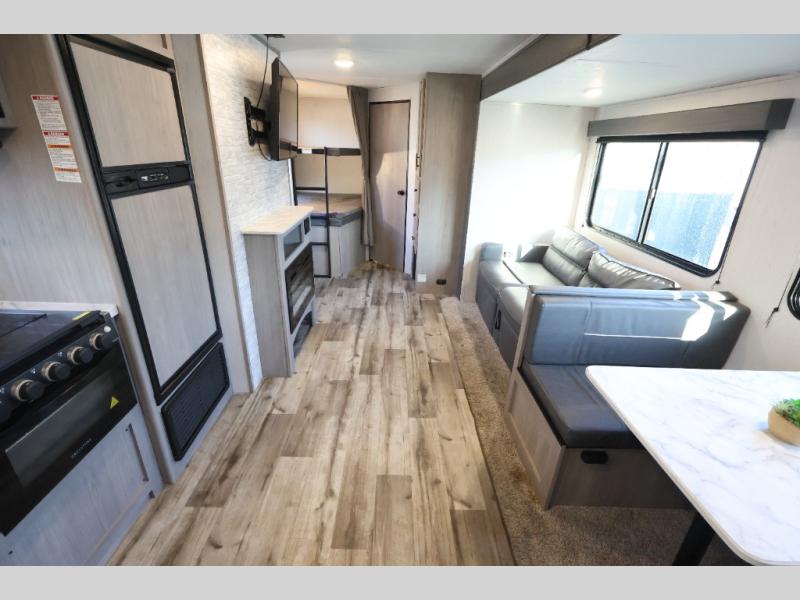 Looking for adventure and new scenery and want conveniences of home in a trailer for when you are ready to relax? Well this trailer allows you to make meals indoors with the kitchen appliances and outdoors on the outside kitchen, to relax on your own sofa or at the booth dinette, and to get clean up in your own full bathroom. And the dual entry doors allow you access to the main area and the double-size bunk beds as well as the front bedroom. The cook will enjoy having a farm style sink with high rise faucet, and an L-shaped counter top to prepare and serve meals as well as a 10 cu. ft. refrigerator to store leftovers. And when you all are ready for bed, four can claim the double-size bunks, two can enjoy privacy in the bedroom on a queen bed, and some will enjoy staying in the main area to sleep on the furniture. There are many more features to enjoy such as the power tongue jack when setting up, the outside shower when your shoes are too dirty to bring inside, and the USB ports when you cellphone battery is low.