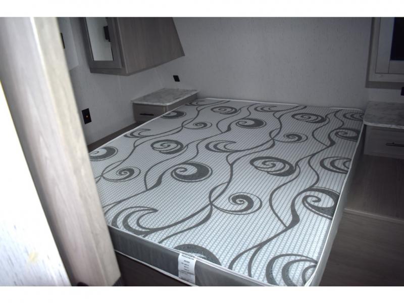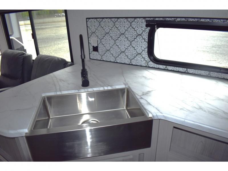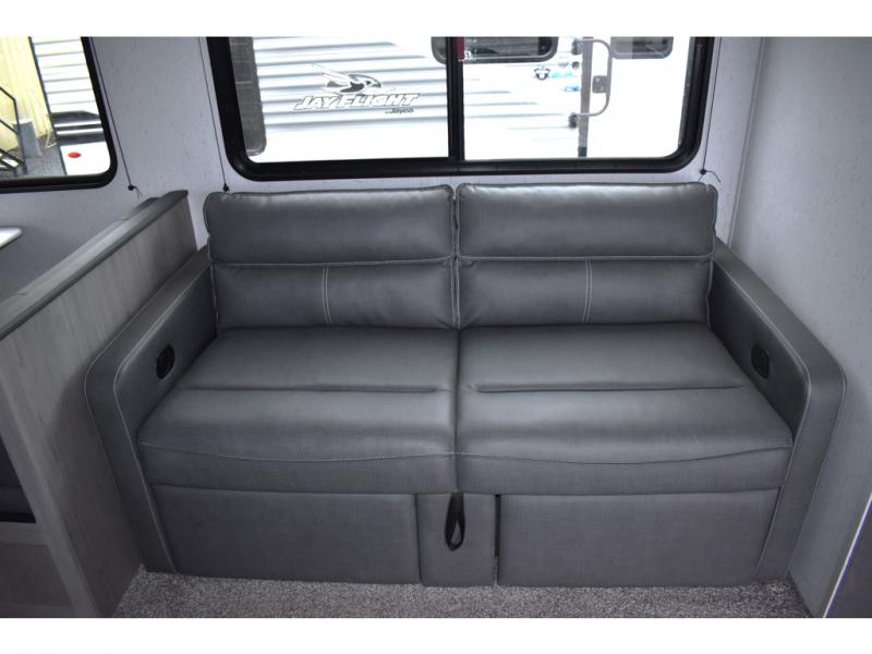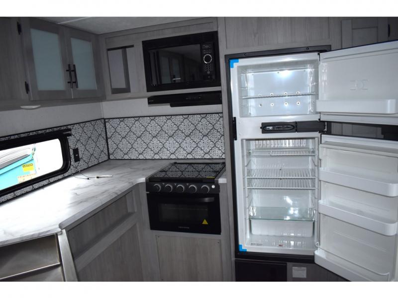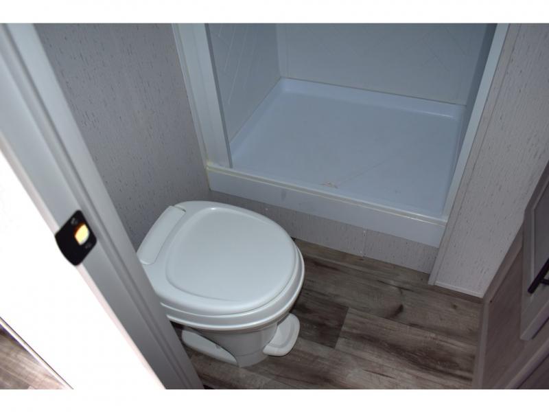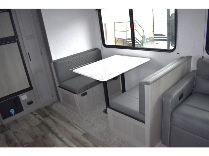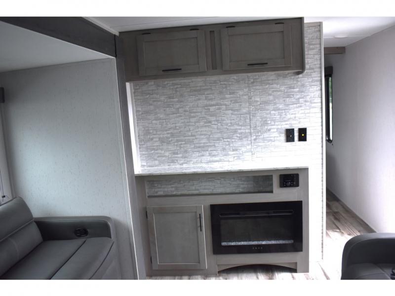 This rear kitchen trailer allows the cook limited interruptions when trying to whip up their famous camping meals! No need to squeeze in when someone needs by when the rear of the trailer includes the kitchen appliances, a U-shaped countertop and there is a slide out with the booth dinette and reclining sofa giving this combined area lots of floor space. Everyone can enjoy the fireplace, and the two swivel rockers will be popular seating. The full bathroom can help keep everyone refreshed and cleaned for bedtime or for the next adventure outdoors. And the 16' power awning offers an outdoor living area with LED light to be able to stay up late to enjoy the campsite. There is storage found throughout, plus the pass-through compartment allows for those longer items.