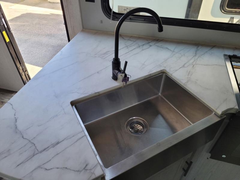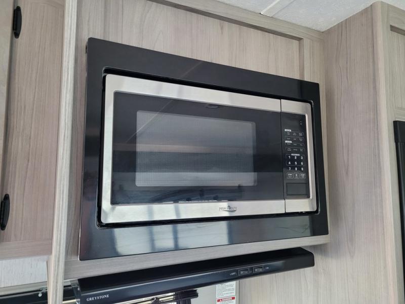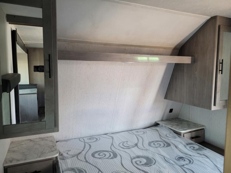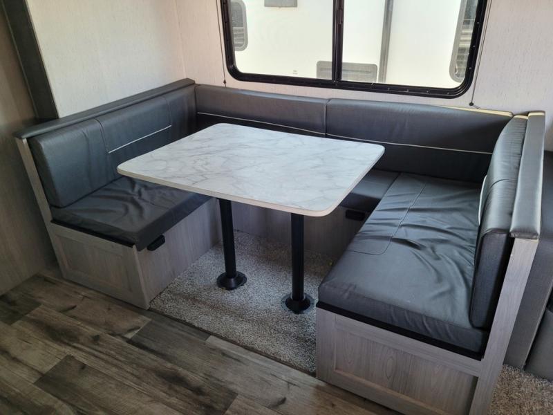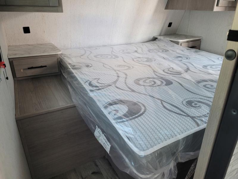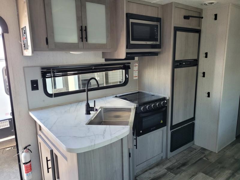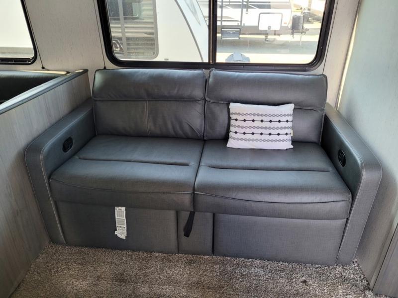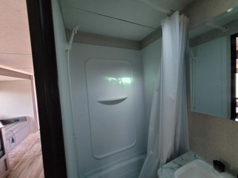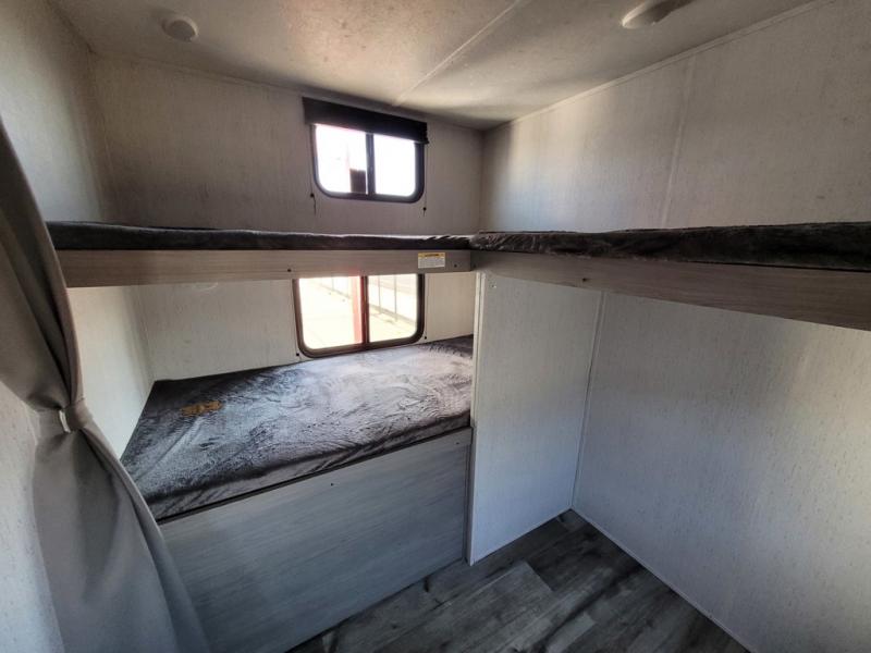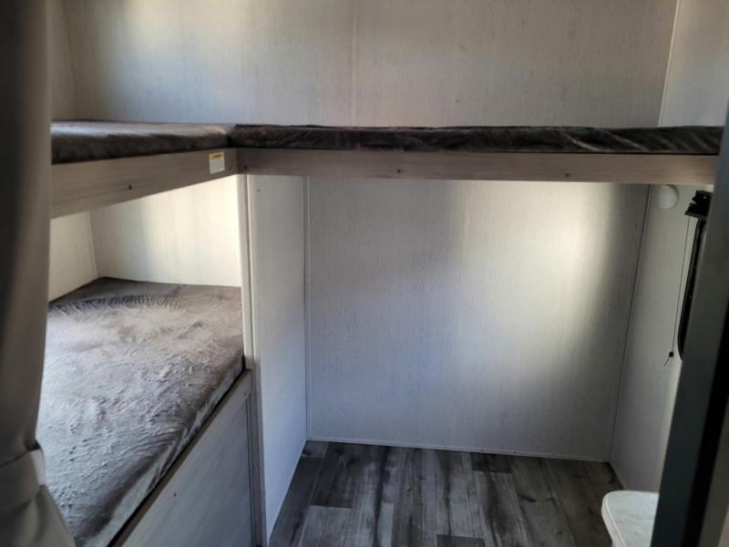 This trailer offers a private bunkhouse which is a popular feature for larger families needing lots of sleeping space! Your kids or friends will love having three bunks to choose from, plus a sofa allowing them to share bedtime stories as they talk about their day. And there is a full bathroom just outside the bunkhouse for convenience. You and your person can sleep on the opposite side in the front bedroom on a queen bed with access from each side and storage. The cook will enjoy having a farm style sink with high rise faucet, and kitchen appliances including a 7 cu. ft. refrigerator to store leftovers. There are many more features to enjoy such as the power tongue jack when setting up, the outside shower when your shoes are too dirty to bring inside, and the USB ports when you cellphone battery is low.