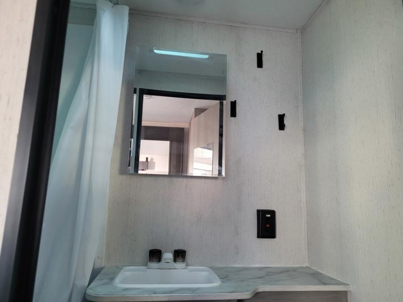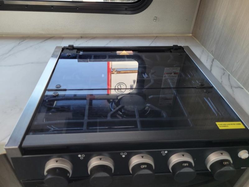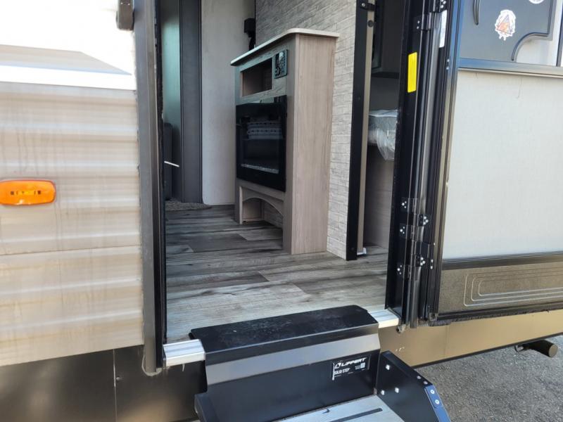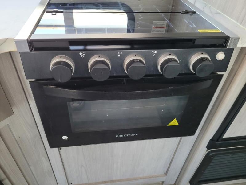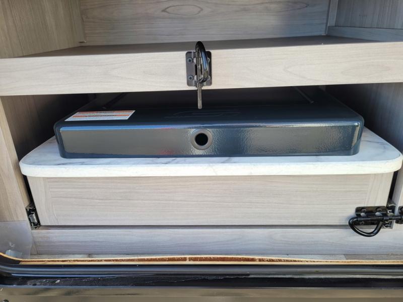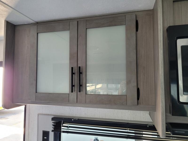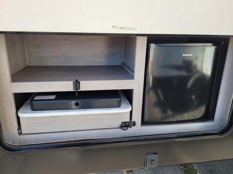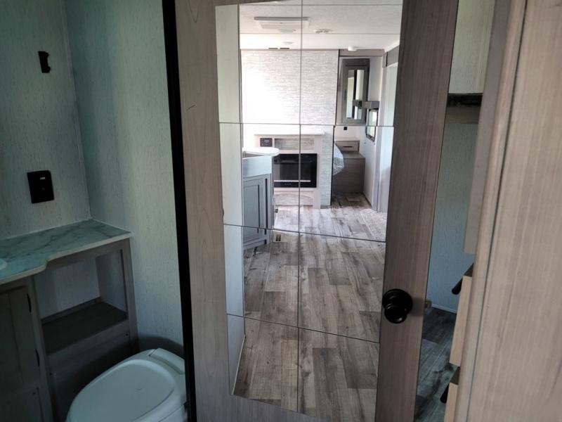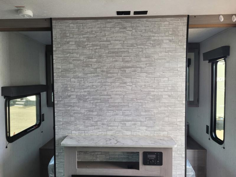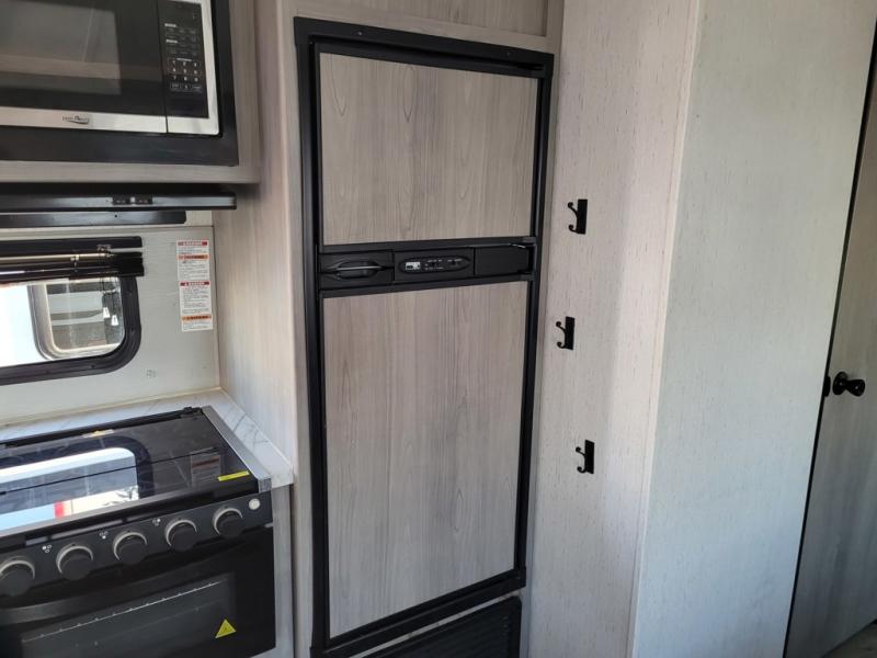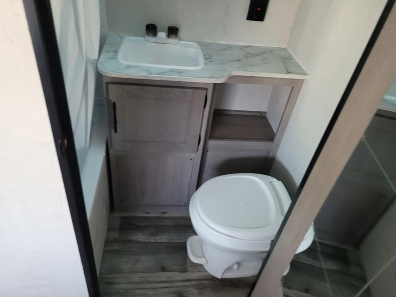 This trailer offers a private bunkhouse which is a popular feature for larger families needing lots of sleeping space! Your kids or friends will love having three bunks to choose from, plus a sofa allowing them to share bedtime stories as they talk about their day. And there is a full bathroom just outside the bunkhouse for convenience. You and your person can sleep on the opposite side in the front bedroom on a queen bed with access from each side and storage. The cook will enjoy having a farm style sink with high rise faucet, and kitchen appliances including a 7 cu. ft. refrigerator to store leftovers. There are many more features to enjoy such as the power tongue jack when setting up, the outside shower when your shoes are too dirty to bring inside, and the USB ports when you cellphone battery is low.