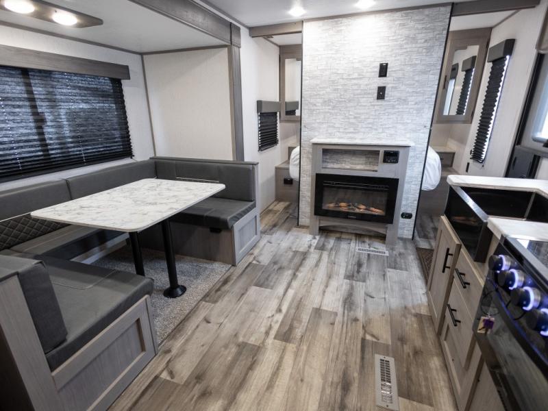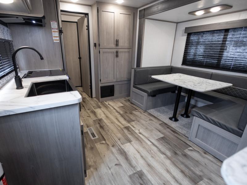 With any Coleman Lantern Series travel trailer and toy hauler travel trailer, the interior will impress with upgraded residential grade linoleum and Eyewear luxury furniture for style and durability, the undermounted large kitchen sink with stainless steel high-rise kitchen faucet, and seamless countertops, plus the hard valances in the living room and master bedroom and the AM/FM/CD/AUX/Bluetooth stereo. The Dutchmen construction advantage is included and provides a durable roof structure with a TPO roof, 3/8" decking, fiberglass insulation, and a lauan interior panel, plus an insulated structure with a metal exterior panel, a wood frame with R7 thermal insulation and an lauan interior panel. Also included is the Blade air flow system which helps reduce air turbulence and noise with duct elbows and wyes that feature enlarged inlets. Choose a Coleman Lantern Series because you appreciate quality, value and design when you camp!