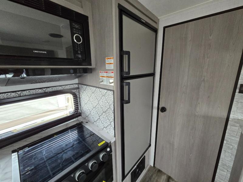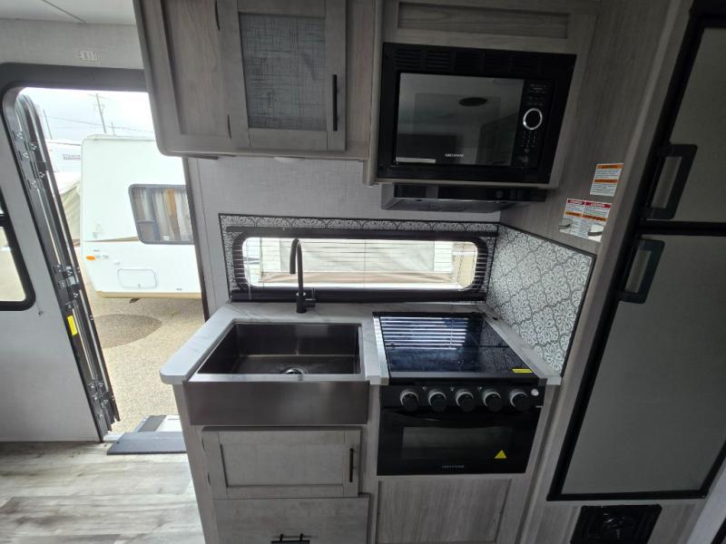 The Dutchmen Coleman Light travel trailer features an upgraded kitchen package with residential appliances, high-rise faucets, and a stainless steel farm-style sink. The fully enclosed underbelly allows all of your trailer's vital functions to be kept out of the freezing cold, and you'll have great stability as you enter your trailer by using the solid entry steps. Each model includes power stabilizer jacks, a power tongue jack, dual 20-LB propane tanks, a residential queen bed, and preparations for Wi-Fi 4G LTE. There is an aerodynamic front fiberglass cap, exterior speakers, solar charging connection, and aluminum wheels.