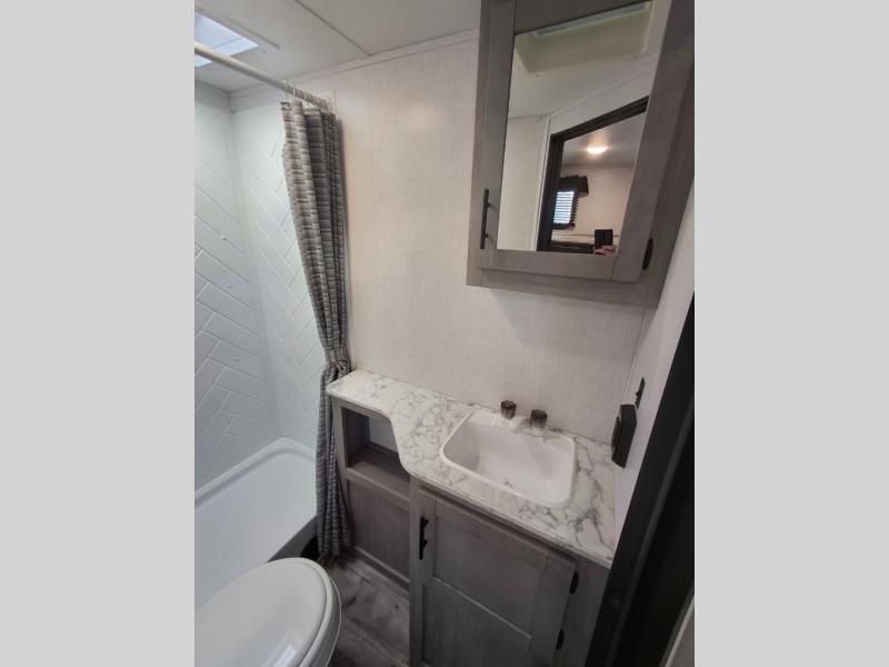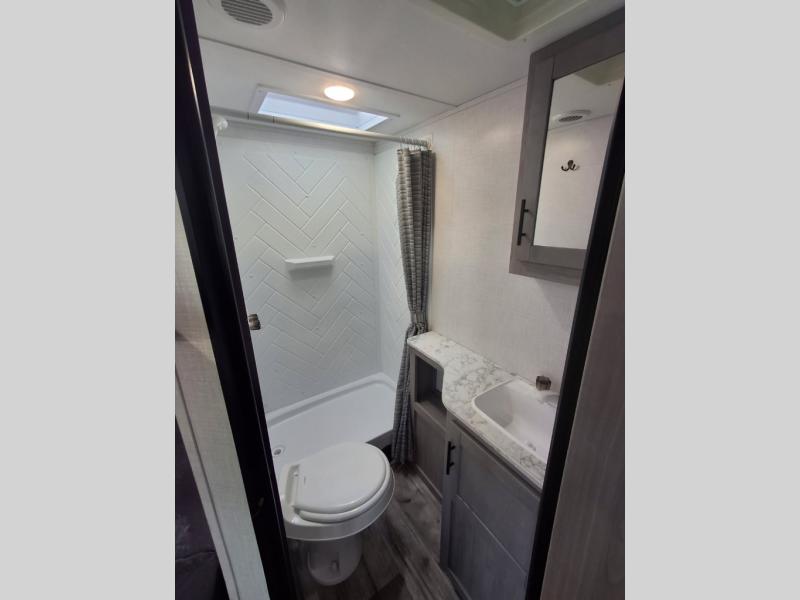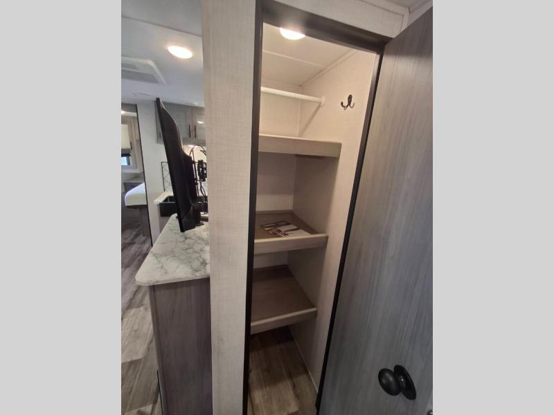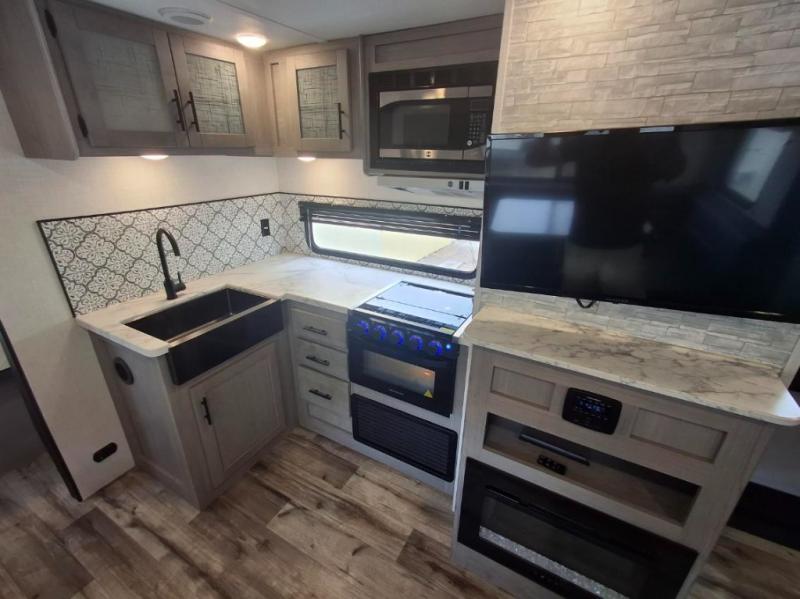 The Dutchmen Coleman Light travel trailer features an upgraded kitchen package with residential appliances, high-rise faucets, and a stainless steel farm-style sink. The fully enclosed underbelly allows all of your trailer's vital functions to be kept out of the freezing cold, and you'll have great stability as you enter your trailer by using the solid entry steps. Each model includes power stabilizer jacks, a power tongue jack, dual 20-LB propane tanks, a residential queen bed, and preparations for Wi-Fi 4G LTE. There is an aerodynamic front fiberglass cap, exterior speakers, solar charging connection, and aluminum wheels.