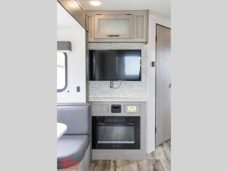 It won't be long after you return from your first camping trip with this Coleman Light travel trailer that you'll want to plan another one! This trailer is light enough to make the trip an easy one and accommodating enough to make the trip quite enjoyable. There is a reclining sofa to sit on in front of the fireplace. The single slide holds the booth dinette so that it isn't in the way of anyone relaxing on the sofa. An oven, three-burner range, microwave, and 7-cubic foot refrigerator make the kitchen a full-service station, and the dual-entry bathroom is also fully equipped with a radius shower, toilet, and wooden medicine cabinet with mirror.