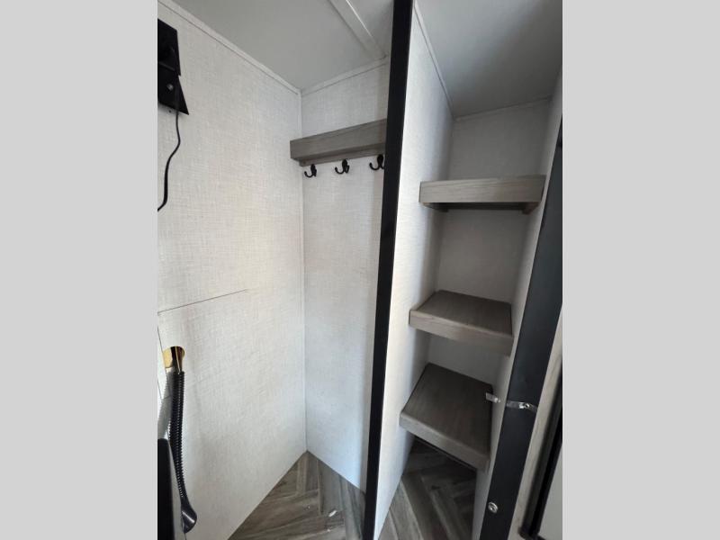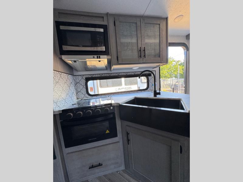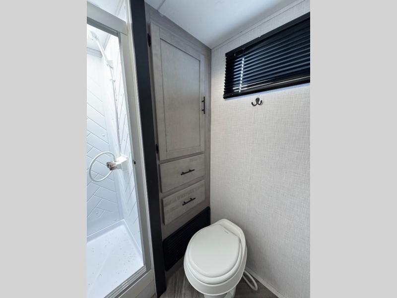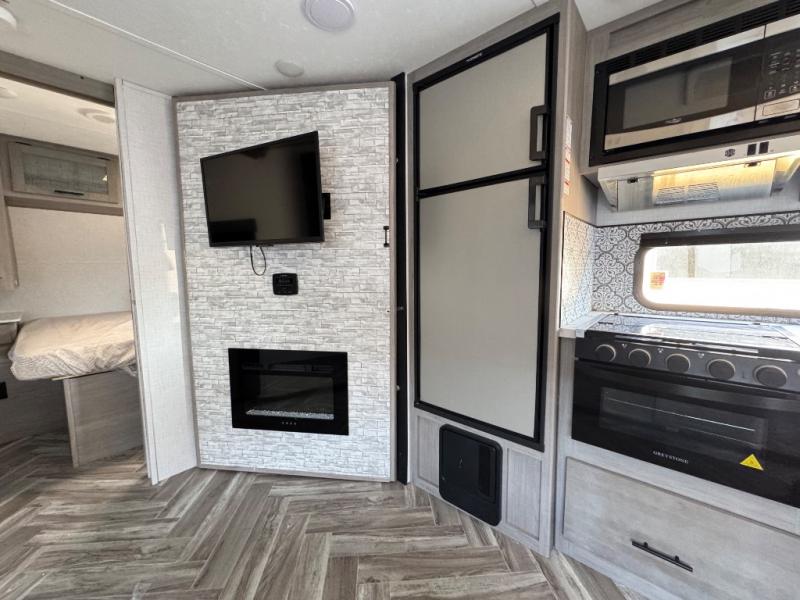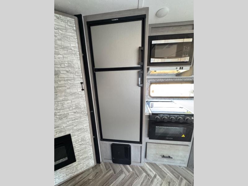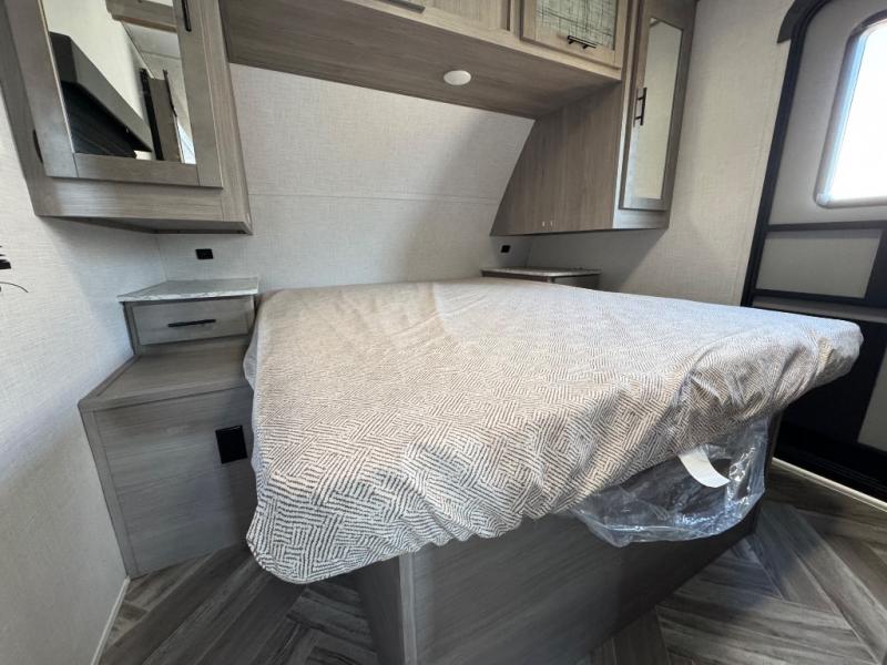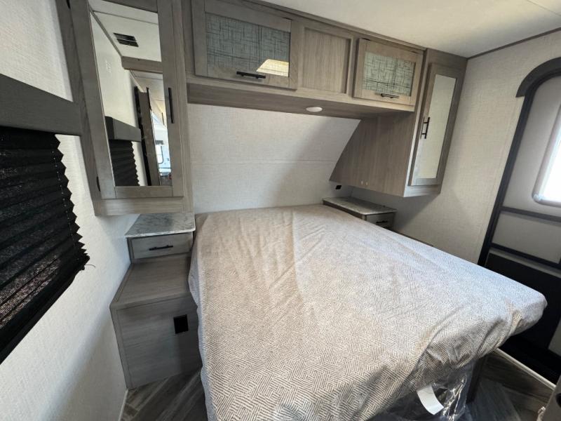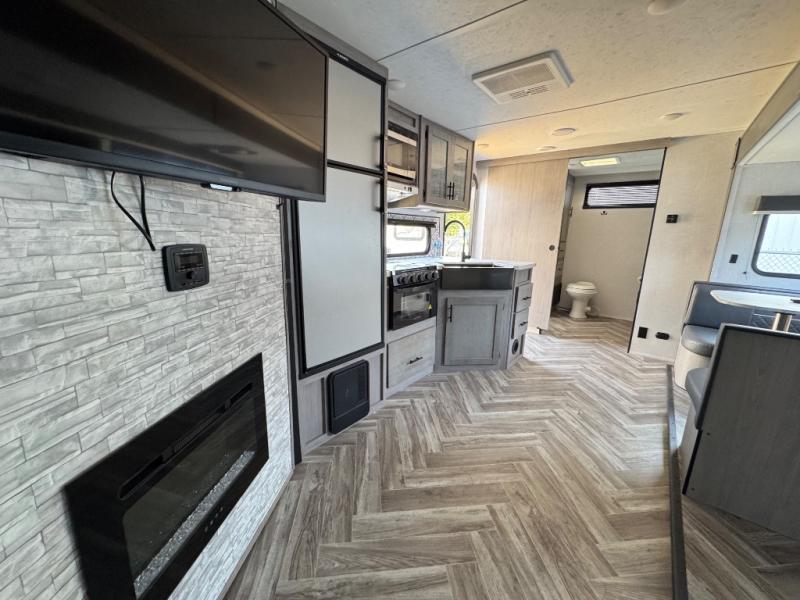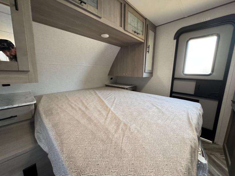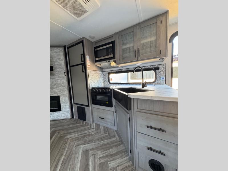 The Dutchmen Coleman Light travel trailer features an upgraded kitchen package with residential appliances, high-rise faucets, and a stainless steel farm-style sink. The fully enclosed underbelly allows all of your trailer's vital functions to be kept out of the freezing cold, and you'll have great stability as you enter your trailer by using the solid entry steps. Each model includes power stabilizer jacks, a power tongue jack, dual 20-LB propane tanks, a residential queen bed, and preparations for Wi-Fi 4G LTE. There is an aerodynamic front fiberglass cap, exterior speakers, solar charging connection, and aluminum wheels.