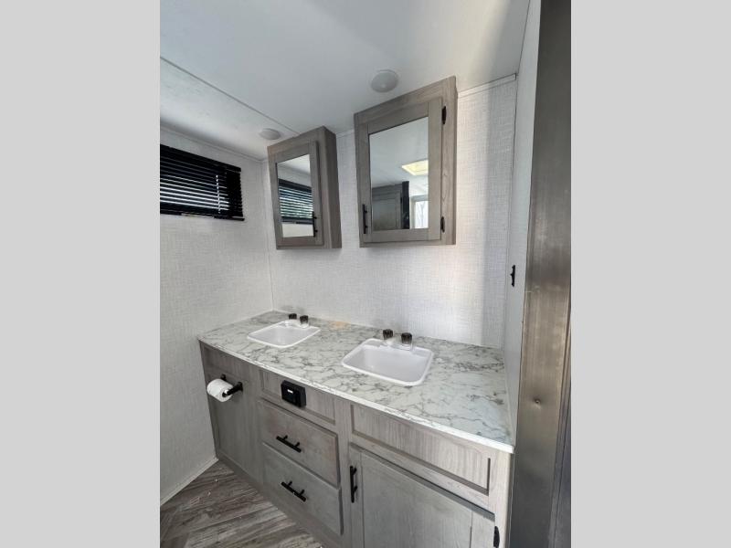 Have fun seeing the country with this Coleman Light travel trailer! You can hunker down back in the woods, or you can head out to a popular campsite to visit with friends. Whatever you choose to do, this trailer will make it fun. It has a hinged entertainment center with a hidden pantry behind it. There is also a fireplace below the entertainment center, and when you are sitting on the reclining sofa or booth dinette, you can benefit from the heat it provides. As you spend time getting ready each morning, you'll appreciate the inclusion of a dual-sink vanity in the rear bathroom. This makes it so much easier to get ready at the same time as your spouse. You'll also have easy access into this trailer because of the two entry doors that have been installed.