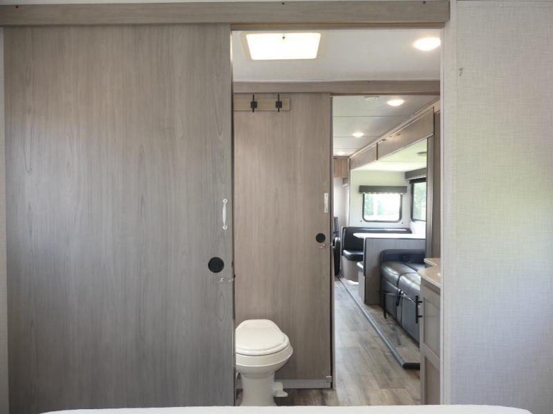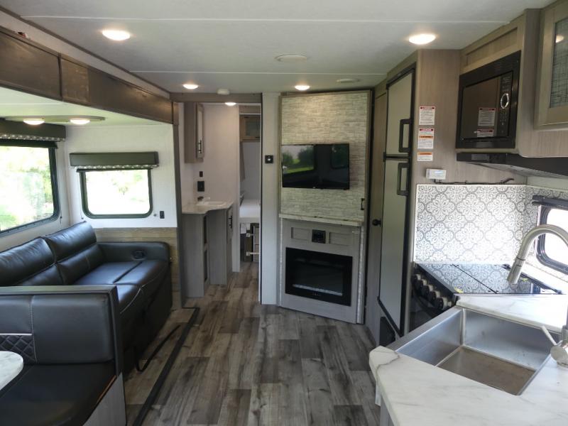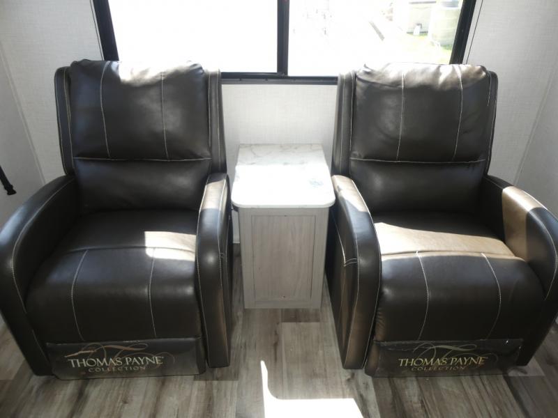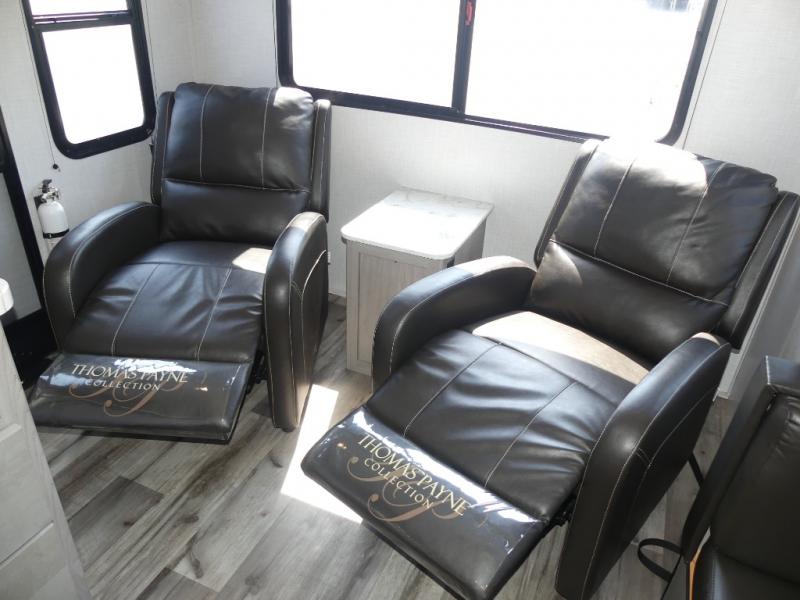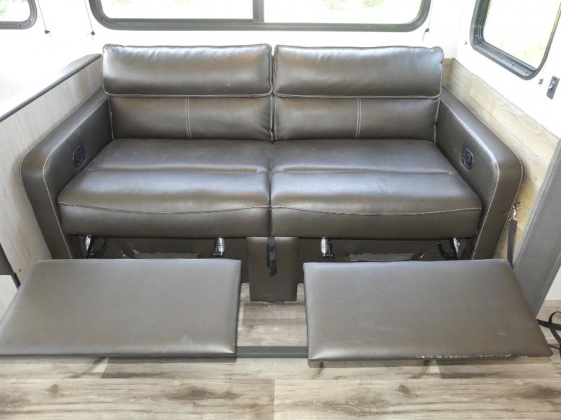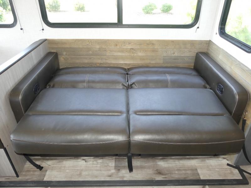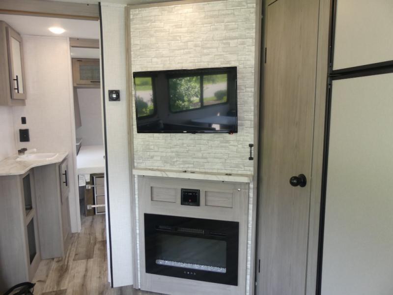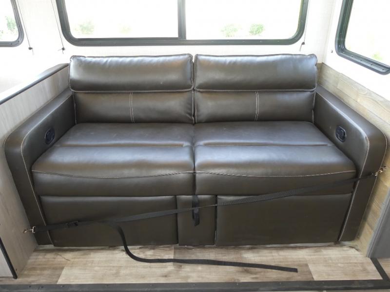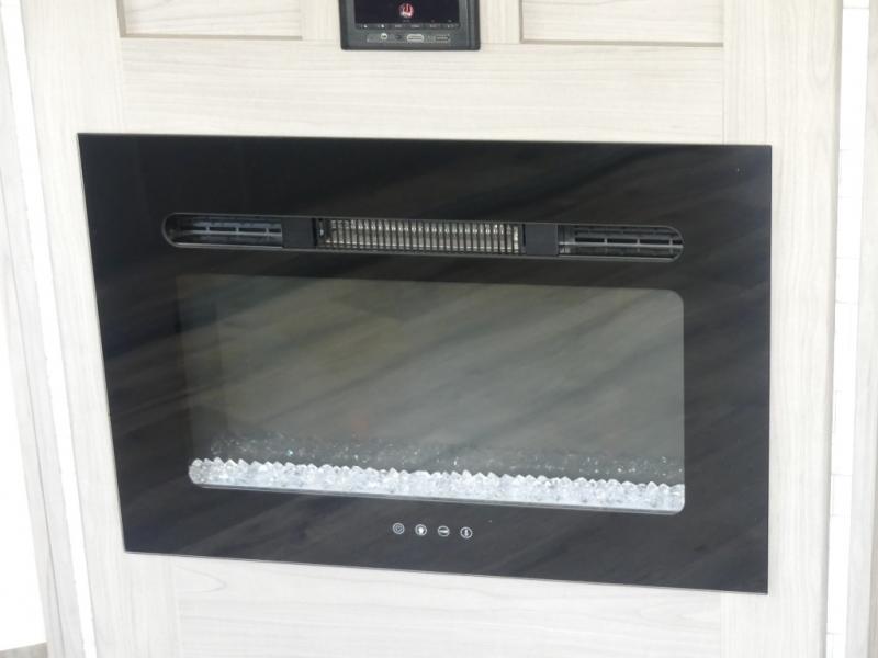 You'll feel right at home in this Coleman Light travel trailer! There are many residential comforts included on this trailer, like the residential queen bed up in the private bedroom, the two swivel rockers with end table in between, the reclining sofa, the two entry doors for great accessibility, and the fireplace for a cozy effect. The walk-through bath is a useful feature because it provides entry doors on either side which means that you can access the bathroom from the bedroom or main living area. You'll also be able to keep some extra equipment stored away in the exterior pass-through storage.