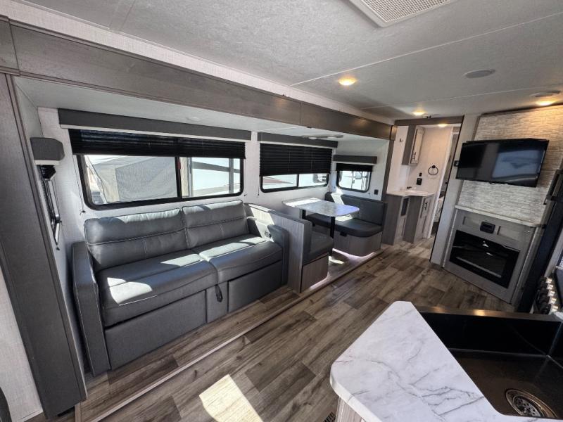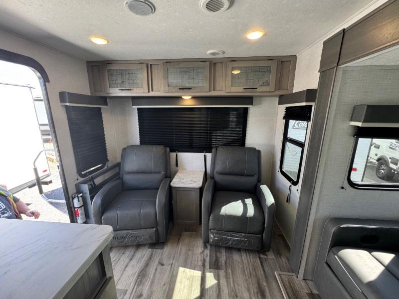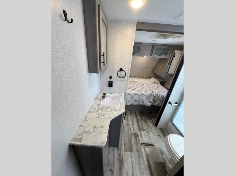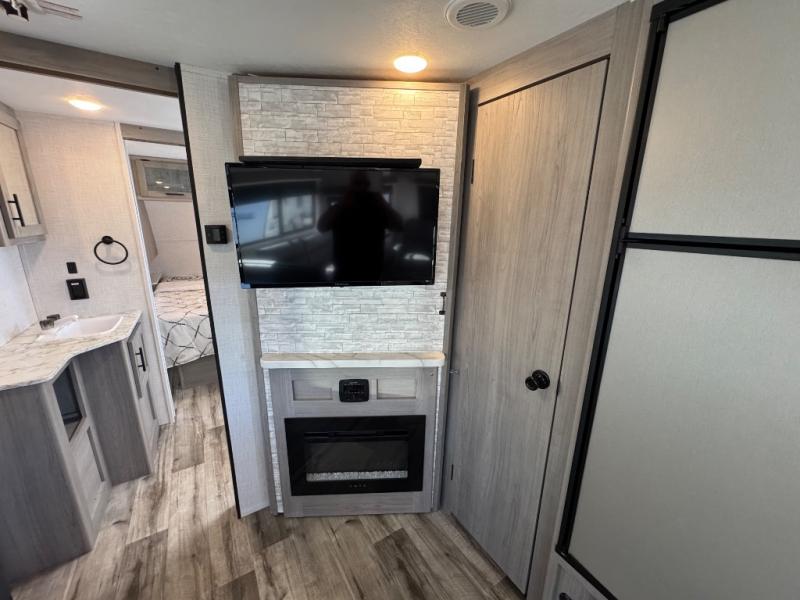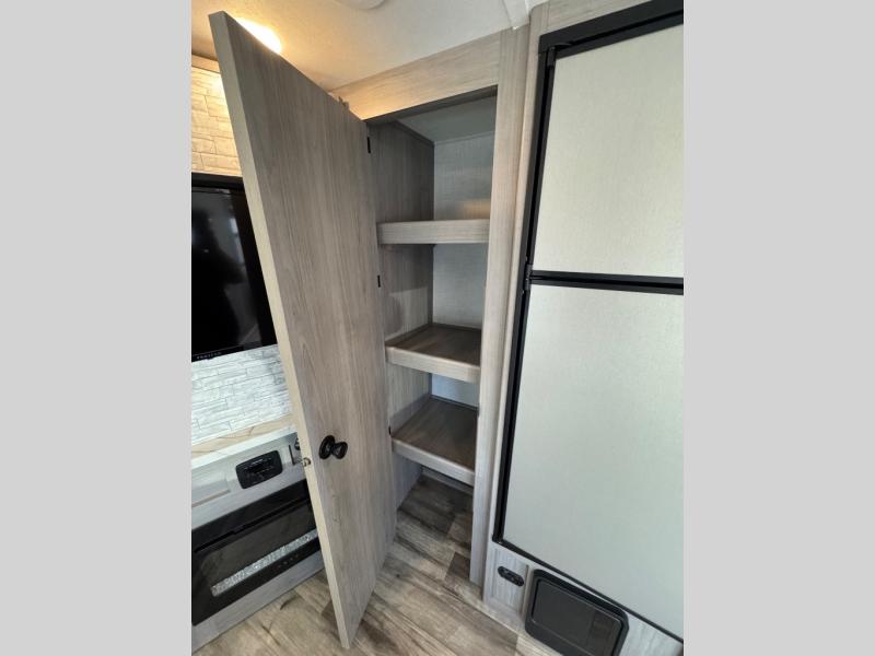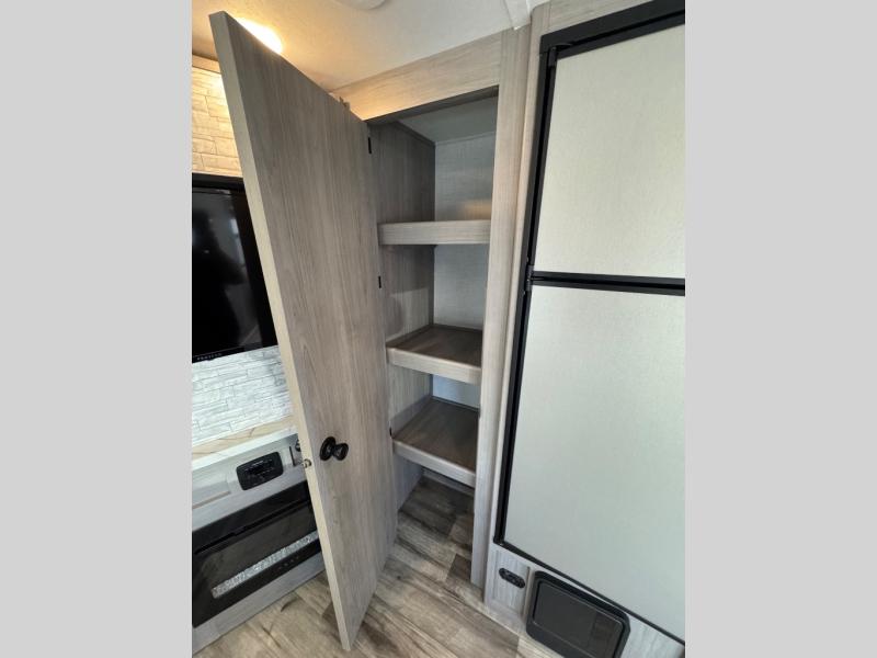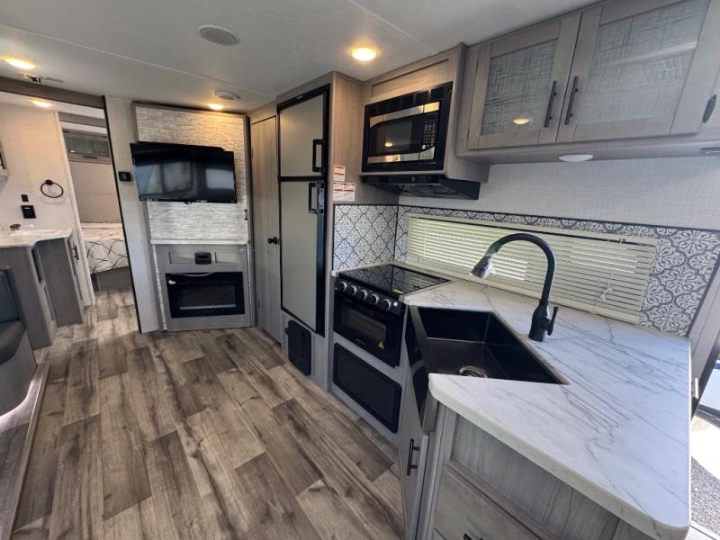 The Dutchmen Coleman Light travel trailer features an upgraded kitchen package with residential appliances, high-rise faucets, and a stainless steel farm-style sink. The fully enclosed underbelly allows all of your trailer's vital functions to be kept out of the freezing cold, and you'll have great stability as you enter your trailer by using the solid entry steps. Each model includes power stabilizer jacks, a power tongue jack, dual 20-LB propane tanks, a residential queen bed, and preparations for Wi-Fi 4G LTE. There is an aerodynamic front fiberglass cap, exterior speakers, solar charging connection, and aluminum wheels.