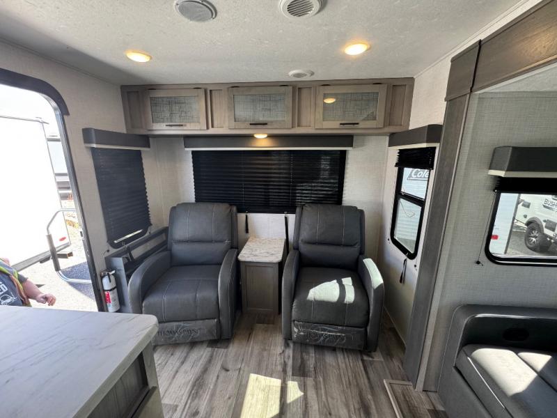 You'll feel right at home in this Coleman Light travel trailer! There are many residential comforts included on this trailer, like the residential queen bed up in the private bedroom, the two swivel rockers with end table in between, the reclining sofa, the two entry doors for great accessibility, and the fireplace for a cozy effect. The walk-through bath is a useful feature because it provides entry doors on either side which means that you can access the bathroom from the bedroom or main living area. You'll also be able to keep some extra equipment stored away in the exterior pass-through storage.