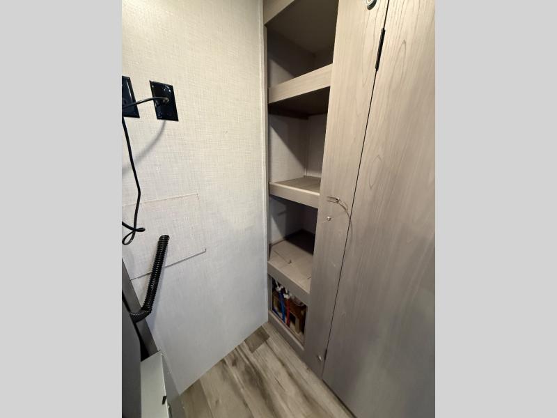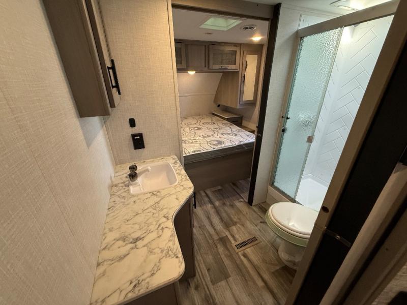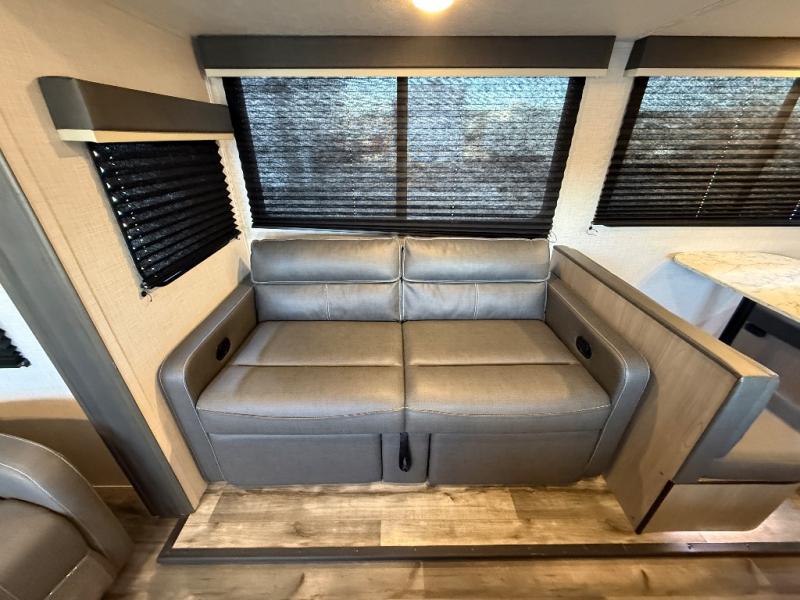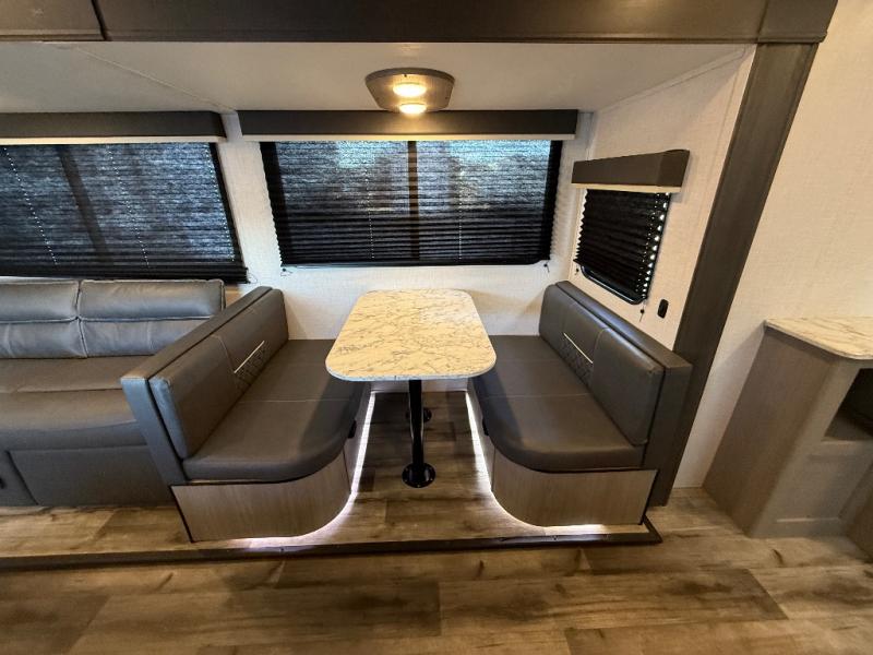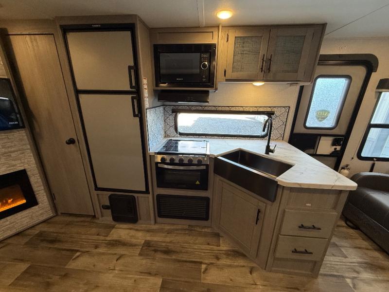 The Dutchmen Coleman Light travel trailer features an upgraded kitchen package with residential appliances, high-rise faucets, and a stainless steel farm-style sink. The fully enclosed underbelly allows all of your trailer's vital functions to be kept out of the freezing cold, and you'll have great stability as you enter your trailer by using the solid entry steps. Each model includes power stabilizer jacks, a power tongue jack, dual 20-LB propane tanks, a residential queen bed, and preparations for Wi-Fi 4G LTE. There is an aerodynamic front fiberglass cap, exterior speakers, solar charging connection, and aluminum wheels.