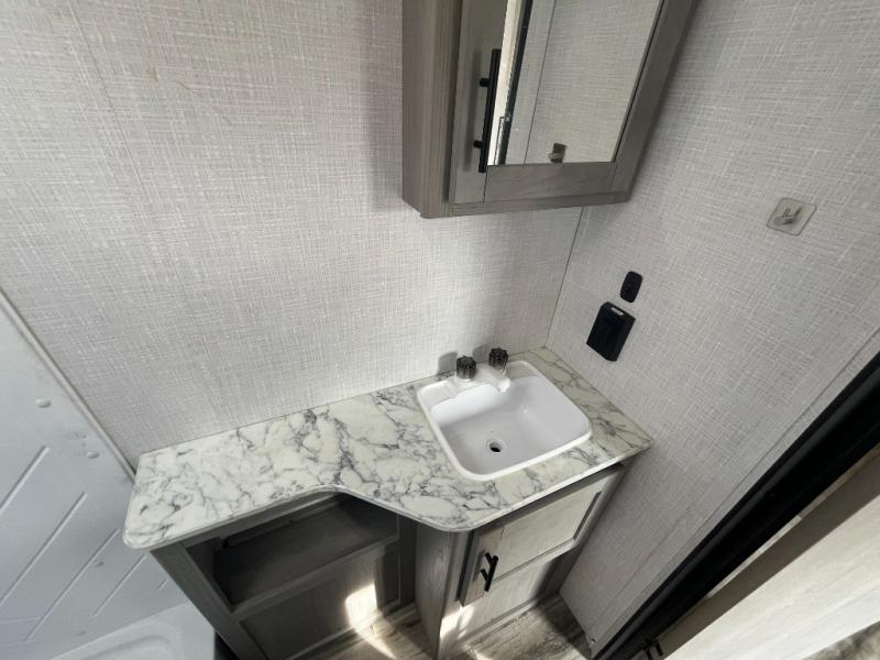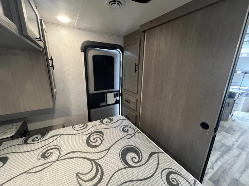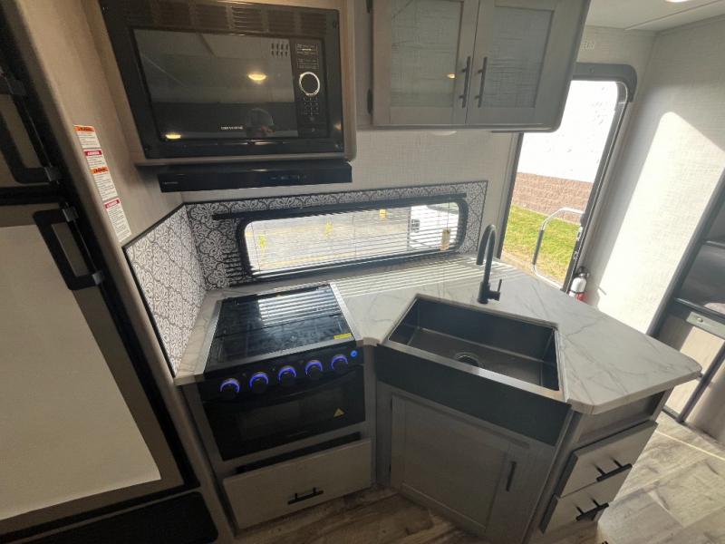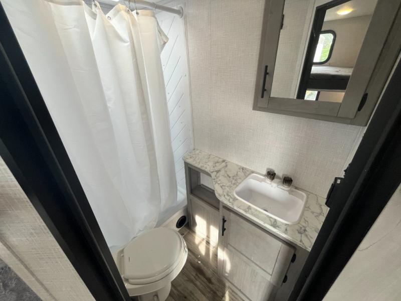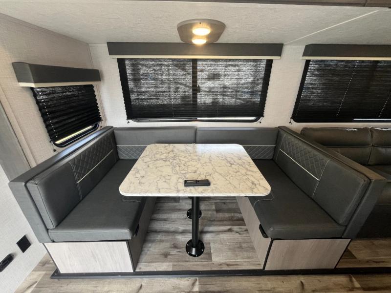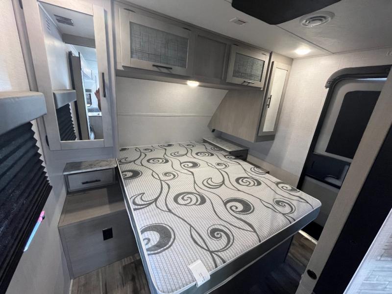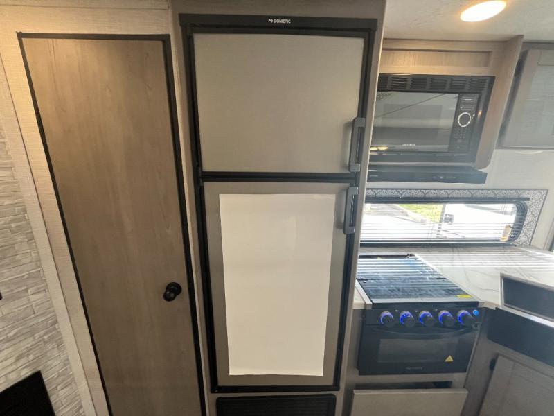 The Dutchmen Coleman Light travel trailer features an upgraded kitchen package with residential appliances, high-rise faucets, and a stainless steel farm-style sink. The fully enclosed underbelly allows all of your trailer's vital functions to be kept out of the freezing cold, and you'll have great stability as you enter your trailer by using the solid entry steps. Each model includes power stabilizer jacks, a power tongue jack, dual 20-LB propane tanks, a residential queen bed, and preparations for Wi-Fi 4G LTE. There is an aerodynamic front fiberglass cap, exterior speakers, solar charging connection, and aluminum wheels.