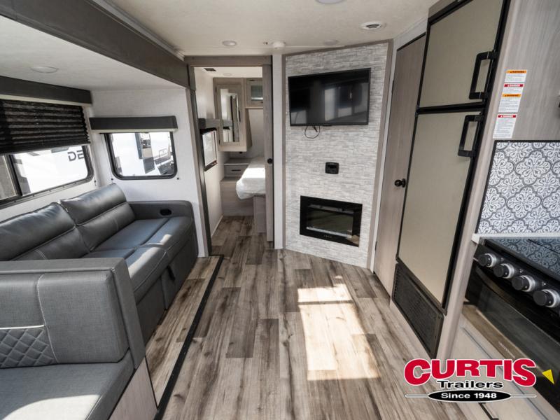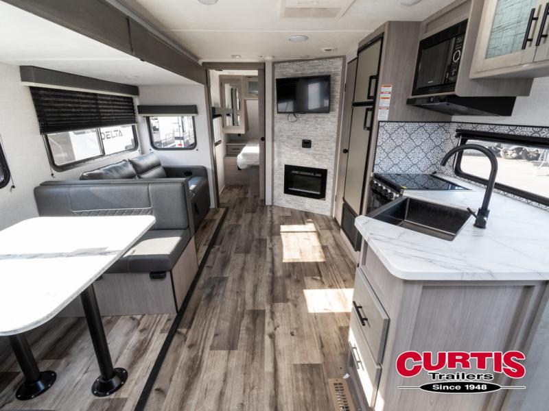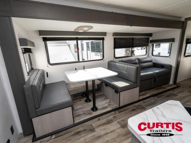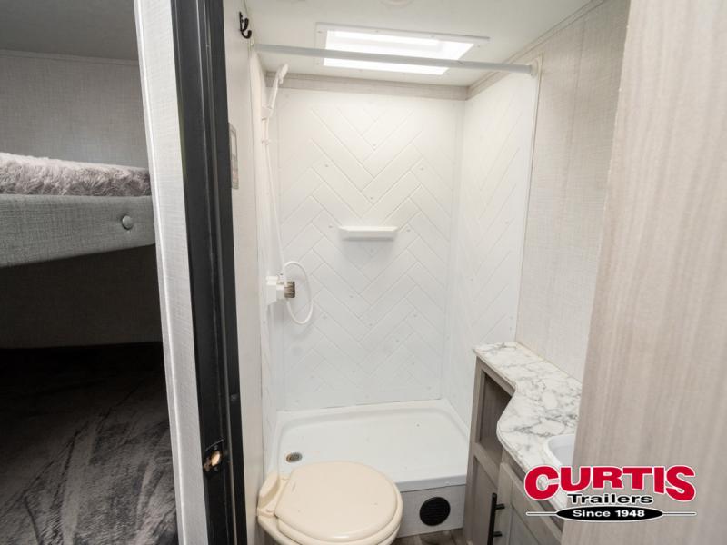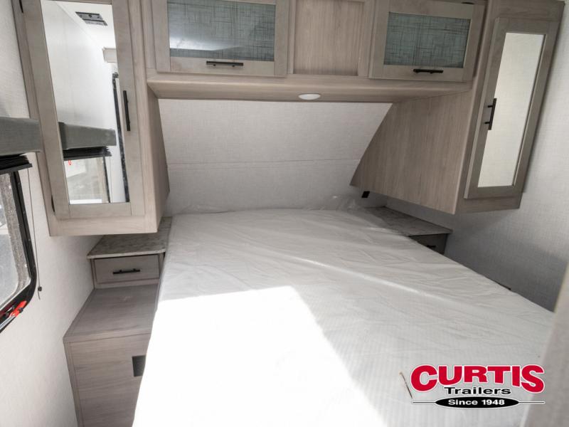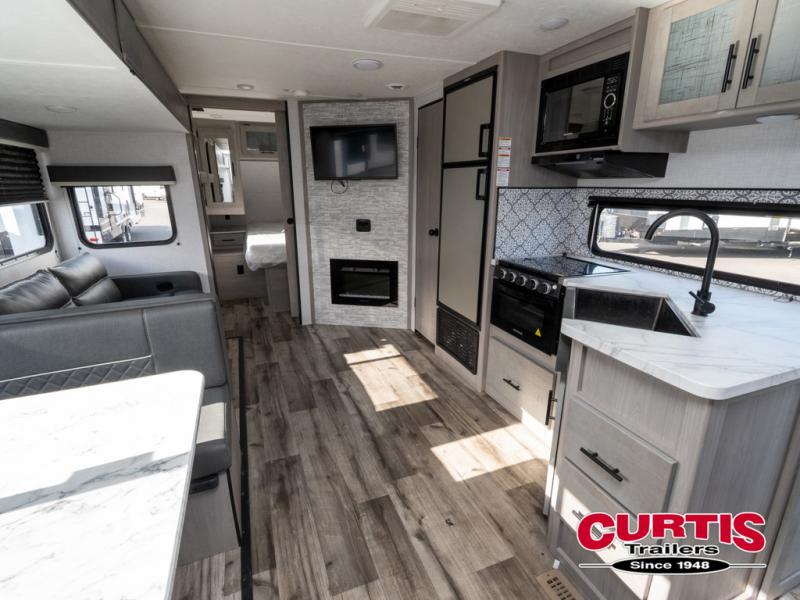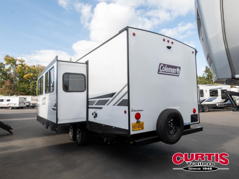 The Dutchmen Coleman Light travel trailer features an upgraded kitchen package with residential appliances, high-rise faucets, and a stainless steel farm-style sink. The fully enclosed underbelly allows all of your trailer's vital functions to be kept out of the freezing cold, and you'll have great stability as you enter your trailer by using the solid entry steps. Each model includes power stabilizer jacks, a power tongue jack, dual 20-LB propane tanks, a residential queen bed, and preparations for Wi-Fi 4G LTE. There is an aerodynamic front fiberglass cap, exterior speakers, solar charging connection, and aluminum wheels.