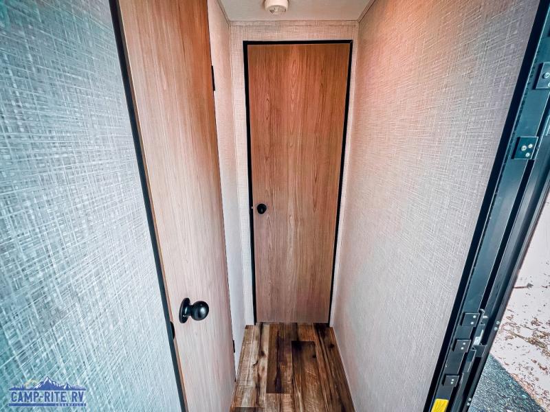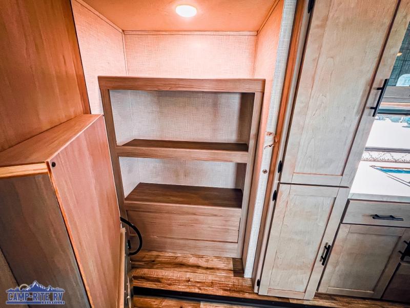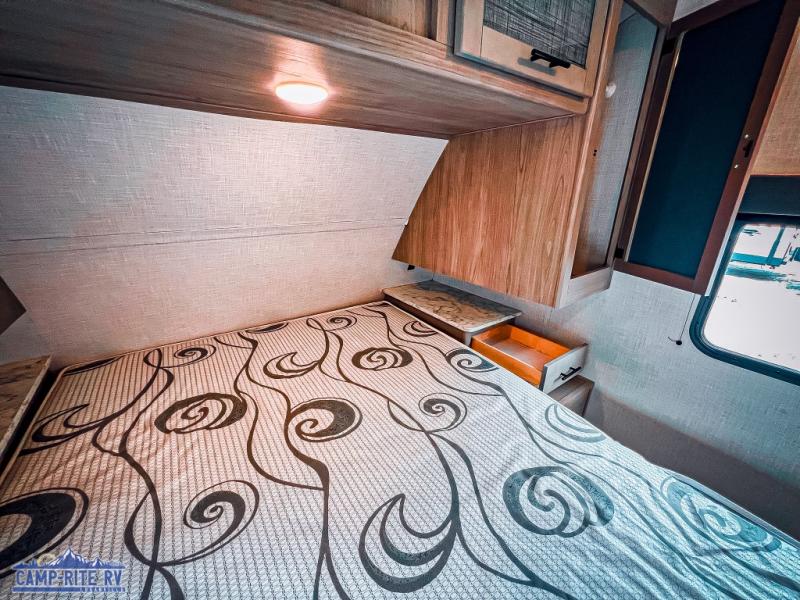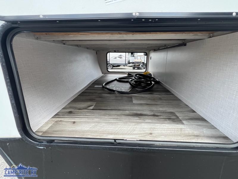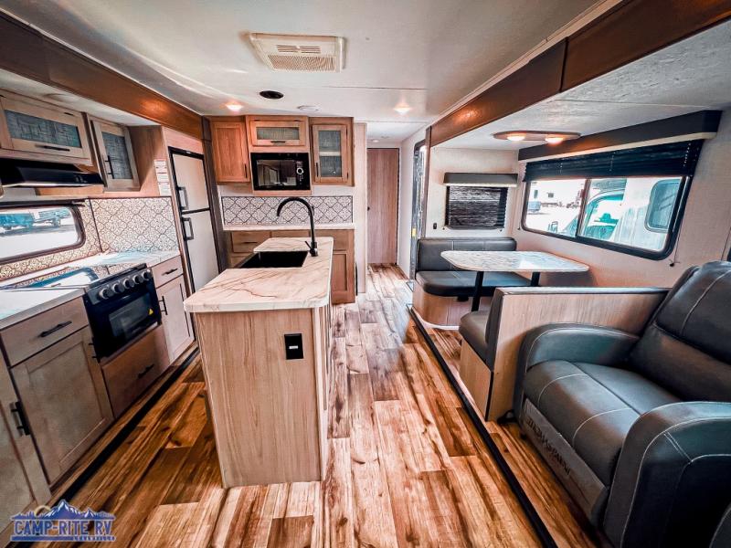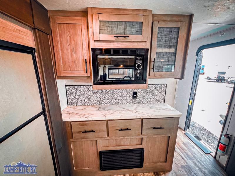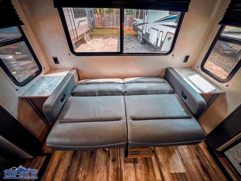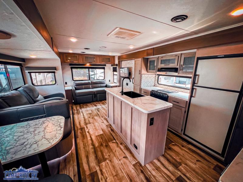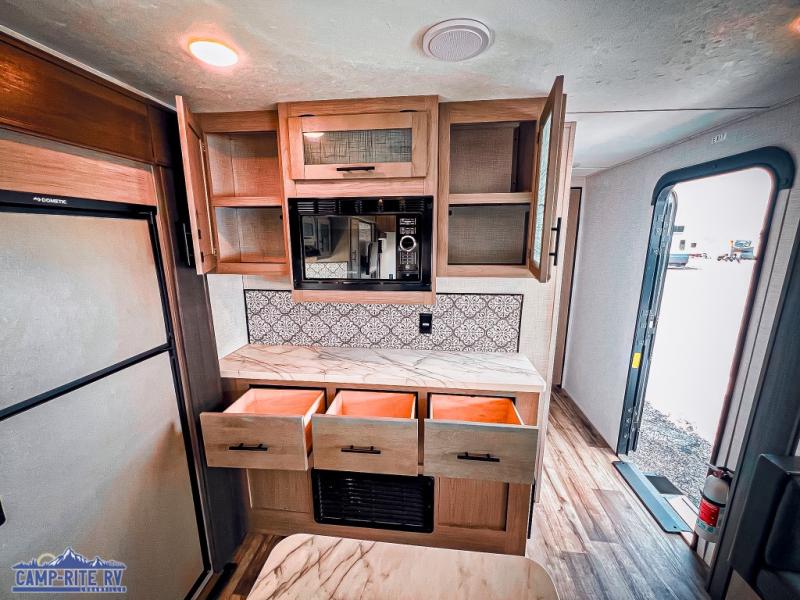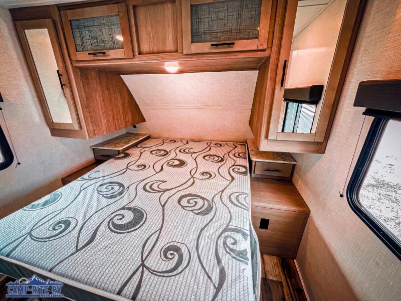 The Dutchmen Coleman Light travel trailer features an upgraded kitchen package with residential appliances, high-rise faucets, and a stainless steel farm-style sink. The fully enclosed underbelly allows all of your trailer's vital functions to be kept out of the freezing cold, and you'll have great stability as you enter your trailer by using the solid entry steps. Each model includes power stabilizer jacks, a power tongue jack, dual 20-LB propane tanks, a residential queen bed, and preparations for Wi-Fi 4G LTE. There is an aerodynamic front fiberglass cap, exterior speakers, solar charging connection, and aluminum wheels.