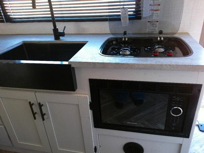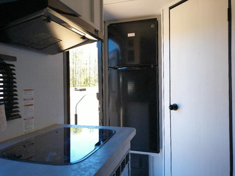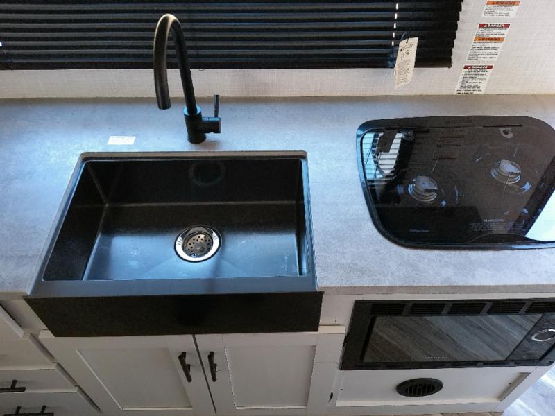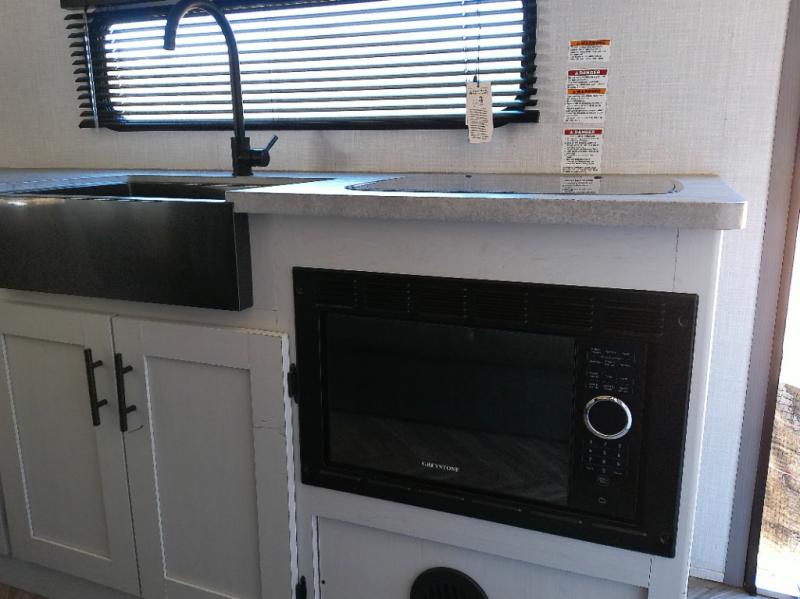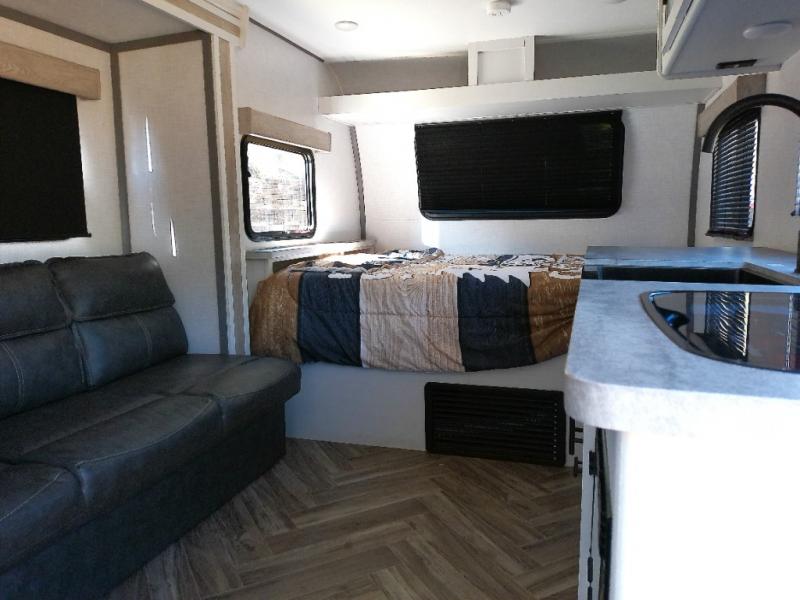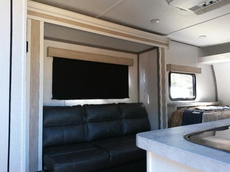This travel trailer is perfect for two people looking to escape the hustle and bustle of everyday life! The front queen bed welcomes you to enjoy a good night's rest each night so you can feel refreshed every morning. After you have fried up some eggs with the two burner range, you can head to the sofa slide and enjoy it there with the indoor/outdoor table or take the table outside to have breakfast outdoors under the 12' power awning. The rear corner bathroom has a radius shower with a skylight above for natural lighting as you get ready each morning!