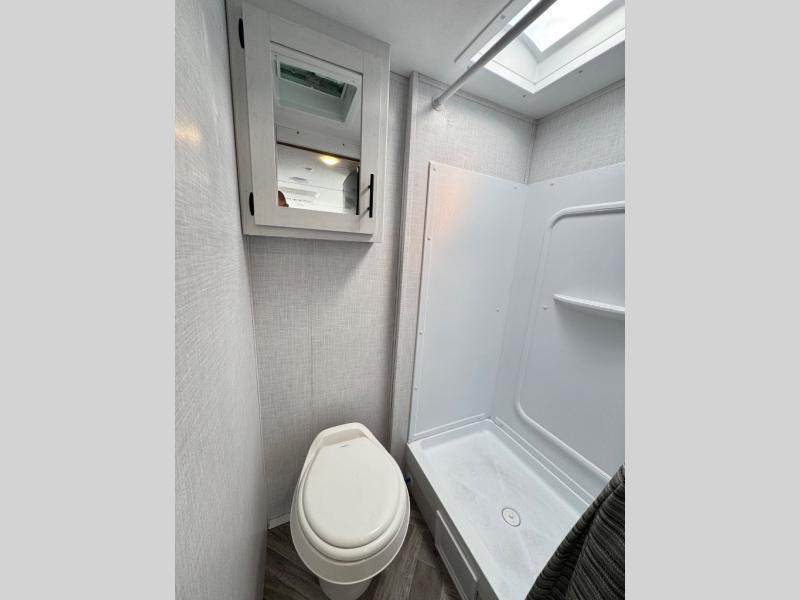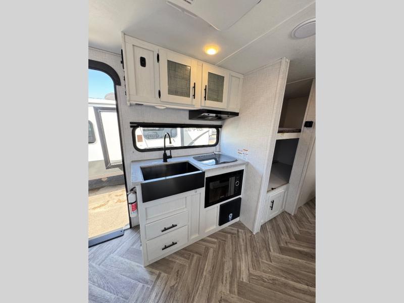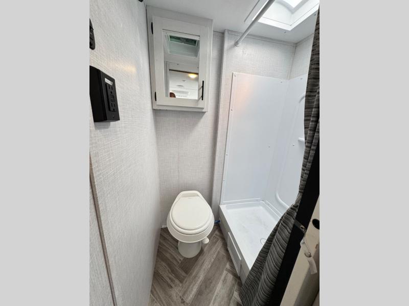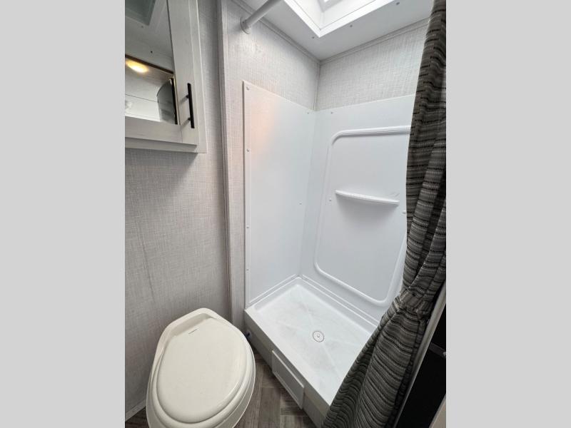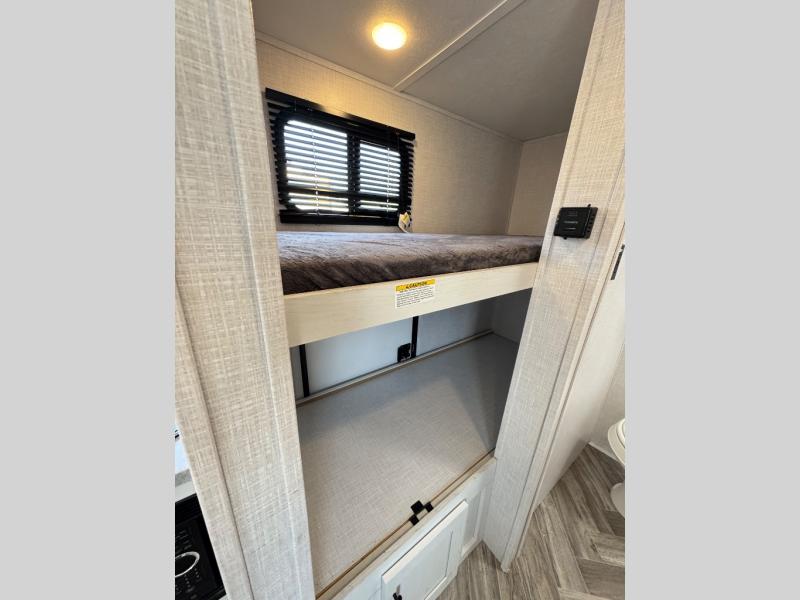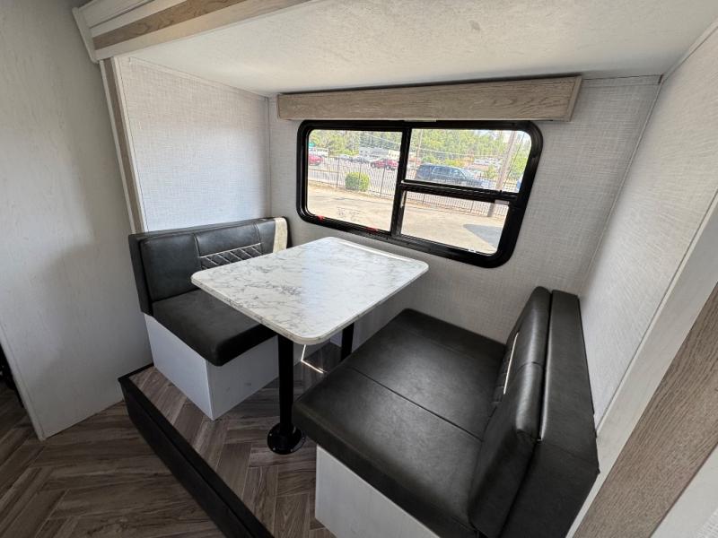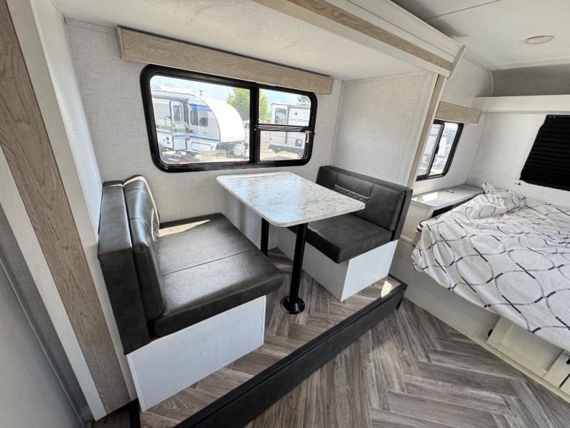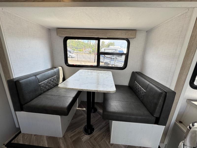With a set of bunk beds, the whole family or friend gang can camp together in this travel trailer! And you will appreciate having a front queen bed to lay your head on at night. The two burner range is just waiting for you to prepare a delicious meal and the booth dinette is a great place to enjoy it at, plus it can be used as an extra sleeping space. The rear corner bathroom has a shower with a skylight above for added natural lighting as you get ready each morning!