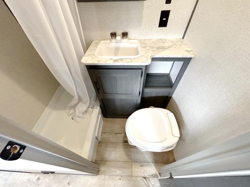 Get ready for camping fun that could include making s'mores, hiking the trails, or whipping up a special meal for everyone! The cozy mornings will begin with your queen bed while the other campers are sleeping on the booth dinette and sofa. The cook will soon have breakfast made using the kitchen amenities while some can take turns getting ready for the day in the full bathroom. You can dine inside once you easily set up the dinette for mealtime or outside under the 16' power awning. Now it's time to take the hike, and grab your fishing poles from the exterior pass-through storage!