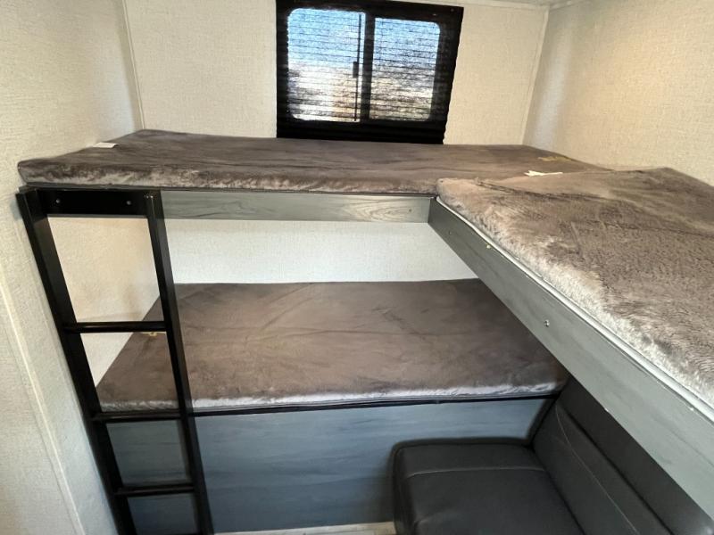 Invite your best friends to join you and your family on your next camping trip in this Colorado travel trailer! You will be able to offer them a private bunkhouse with triple bunks and seating that doubles as sleeping space and/or the living room furniture to sleep on. Your oasis will be in the front which includes your own residential queen bed and plenty of storage for your clothes and things. The central living area offers seating, dining and cooking amenities, plus a full bathroom which is super convenient, and you can make several meals using the outside kitchen while others relax under the 16' power awning with LED light for nighttime hangouts.