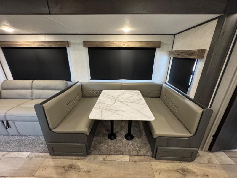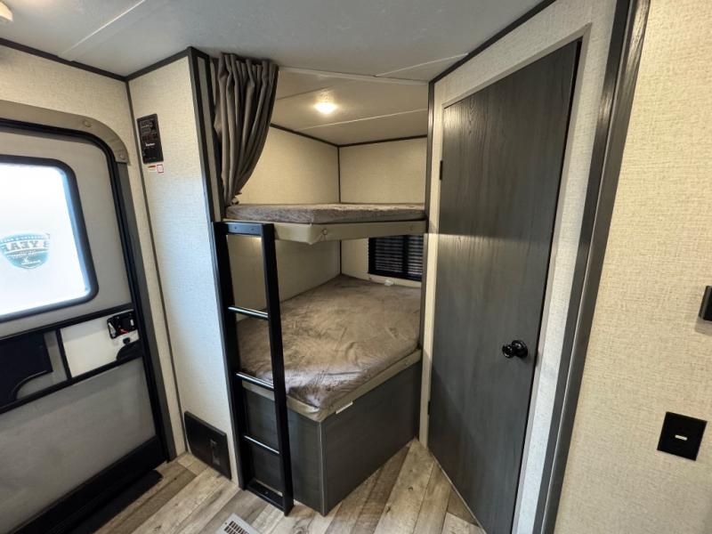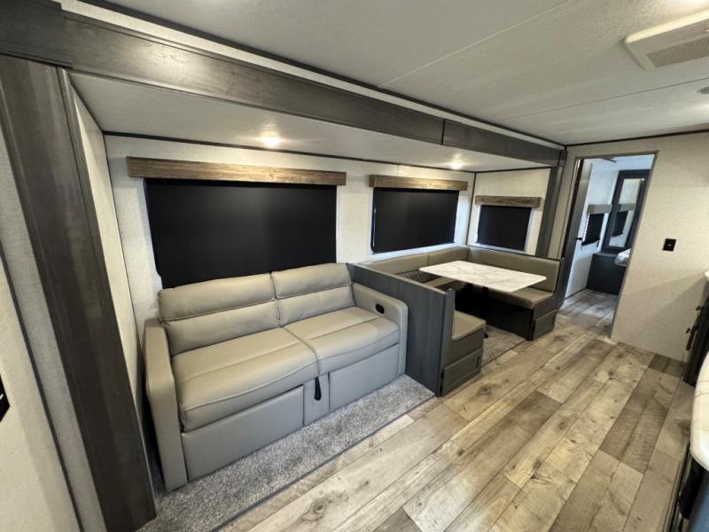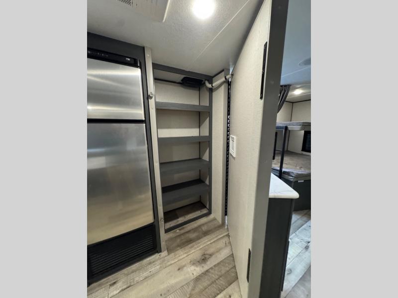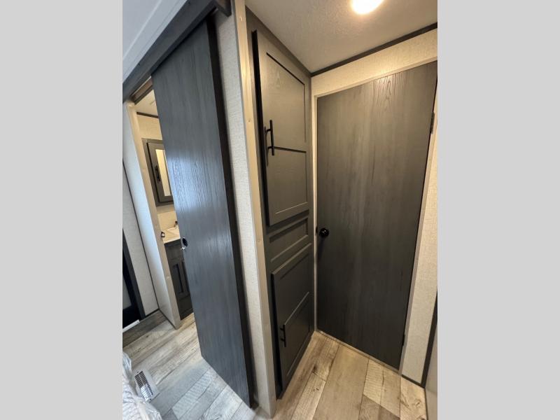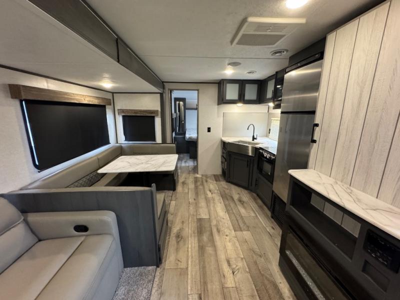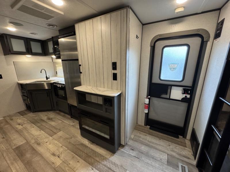 When you camp, you don't have to leave comforts of home behind when you have this travel trailer! You can sleep like a queen in the front master suite while your family and friends sleep on the U-shaped dinette and sofa, plus the double-size bunk beds next to the full bathroom. And there is plenty of bathroom space with a half bathroom included in the master suite, and a full bathroom. You'll have extra interior living space with a large slide, and this allows you to relax comfortably as you enjoy the fireplace and hinged entertainment center. There is even a pantry hidden behind the entertainment center too. Another great convenience that this trailer offers you is the set of two entry doors. One of the doors leads directly into the front bedroom which is super handy for the owners of this trailer.