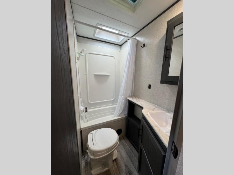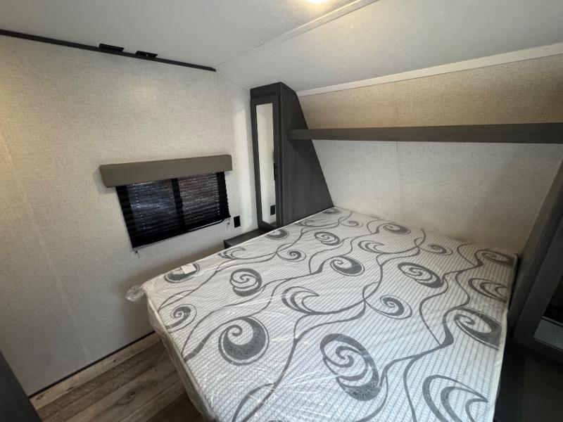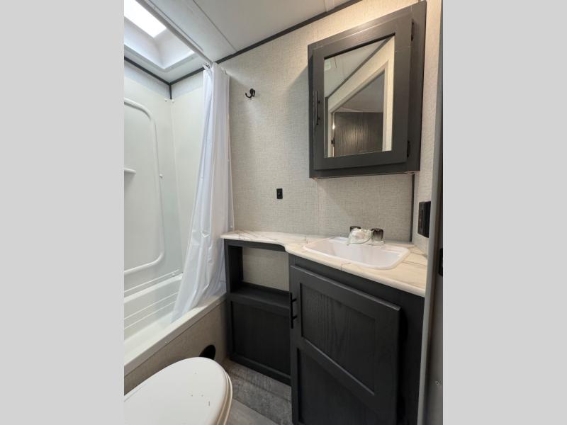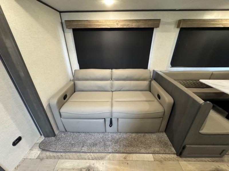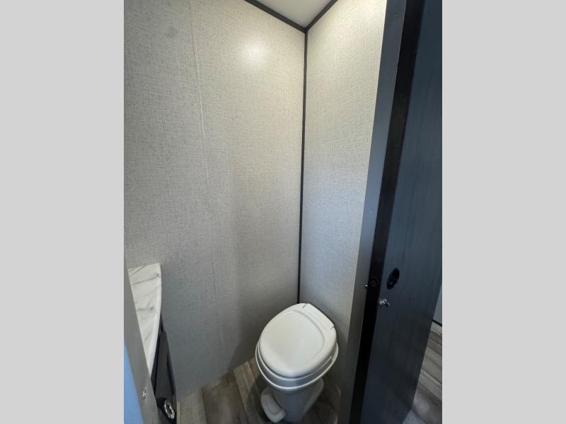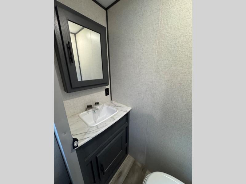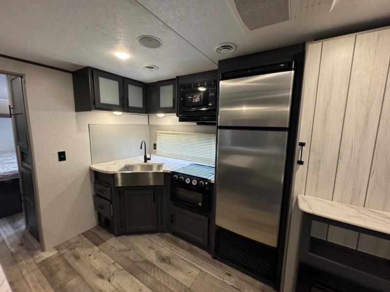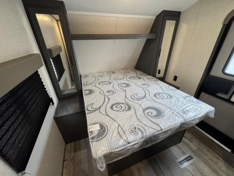 When you camp, you don't have to leave comforts of home behind when you have this travel trailer! You can sleep like a queen in the front master suite while your family and friends sleep on the U-shaped dinette and sofa, plus the double-size bunk beds next to the full bathroom. And there is plenty of bathroom space with a half bathroom included in the master suite, and a full bathroom. You'll have extra interior living space with a large slide, and this allows you to relax comfortably as you enjoy the fireplace and hinged entertainment center. There is even a pantry hidden behind the entertainment center too. Another great convenience that this trailer offers you is the set of two entry doors. One of the doors leads directly into the front bedroom which is super handy for the owners of this trailer.