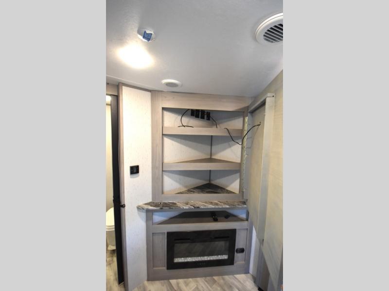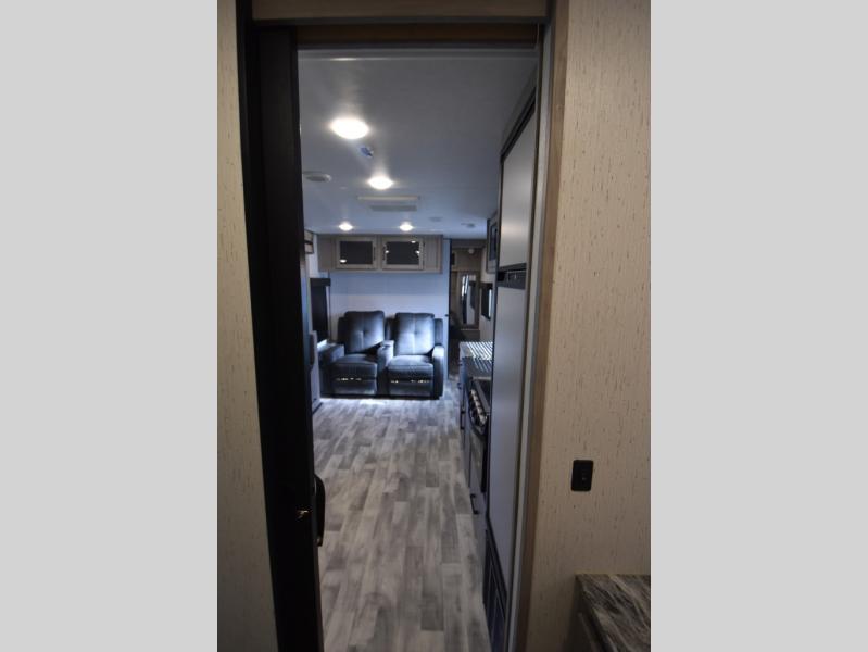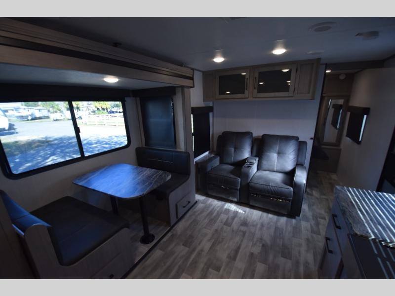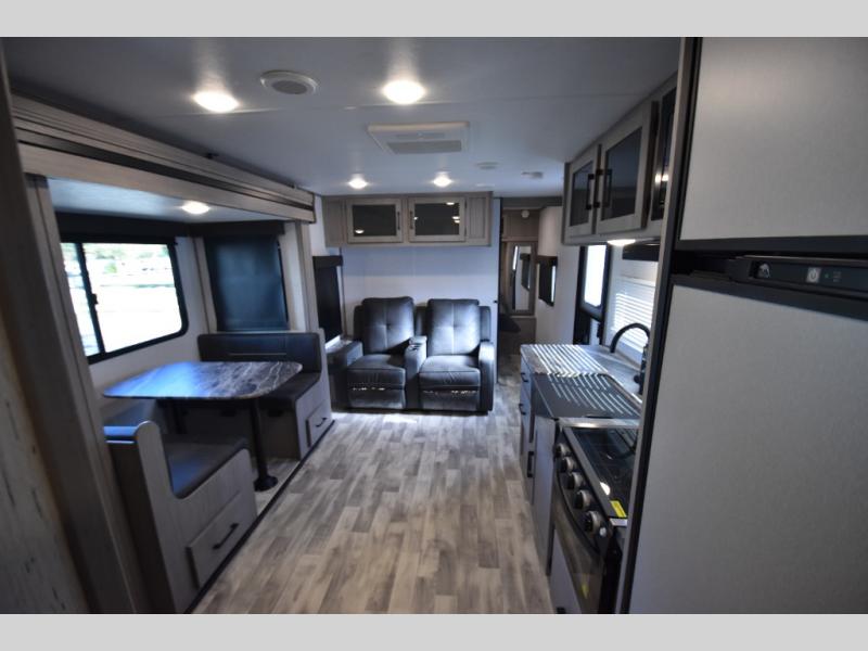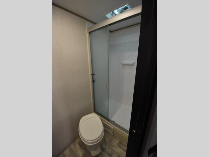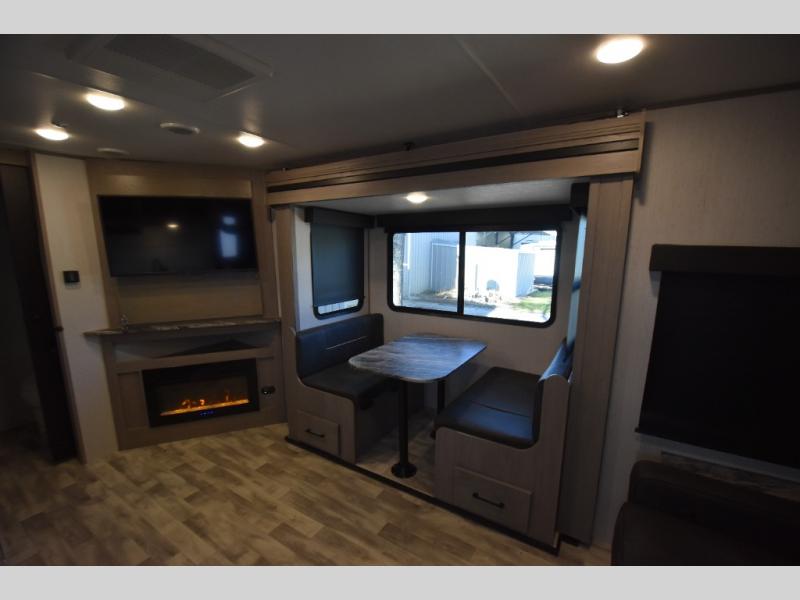 This model features a rear bath design, offering a spacious and private bathroom with a large shower, vanity, and storage for all your essentials. The open living space includes a comfortable theater seating arrangement and a versatile dinette, making it ideal for both relaxation and entertaining.