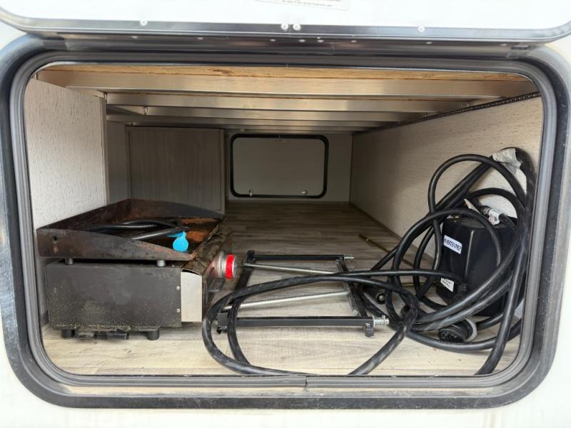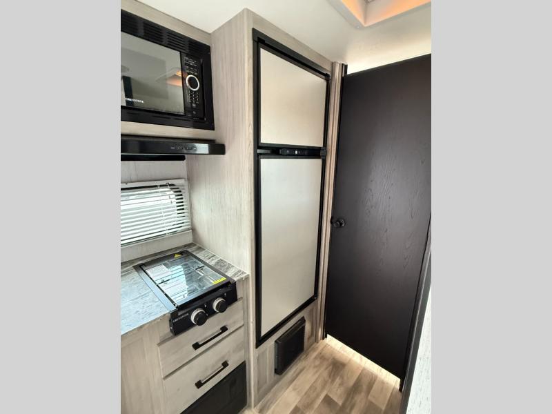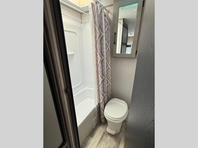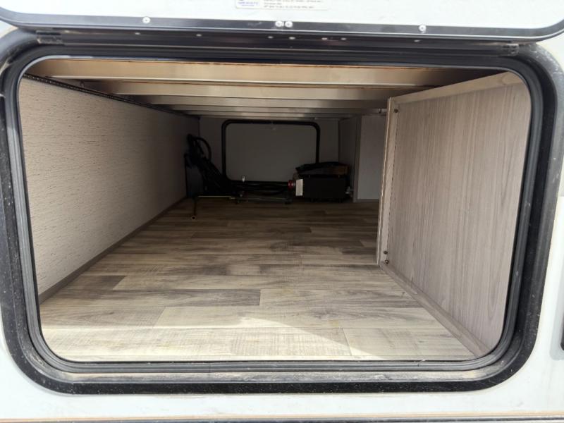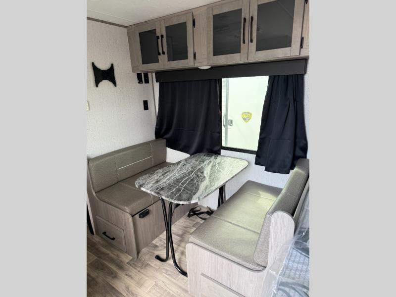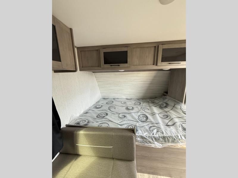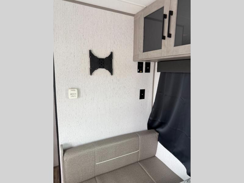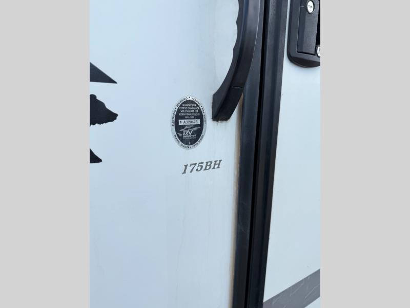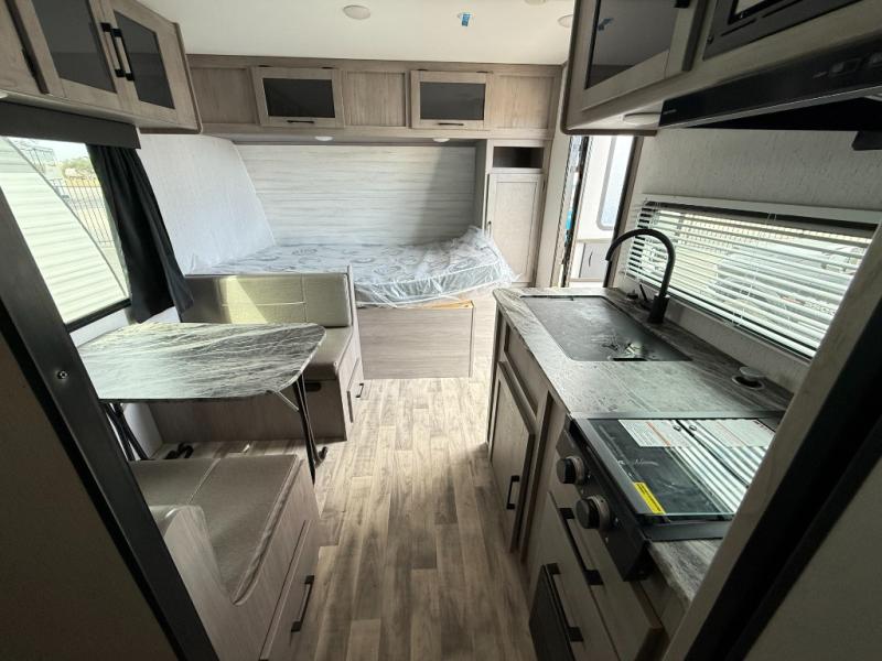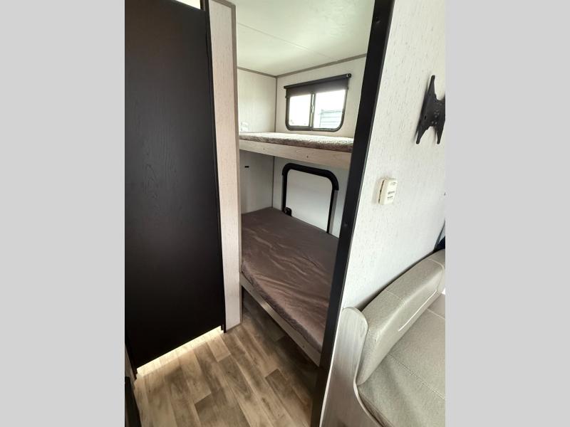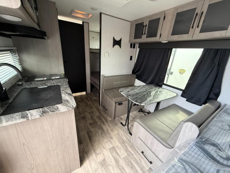 The whole gang will enjoy camping in this travel trailer! The kiddos or guests can sleep on the set of bunk beds and you can sleep on the front queen bed. After you prepare your best home cooked meals with the two burner range with a glass cover, you can head to the booth dinette to eat it. The booth dinette has an indoor/outdoor table for added versatility. Everyone will stay clean and fresh in the rear corner bathroom and the skylight above the shower will provide extra natural lighting as you get ready in the mornings. The exterior pass-through storage area is big enough for you to store all of your outdoor gear so you don't need to leave any behind!