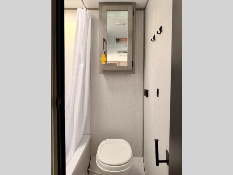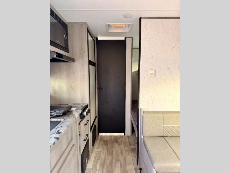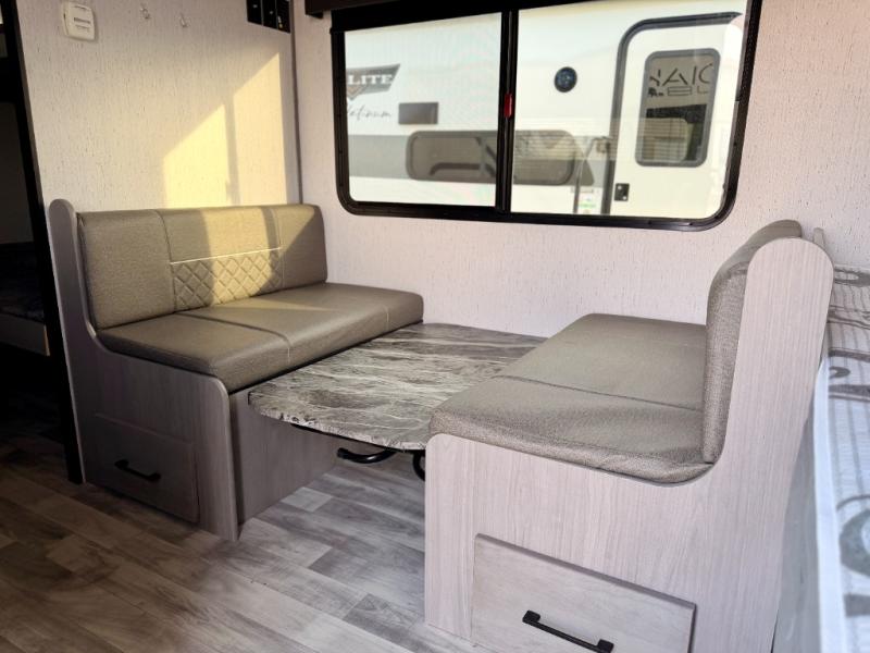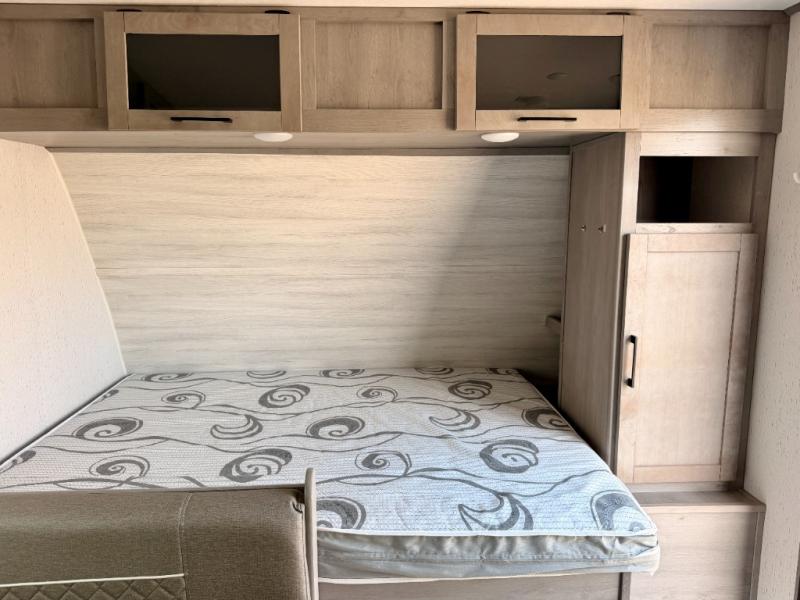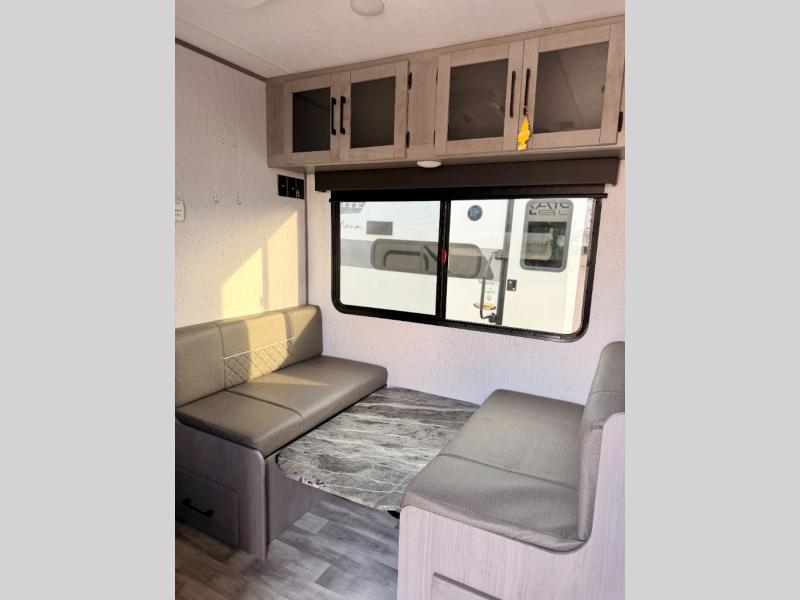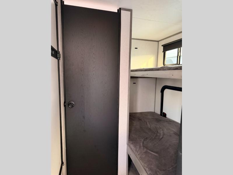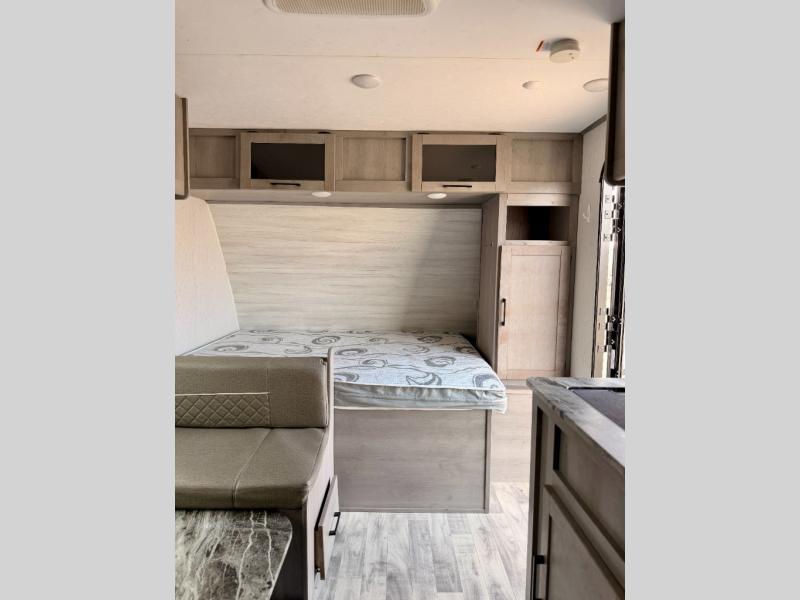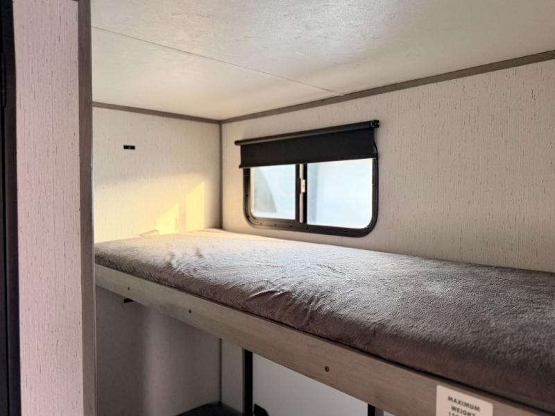 The whole gang will enjoy camping in this travel trailer! The kiddos or guests can sleep on the set of bunk beds and you can sleep on the front queen bed. After you prepare your best home cooked meals with the two burner range with a glass cover, you can head to the booth dinette to eat it. The booth dinette has an indoor/outdoor table for added versatility. Everyone will stay clean and fresh in the rear corner bathroom and the skylight above the shower will provide extra natural lighting as you get ready in the mornings. The exterior pass-through storage area is big enough for you to store all of your outdoor gear so you don't need to leave any behind!