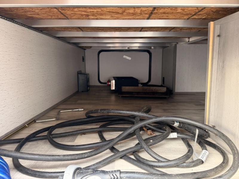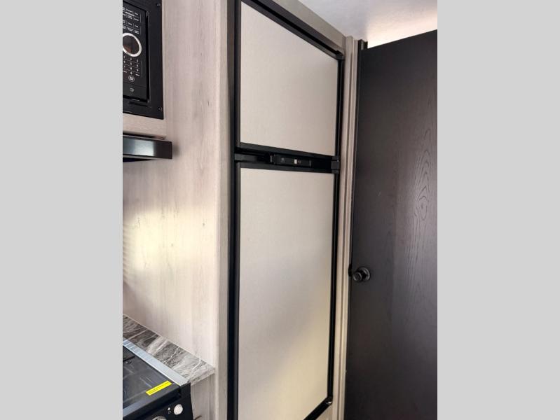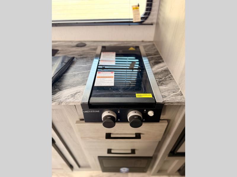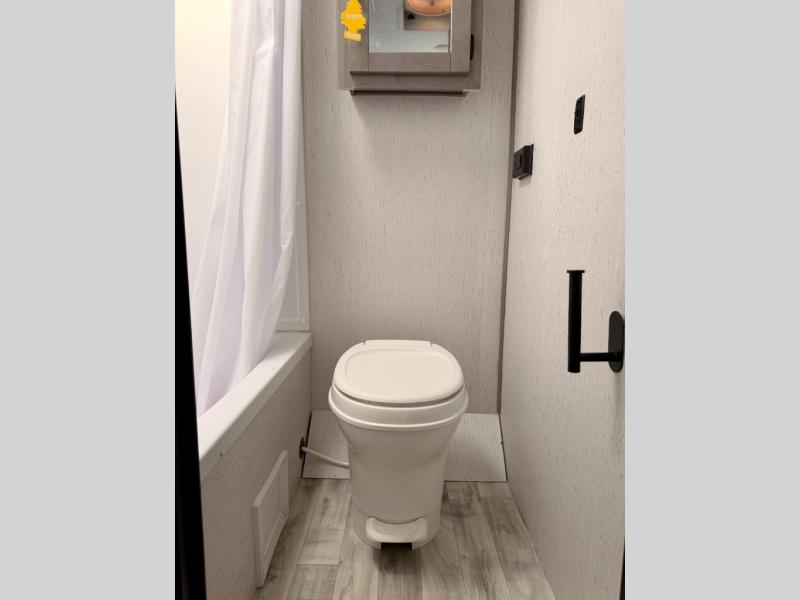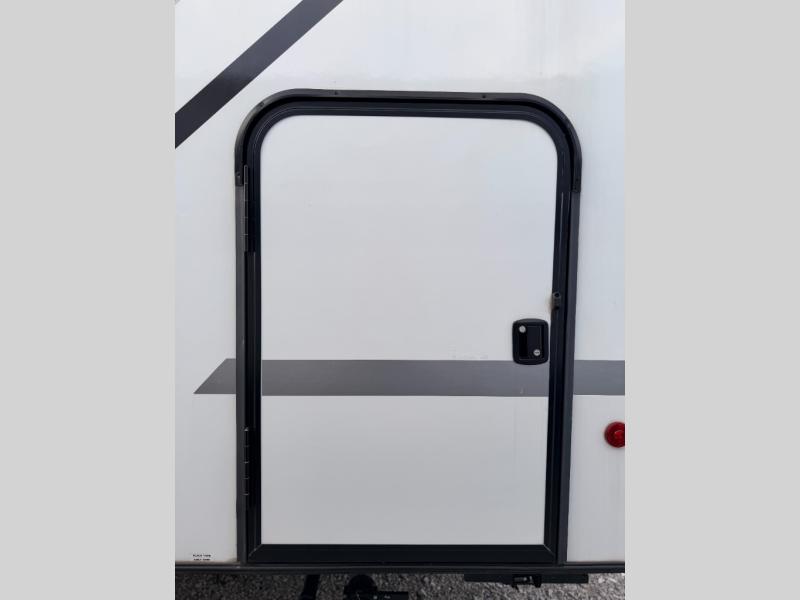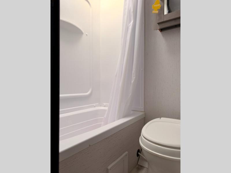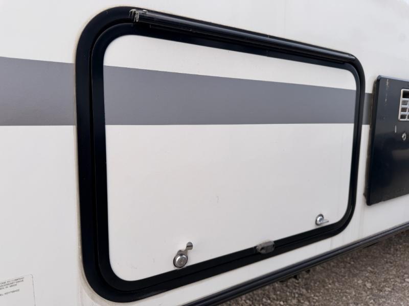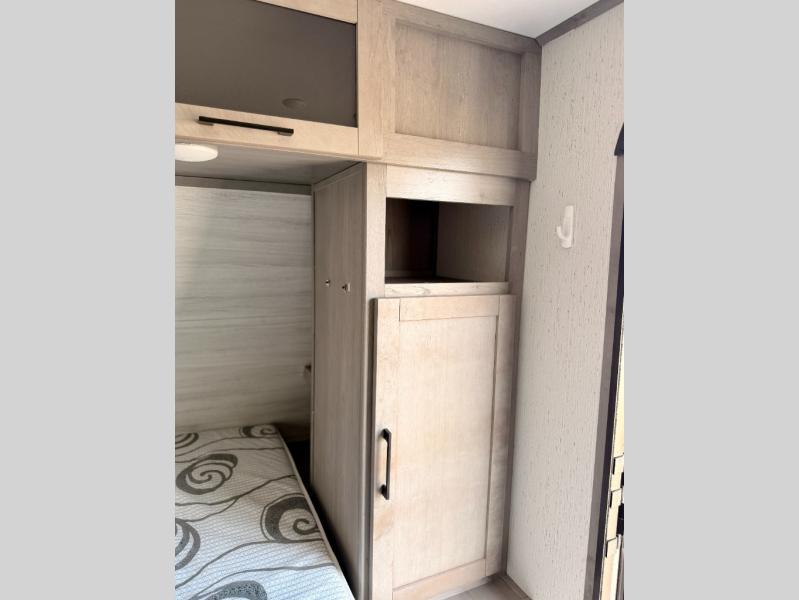 The whole gang will enjoy camping in this travel trailer! The kiddos or guests can sleep on the set of bunk beds and you can sleep on the front queen bed. After you prepare your best home cooked meals with the two burner range with a glass cover, you can head to the booth dinette to eat it. The booth dinette has an indoor/outdoor table for added versatility. Everyone will stay clean and fresh in the rear corner bathroom and the skylight above the shower will provide extra natural lighting as you get ready in the mornings. The exterior pass-through storage area is big enough for you to store all of your outdoor gear so you don't need to leave any behind!
