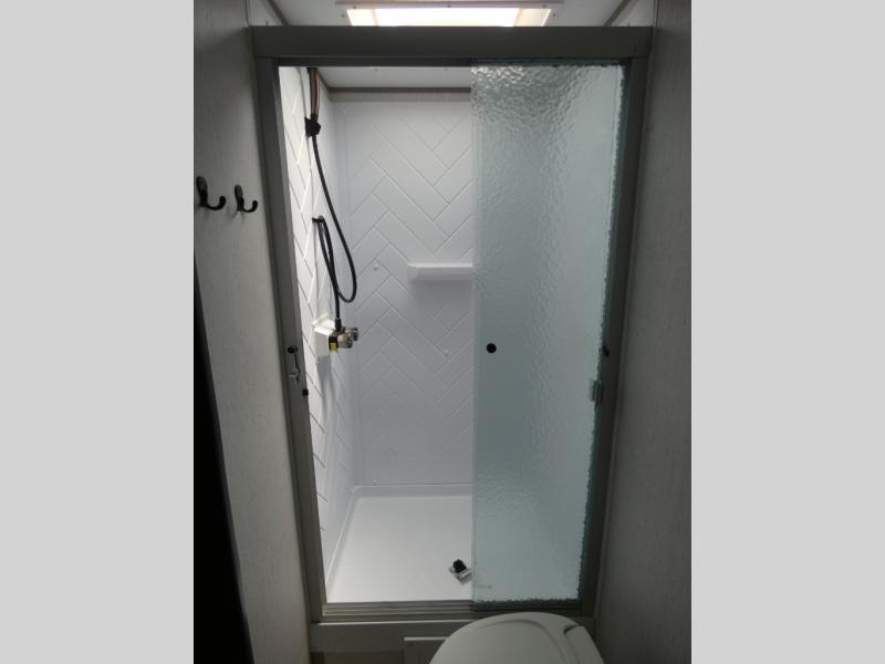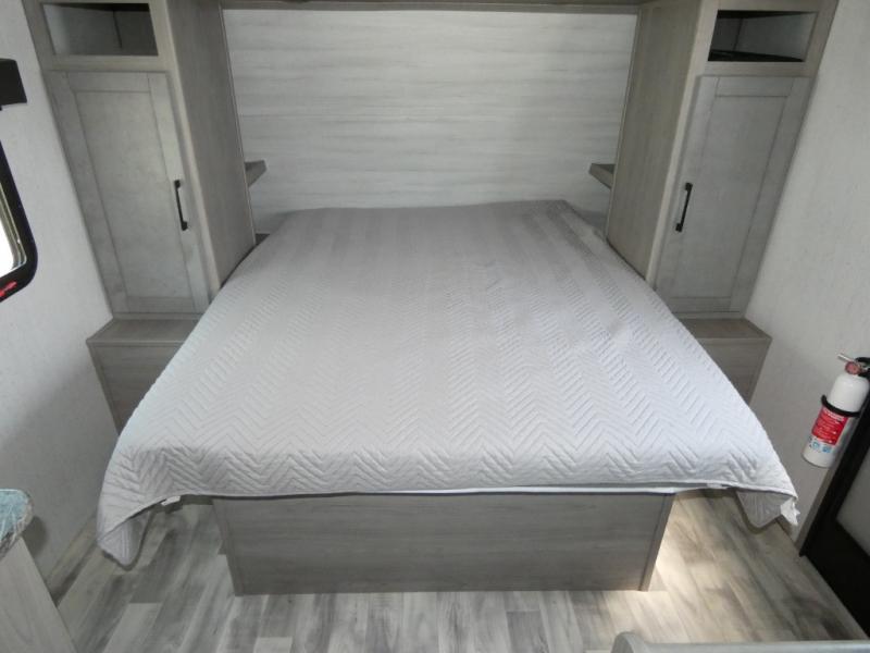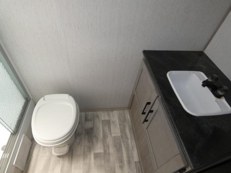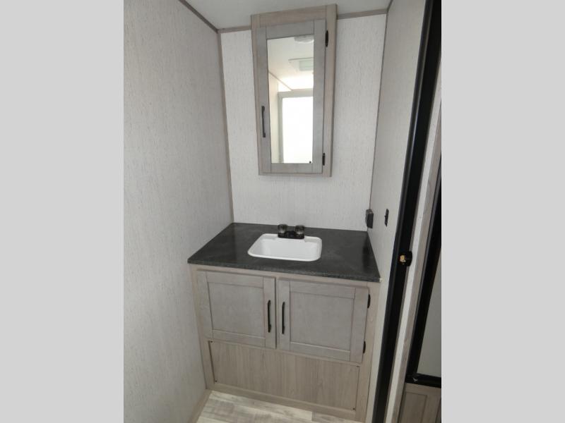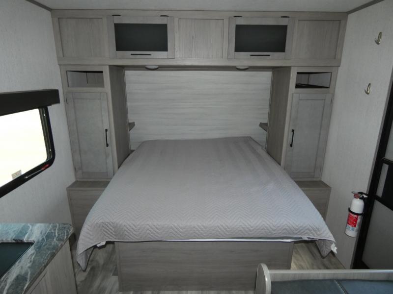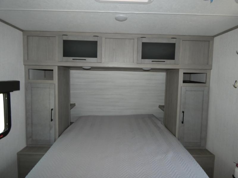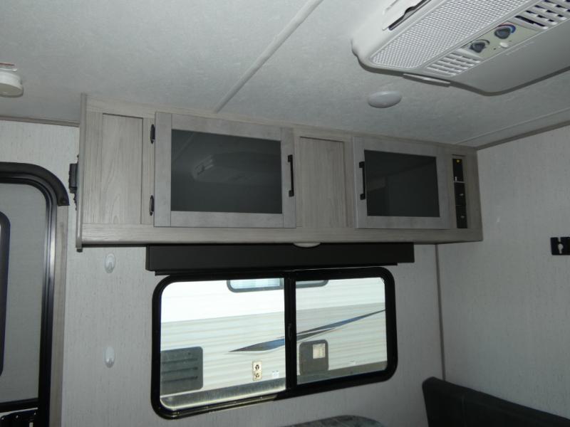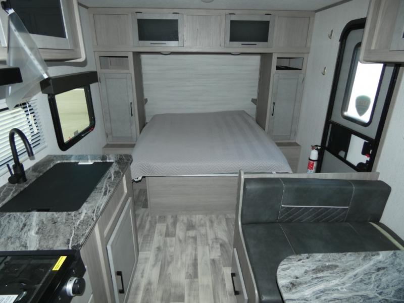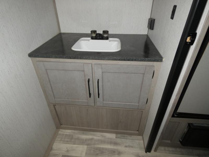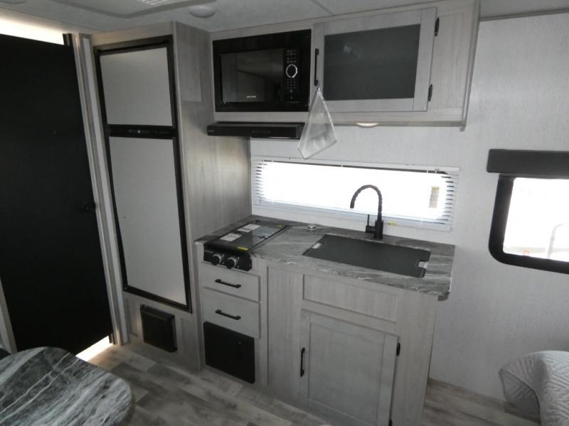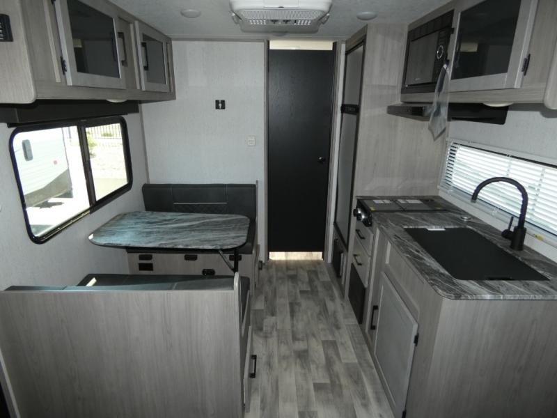 This travel trailer is perfect for two people wishing to escape the hustle and bustle of everyday life! There is a front queen bed with USB ports, nightstands on either side, and wardrobes on either side to keep your clothes looking their best. You can prepare your best meals with the two burner range with a glass cover, keep your orange juice fresh in the 6 cu. ft. stainless steel refrigerator, and enjoy your meals at the booth dinette with an indoor/outdoor table. Freshen up each morning in the full rear bathroom with a skylight above the shower for added natural lighting and a view of the beautiful sky as you clean up!